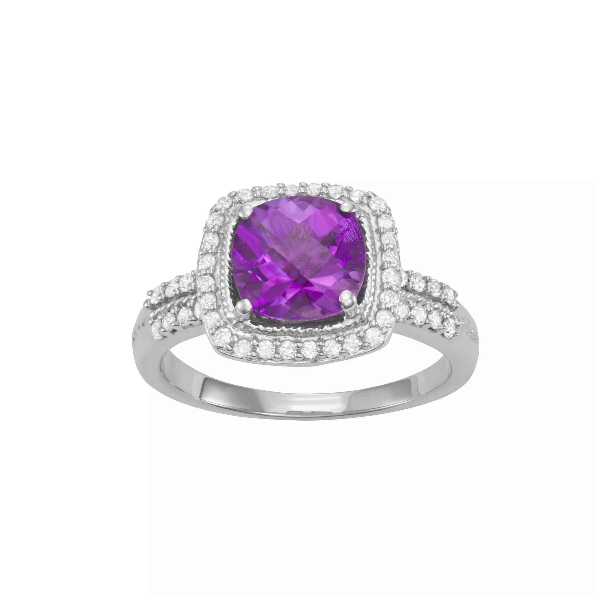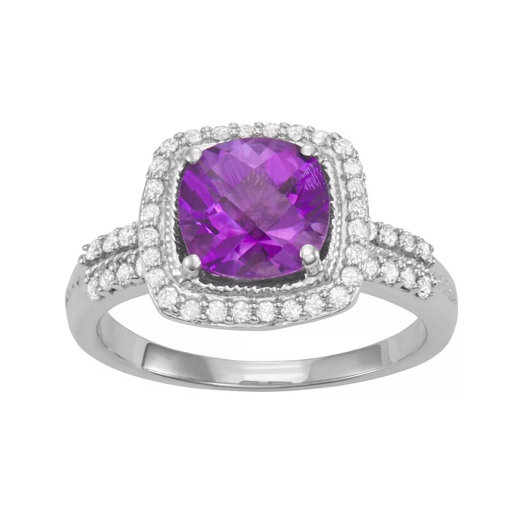 Dazzle them with this HDI amethyst and diamond halo ring. Dazzle them with this HDI amethyst and diamond halo ring. Width: 1.80 mm Nickel free Metal: sterling silver Plating: rhodium Finish: polished Packaging: boxedSTONE DETAILS Stone type: amethyst Total weight: 2 1/2 ct. Center stone size: 8 mm x 8 mm Shape: cushion cut Setting: prongDIAMOND DETAILS Total weight: 1/3 ct. Shape: round Setting: prong Gemstones may have been treated to enhance their appearance. Special care may be required. Please visit our Gemstone Treatment & Special Care Guide for more information. Image(s) may be enlarged to show detail. Please note, due to the high value of this item, a signature may be required upon delivery. Color: White. Gender: female. Age Group: adult.