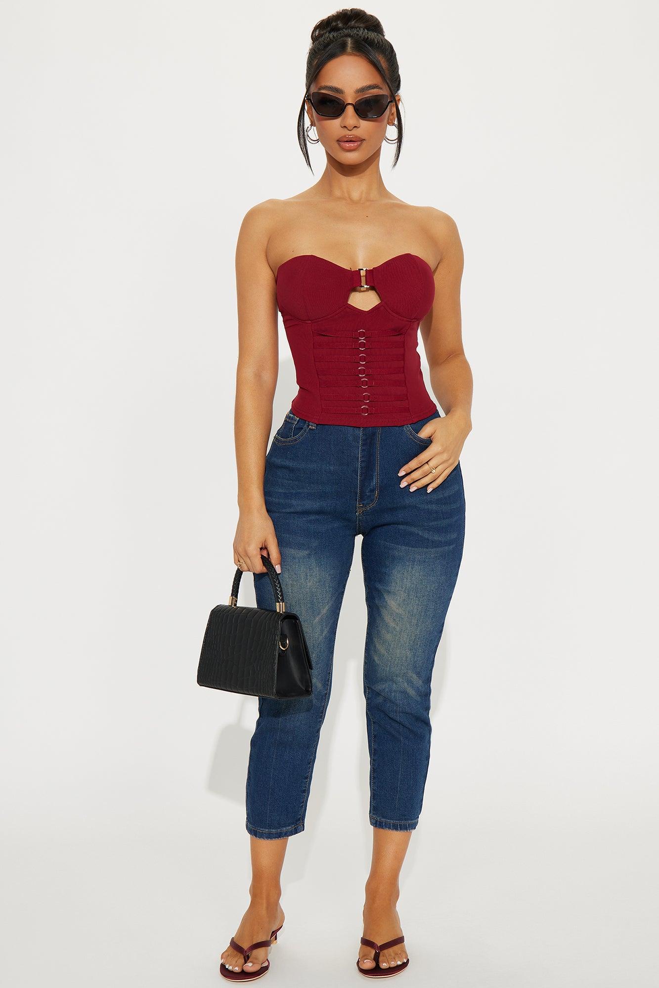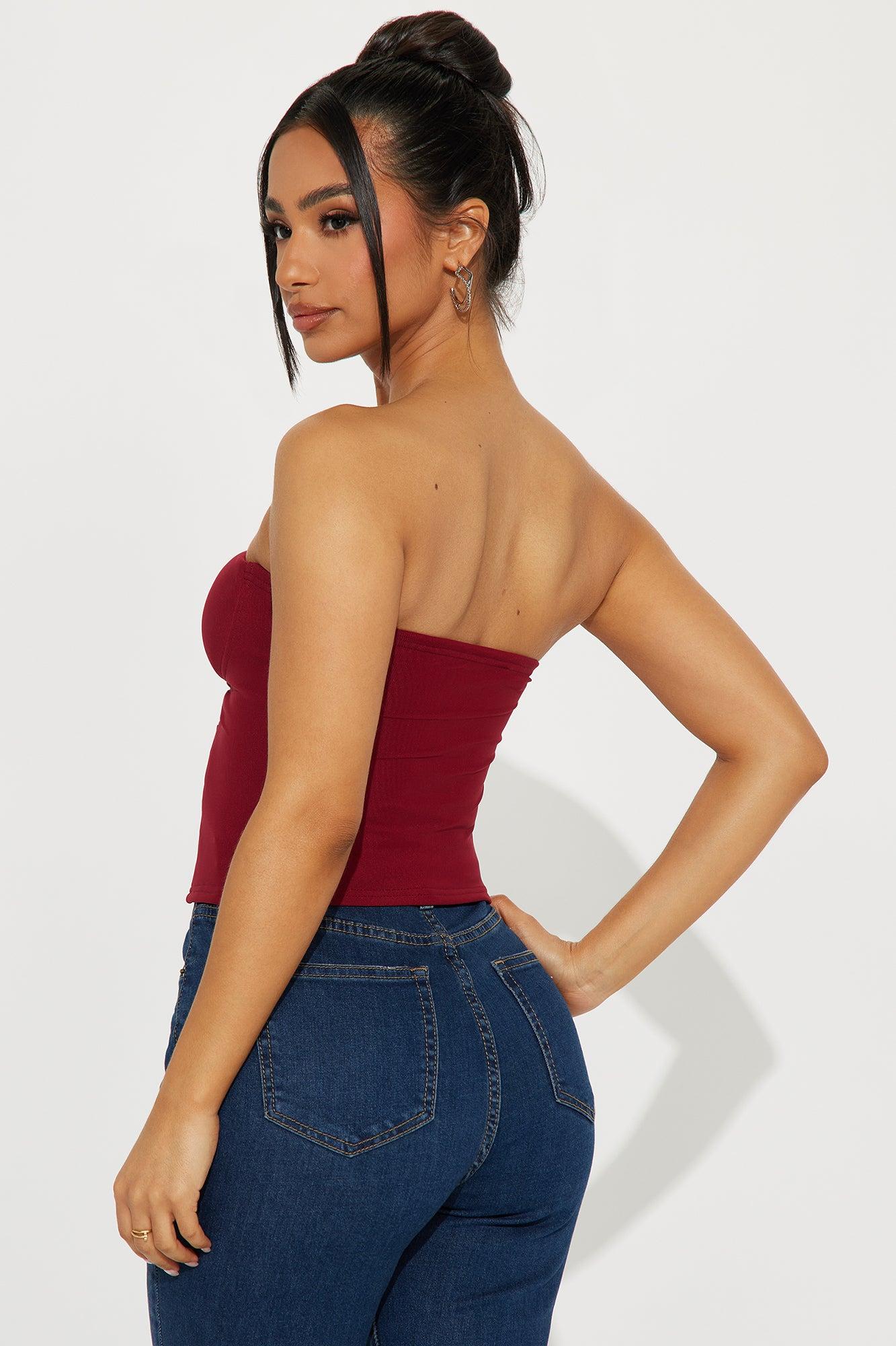 Available In Black And Burgundy. Strapless Top Hardware Detail Cutout Detail Cropped Stretch Self: 95% Polyester 5% Spandex Contrast: 95% Polyester 5% Spandex Lining: 100% Polyester Imported California Proposition 65WARNING: Cancer and Reproductive Harm - www.P65Warnings.ca.gov.