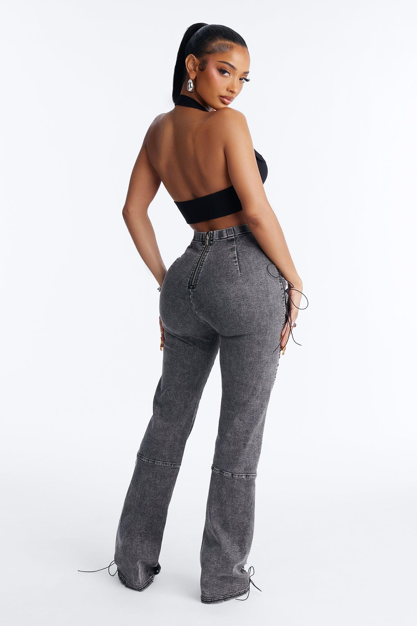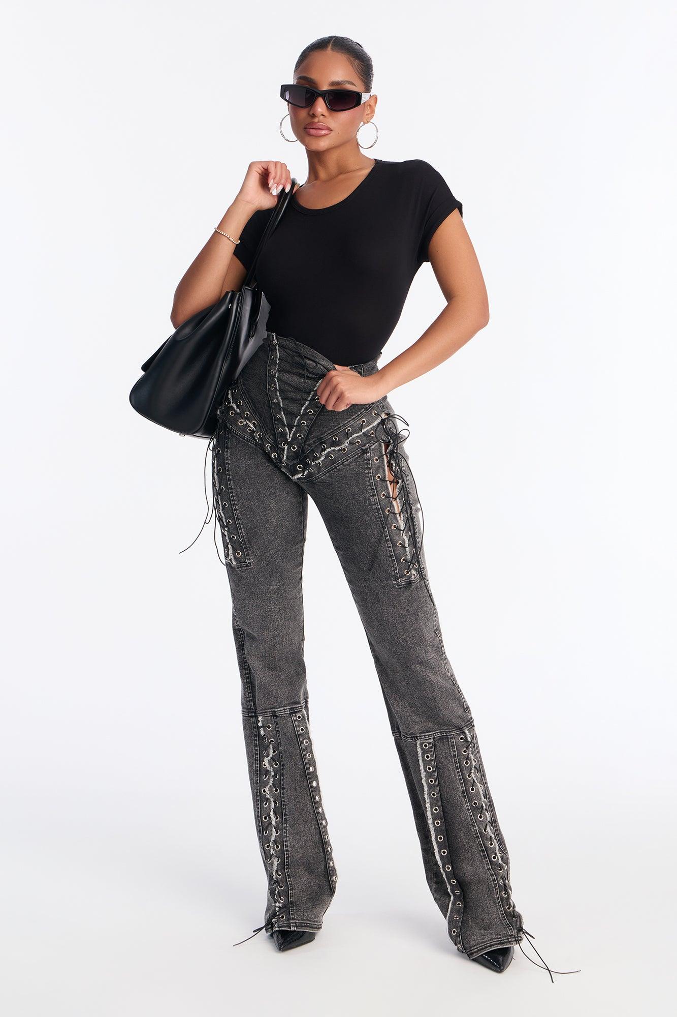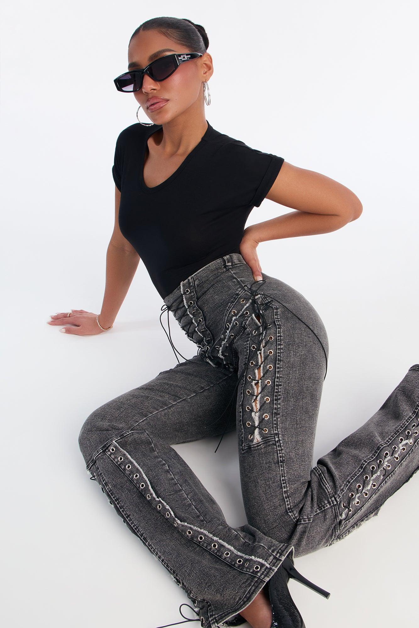 Available In Black Wash. Bootcut Jean No Pockets Lace Up Detail Back Zip Closure 12" Rise 34.5" Inseam Medium Stretch Disclaimer: Due To The Specialized Distressing & Wash Process, Each Garment Is Unique. 75% Cotton 23% Polyester 2% Spandex Imported California Proposition 65WARNING: Cancer and Reproductive Harm - www.P65Warnings.ca.gov.