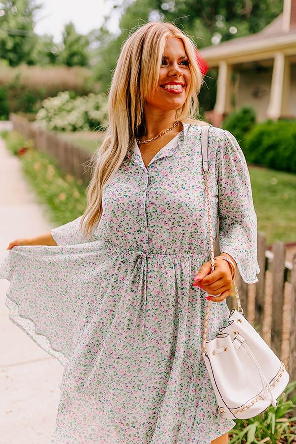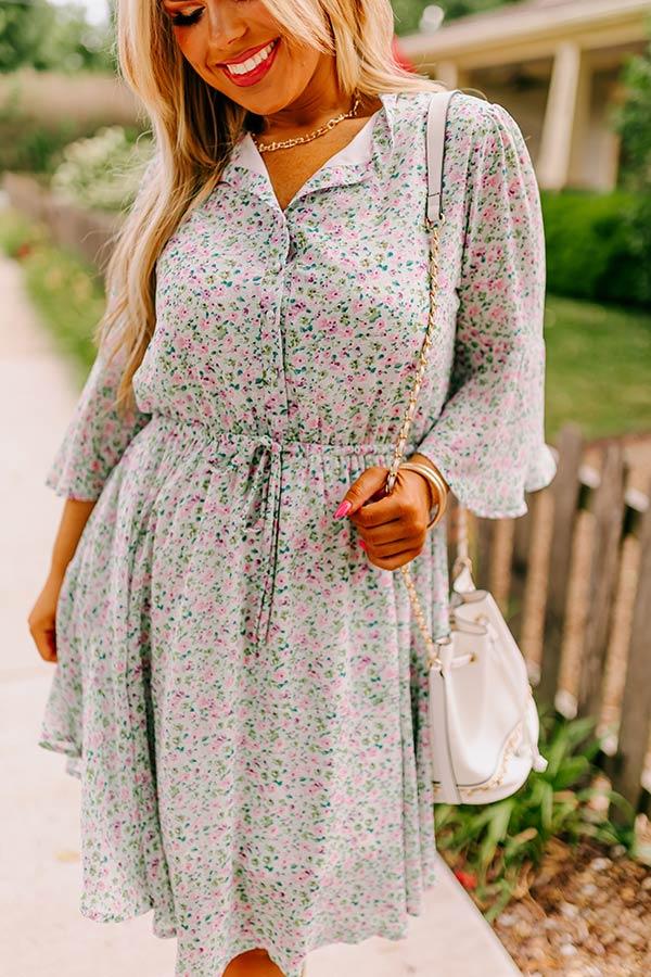 - Make new memories in this darling dress! - Chiffon material with a petite floral print - A built-in partial lining in the bodice and skirt - A v-cut neckline - A button-up bodice - Three-quarter length bell sleeves - An elastic waistline with a functional drawstring for cinching - A flowy yet flattering silhouette that ends in a rounded mid-thigh length hemline