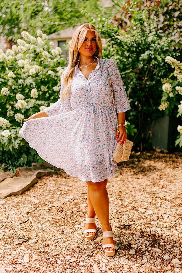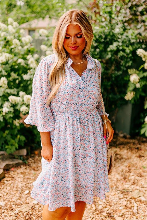 - Make new memories in this darling dress! - Chiffon material with a petite floral print - A built-in partial lining in the bodice and skirt - A v-cut neckline - A button-up bodice - Three-quarter length bell sleeves - An elastic waistline with a functional drawstring for cinching - A flowy yet flattering silhouette that ends in a rounded mid-thigh length hemline