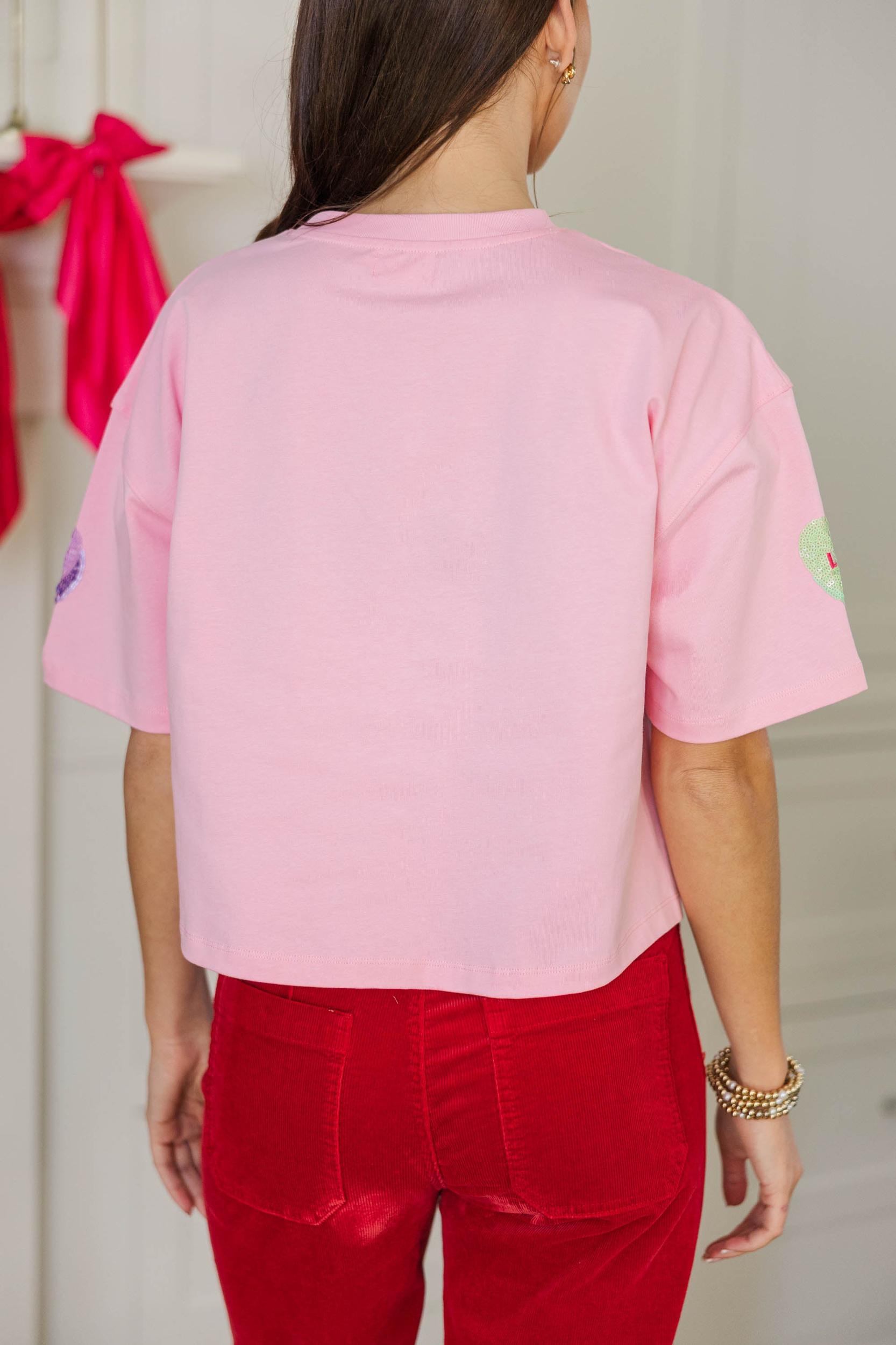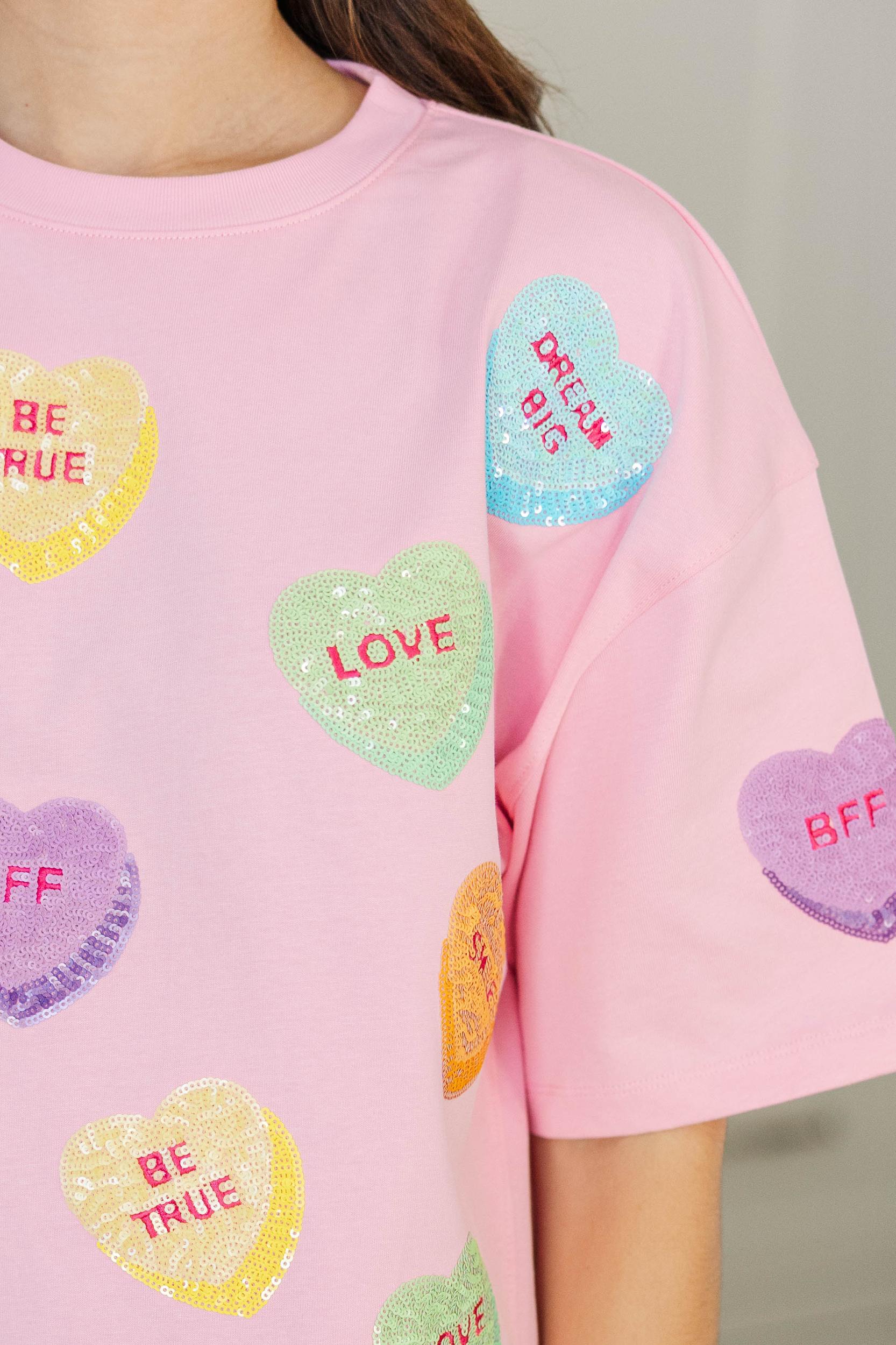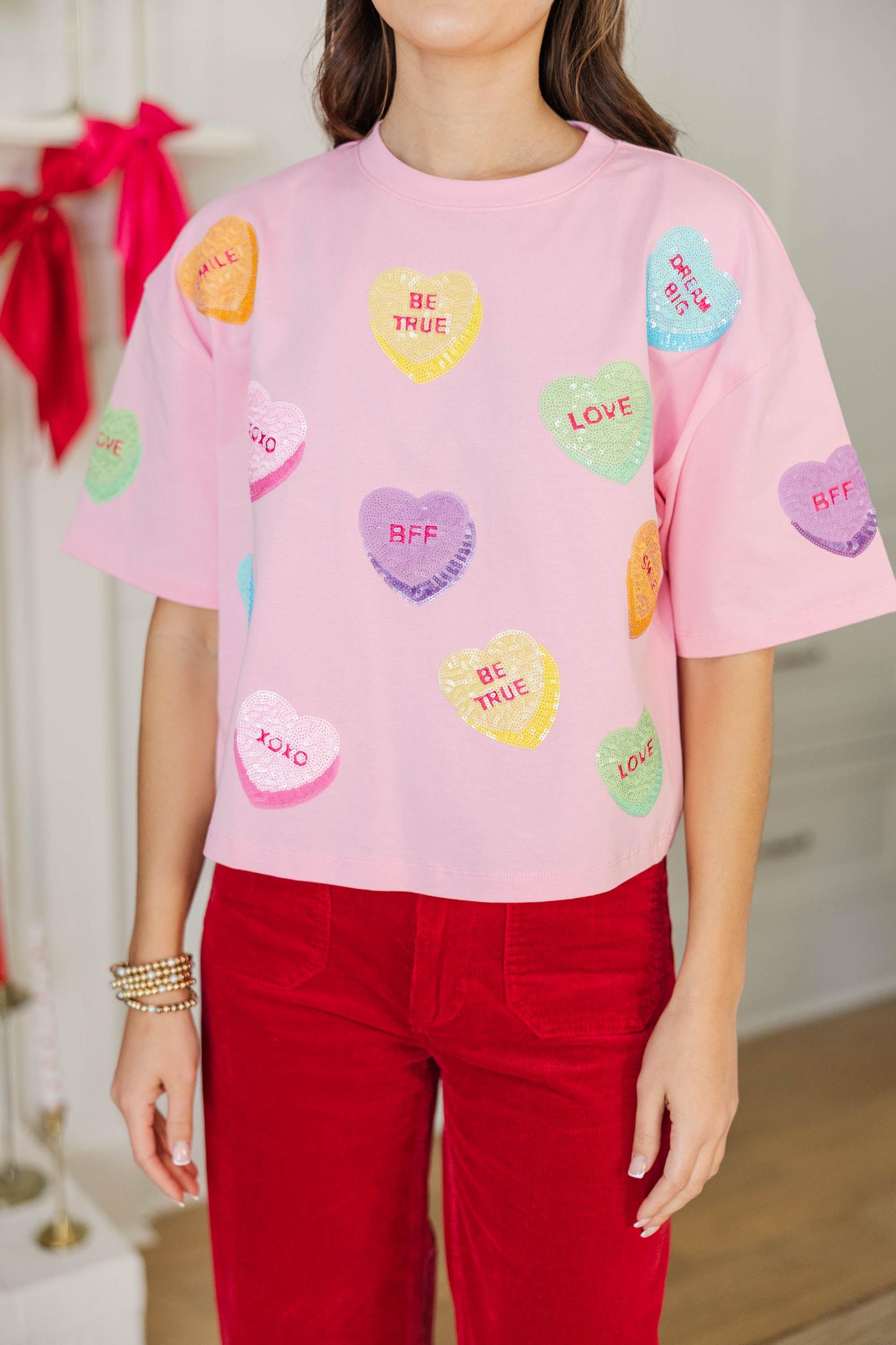 This fun, candy-heart top brings all the Valentine’s vibes with its playful graphics and cheerful pops of color. Soft and comfy with an easy fit, it’s perfect for spreading a little love on casual days, festive outings, or cozy celebrations. Pair it with denim or bright bottoms for a look that’s sweet, fun, and totally on theme. Classic round neckline Short sleeves Loose, boxy silhouette Straight hemline Soft fabric with moderate stretch Maddi is wearing the small.