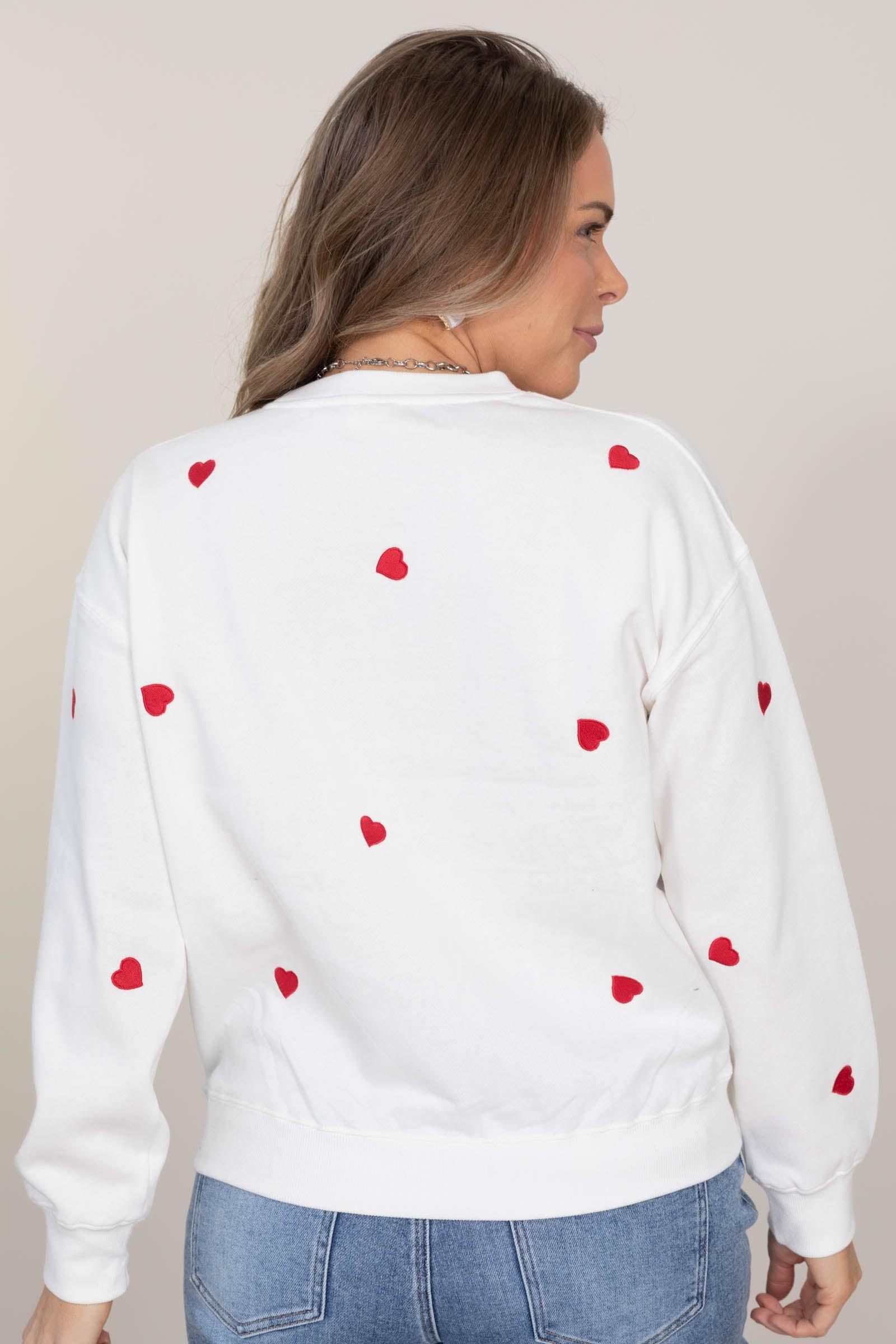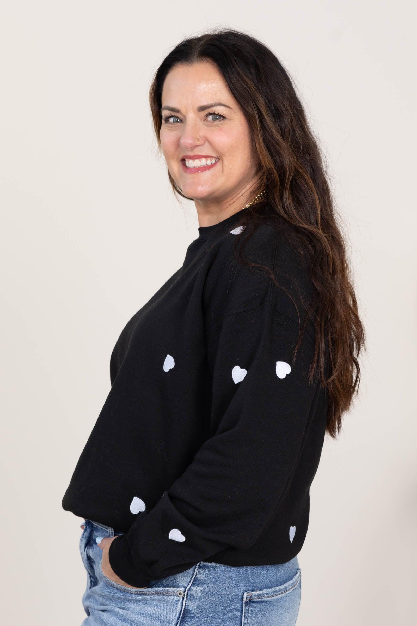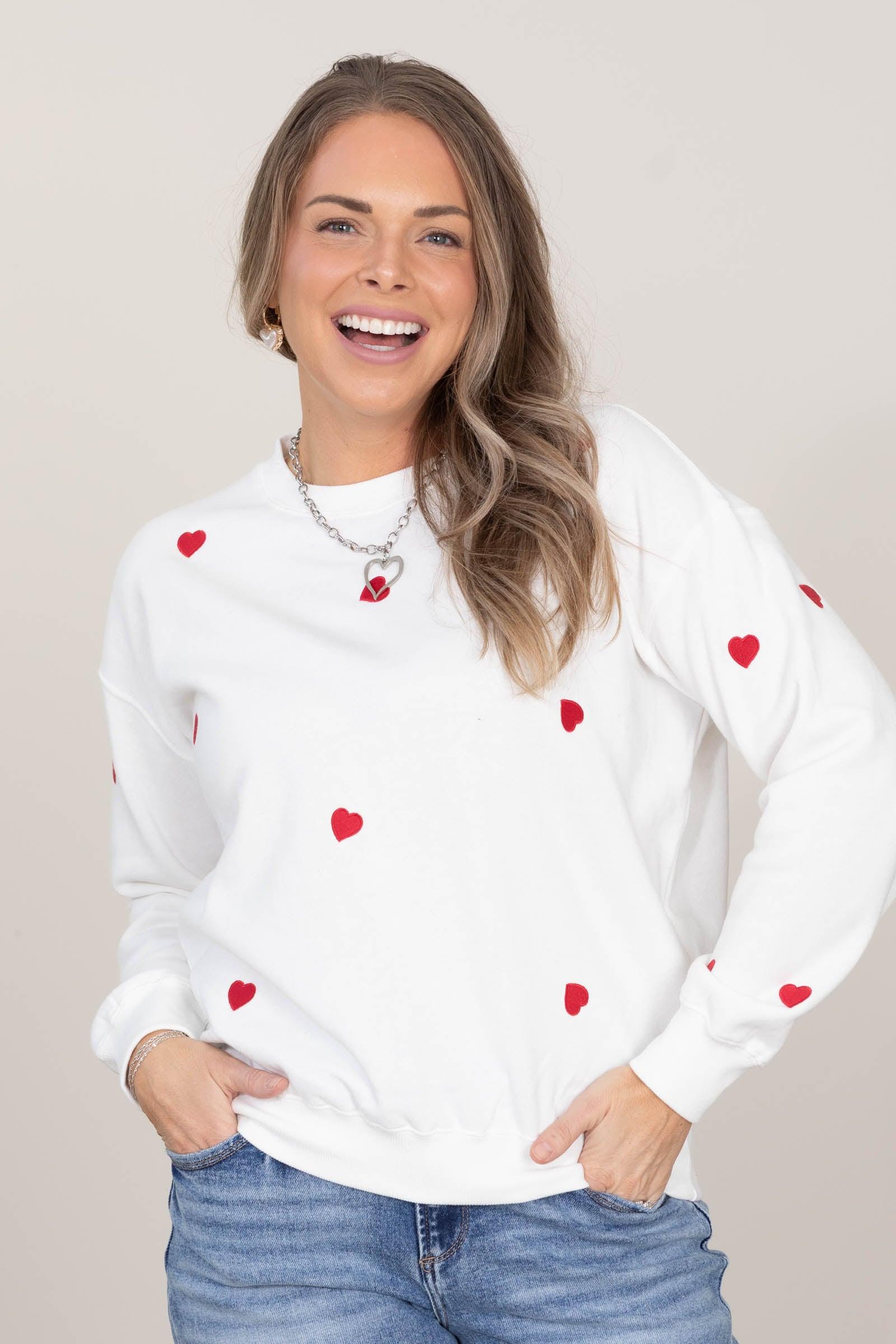 Product Details Colors: Black, White/ Red, White/ Ivory, Red Print: Hearts Neckline: Round Sleeve: Long Sleeve Hemline: Straight Material and Care 40% Polyester 60% Cotton Machine Wash Cold Tumble Dry Low Size and Fit Small: Bust 46" Waist 46" Length 24" Medium: Bust 48" Waist 48" Length 24.5" Large: Bust 50" Waist 50" Length 25" Erica is 5’7” and wearing her true size small Renae is 5’2 and wearing her true size small Rachel is 5'2" and wearing her true size small