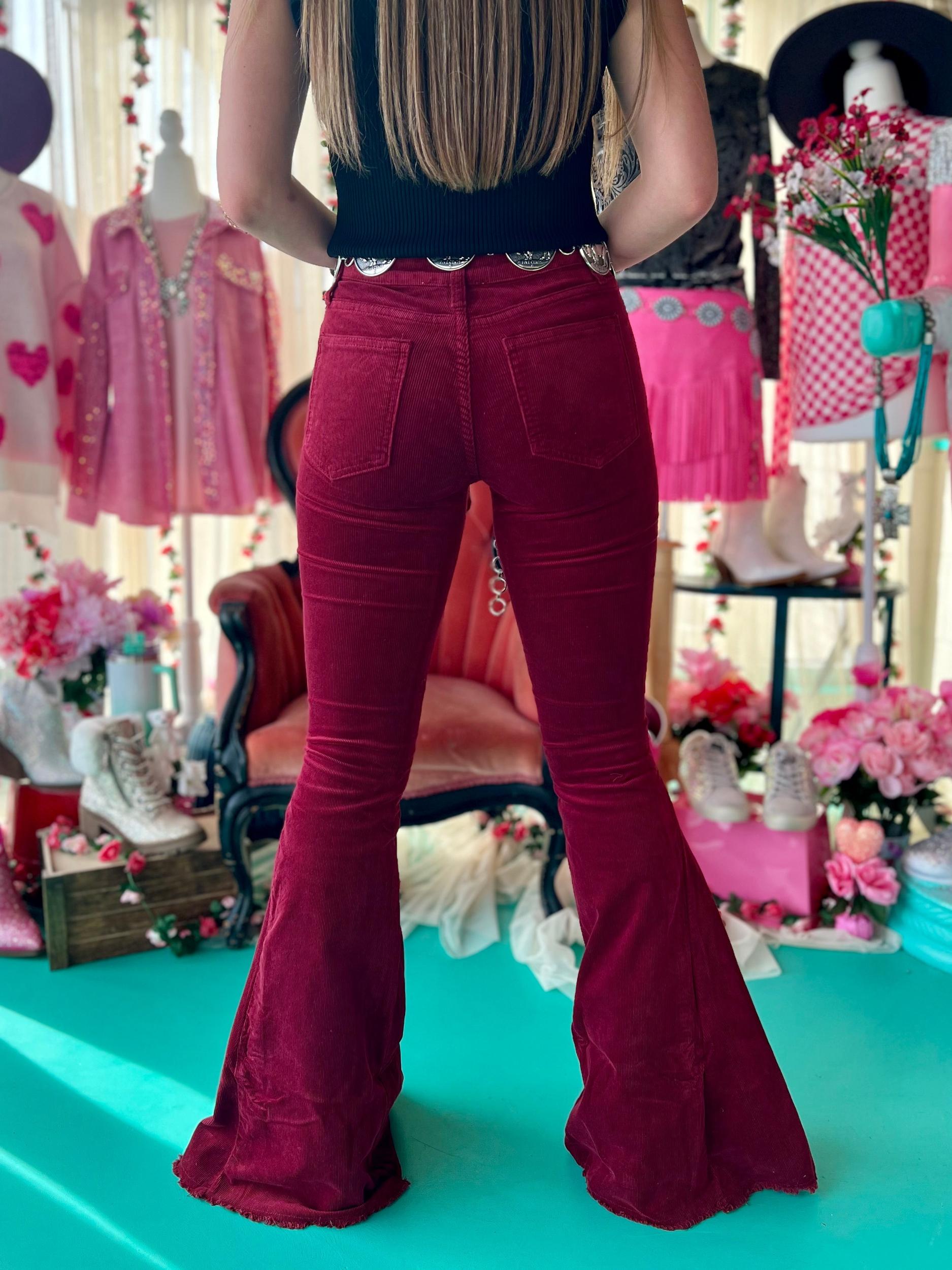 These burgundy corduroy flares are an effortlessly stylish addition to any wardrobe. With western vibes and a retro/vintage aesthetic, you'll channel some serious Lainey Wilson vibes. Easy to style and perfect for the fashion-forward free spirit. Don't miss out on owning the heart of corduroy! 97% cotton 3% spandex Small 2-4 Medium 6-8 Large 10-12