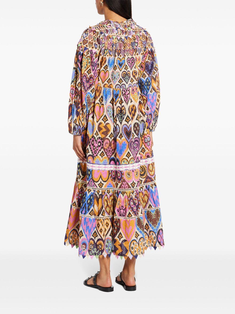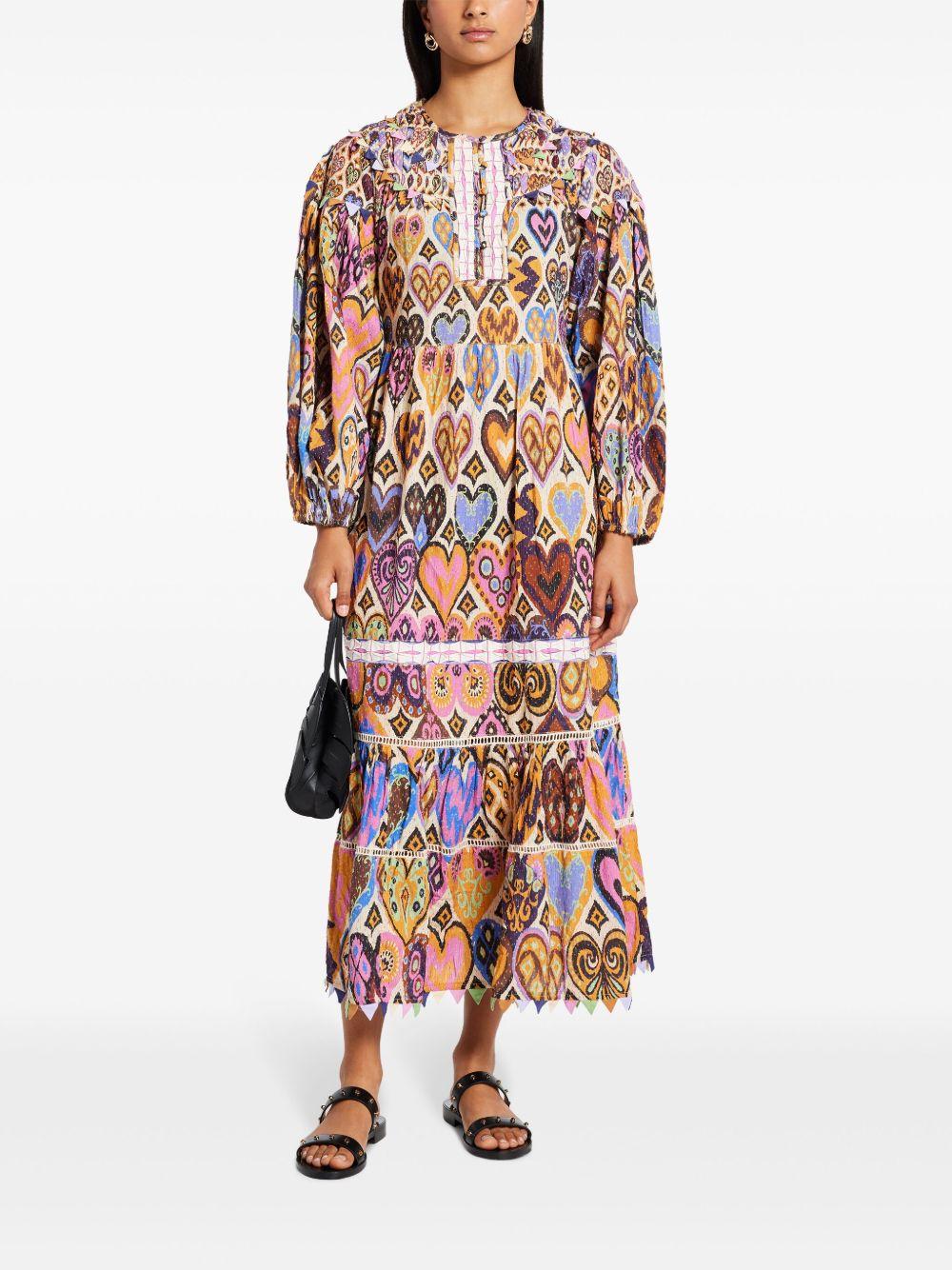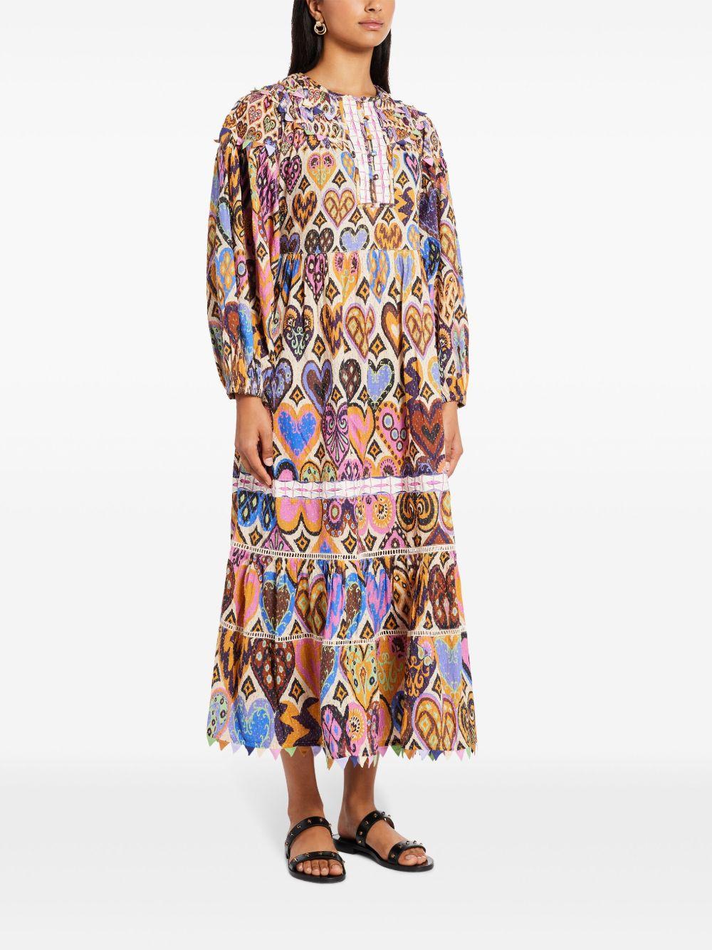FARM Rio heart-print midi dress | Neutrals | multicolour | cotton | all-over graphic print | heart print | panelled design | front button placket | crew neck | long sleeves | elasticated hem | scallop hem | mid-length | Cotton | Day Dresses | Dresses | Clothing | Women