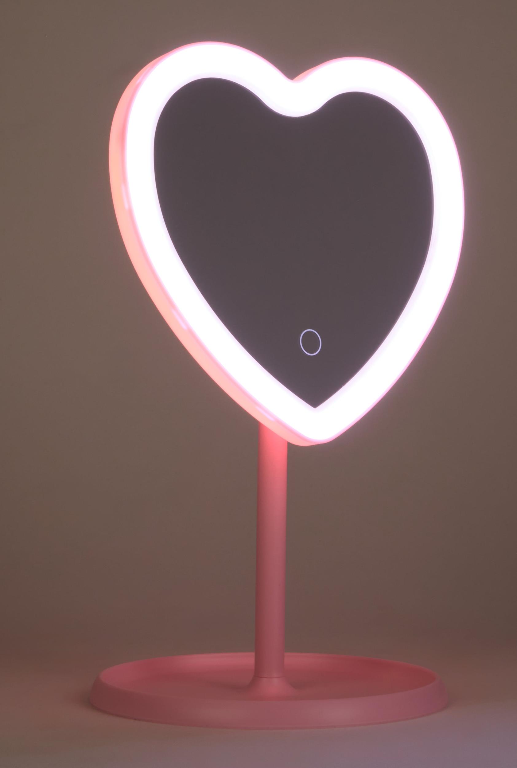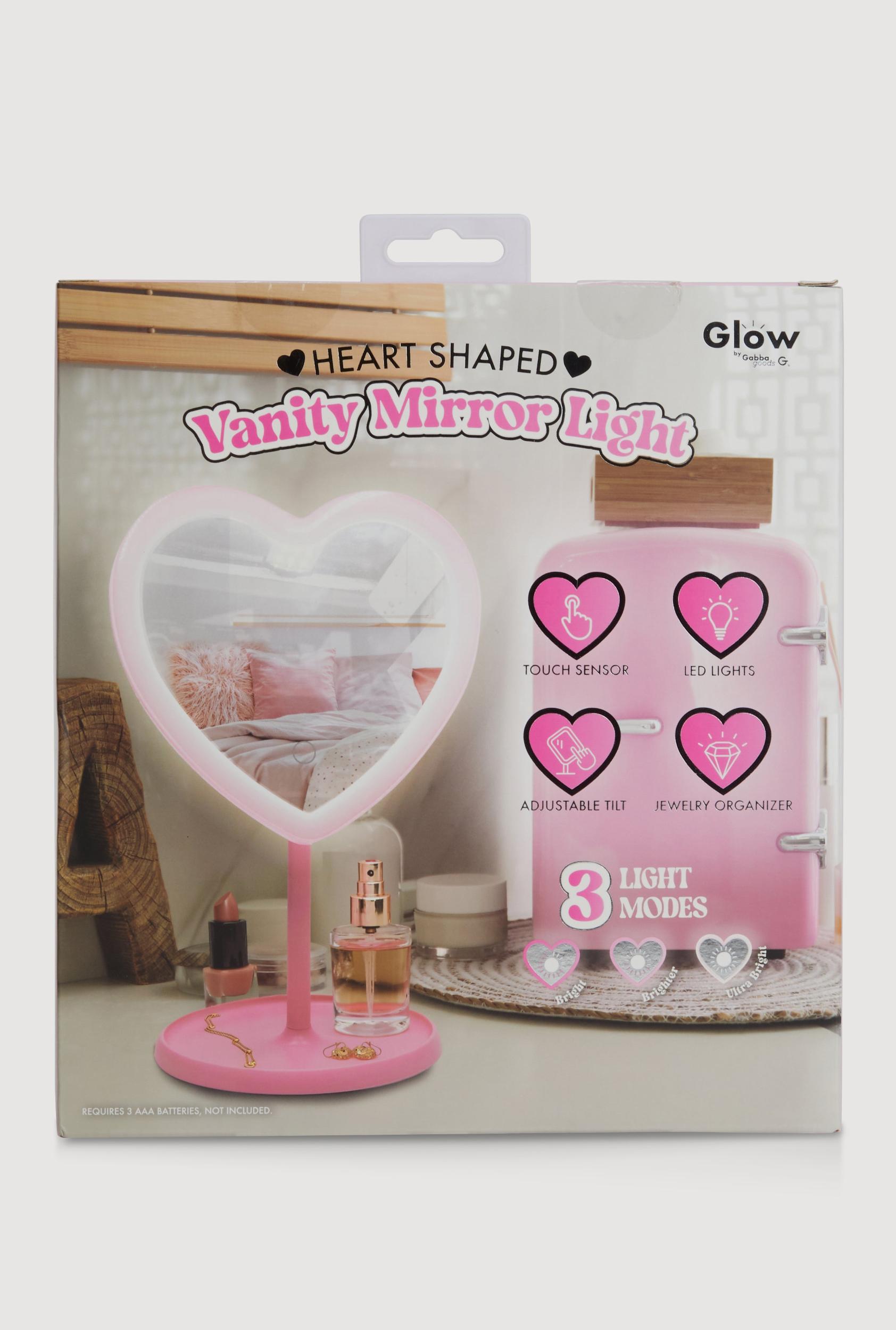 A heart-shaped vanity mirror designed for easy use with touch sensor activation and adjustable tilt for the perfect angle. It features built-in LED lights with three modes to customize brightness. Touch sensor for effortless on and off control Adjustable tilt lets you find your ideal viewing angle Three LED light modes to match any mood or setting Content and Care Material: All Man-Made Material Country Of Origin: China Rainbow Item Number 5192070770155 PINK - 5192070770155066
