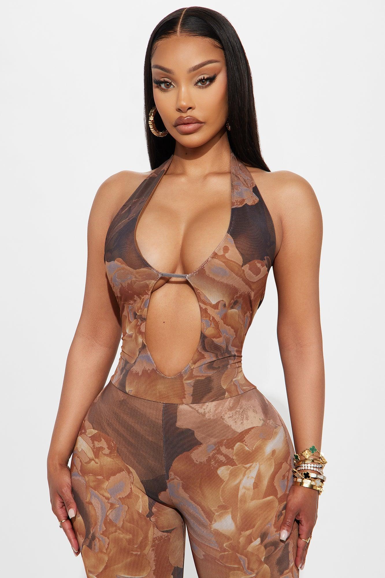 Heat Wave Mesh Halter Flare Jumpsuit - Brown/combo