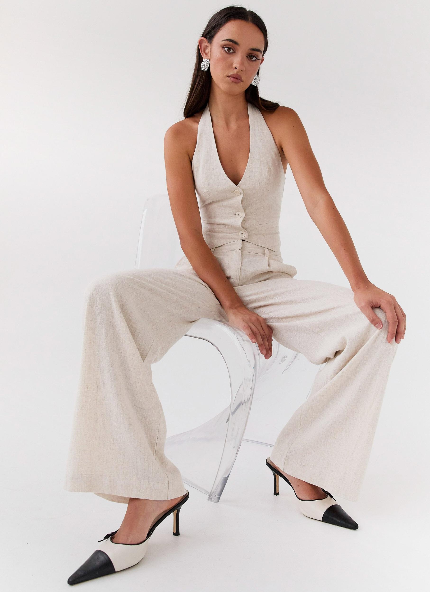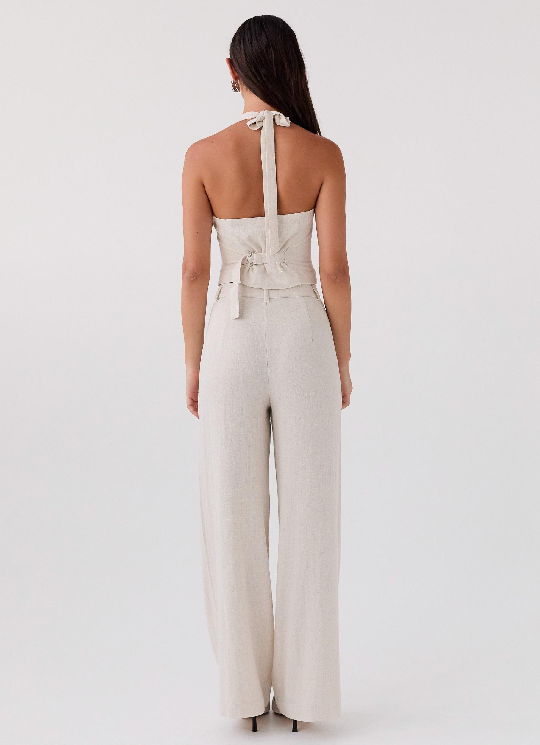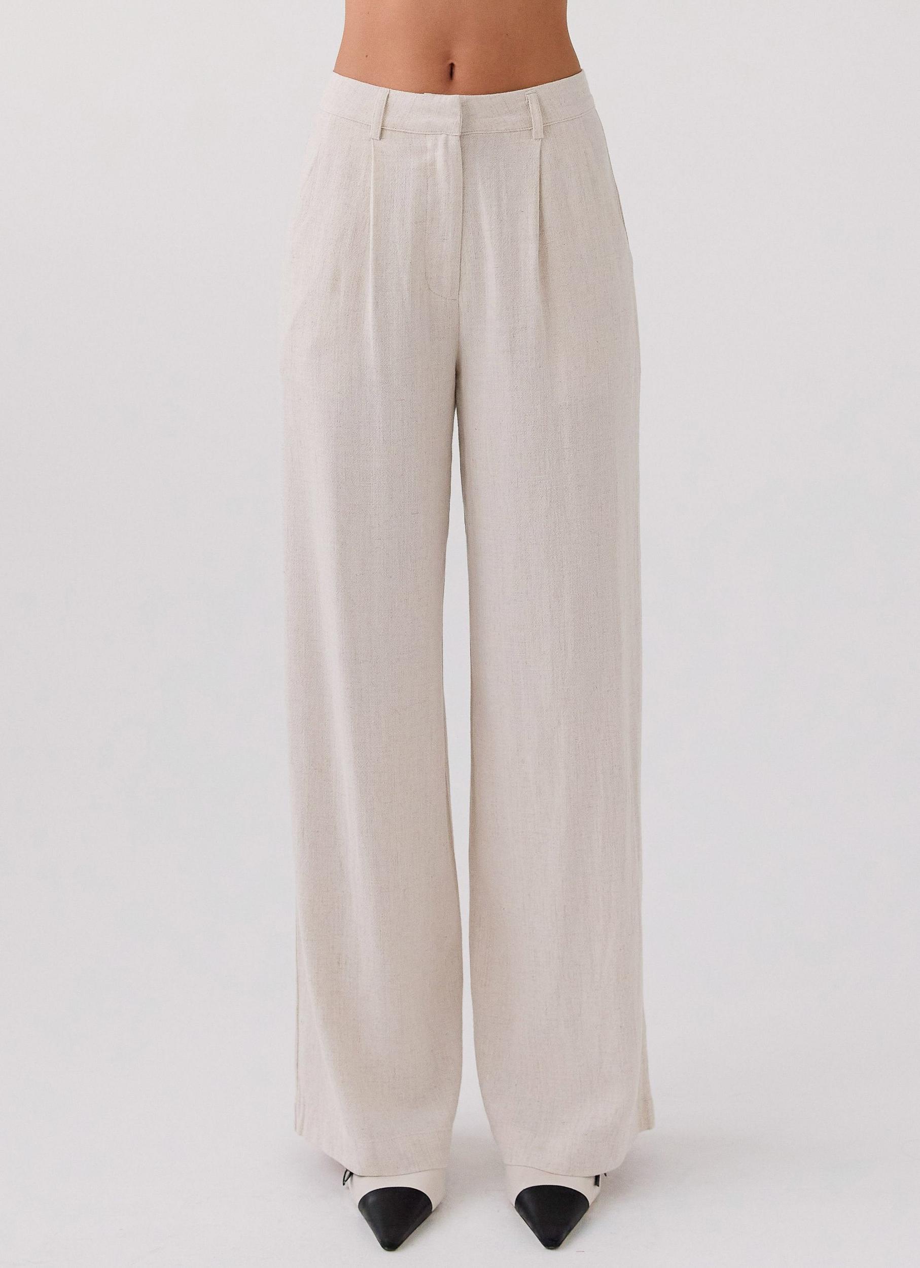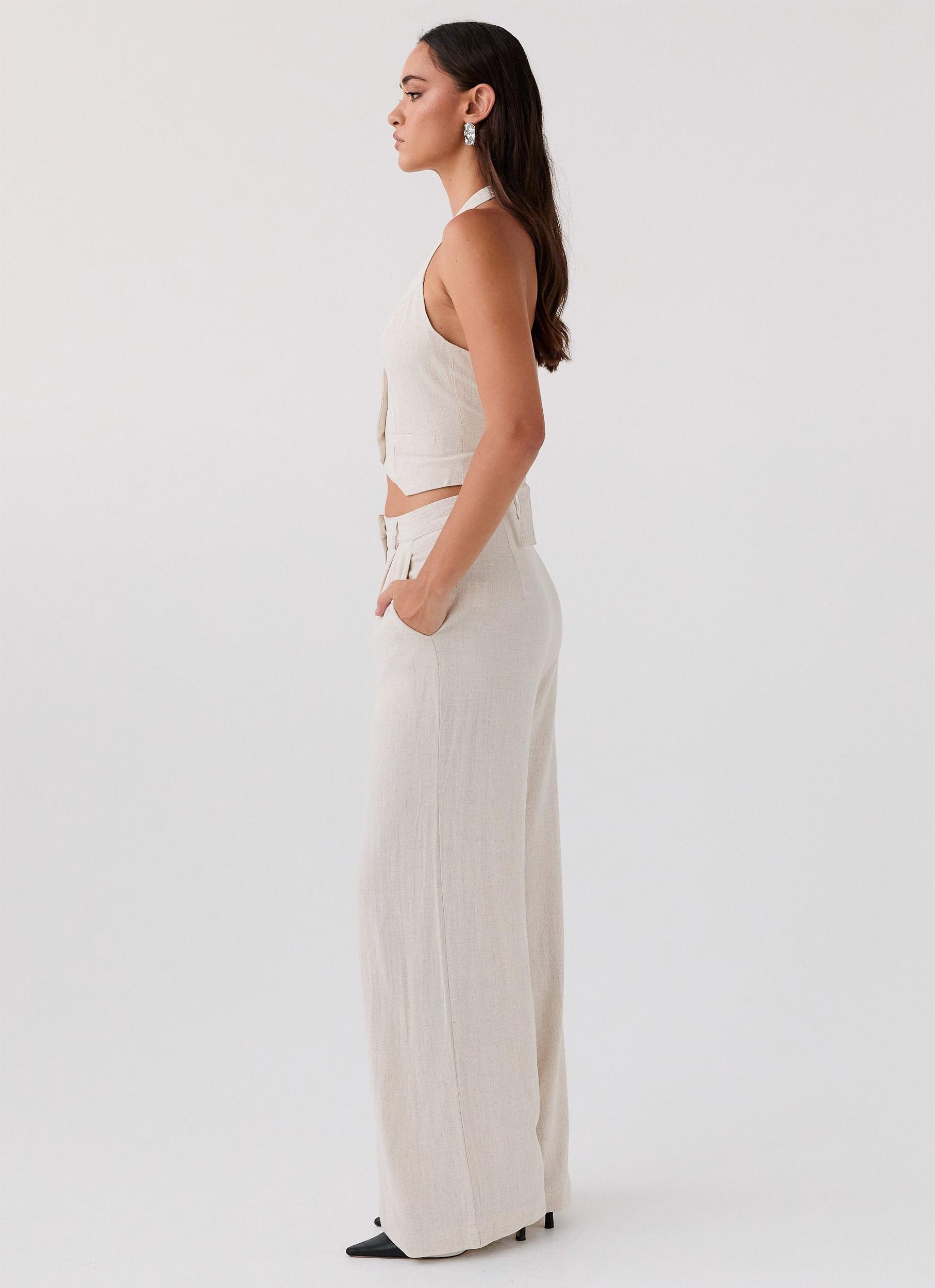 Peppermayo Exclusive Introducing our Heatwave Linen Wide Leg Pants – a chic staple for your evening adventures. Crafted for ultimate versatility, these pants look best by pairing them with our Heatwave Linen Apron Top. Perfect for embracing golden skies, balmy nights. - Wide leg pants- Mid-rise- Twin hip pockets- Fly front zip- Front pleats- Hook and eye closure- Unlined- Belt loops- 45% Linen, 55% Cotton Size AU 8 / US 4 garment measurements: Length 107.5cmHip 98cmWaist 68cm Roberta wears size AU 6 / size US 2