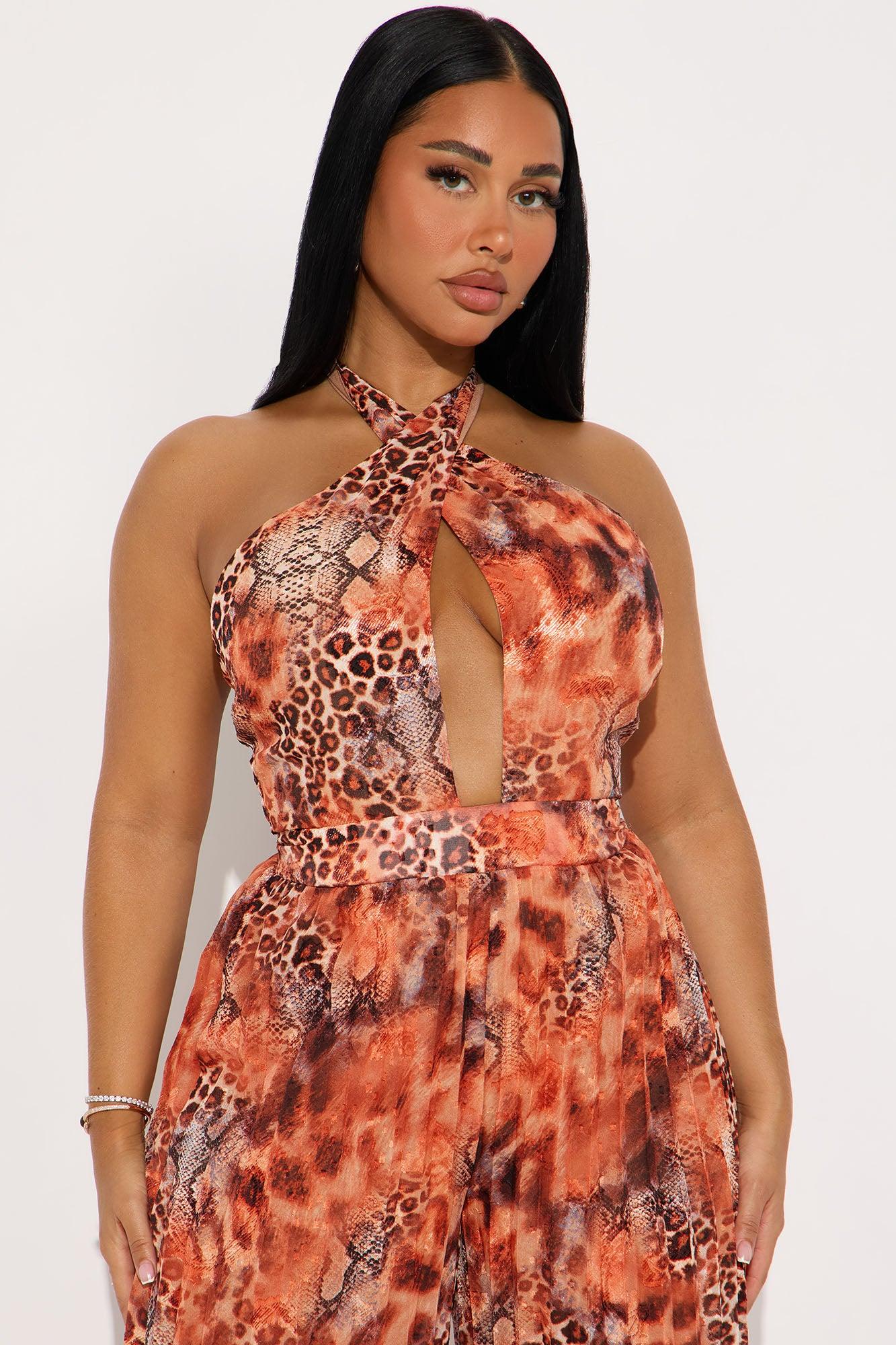 Available In Orange/combo. Jumpsuit Non Stretch Halter Tie Back Invisible Back Zipper Closure Wide Leg 32" Inseam Disclaimer: Print Placement Will Vary Self: 100% Polyester Lining: 97% Polyester 3% Spandex Imported California Proposition 65WARNING: Cancer and Reproductive Harm - www.P65Warnings.ca.gov.