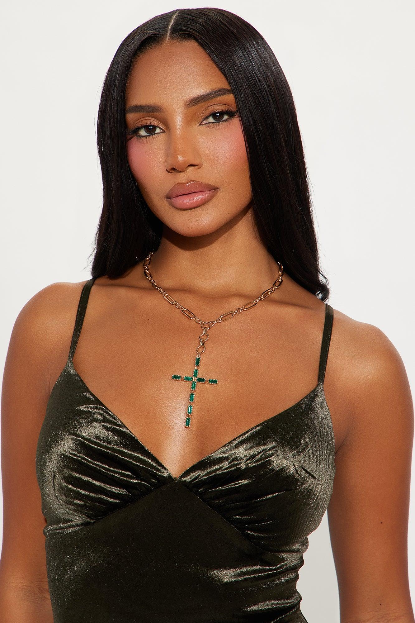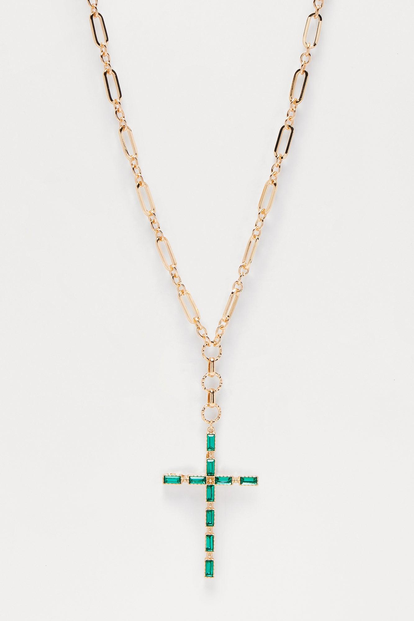 Available In Gold/Green. Pendant Necklace Jeweled Cross Pendant Chainlink Necklace Rhinestone Detail Religious Motifs Lobster Clasp Closure Metal Imported California Proposition 65WARNING: Cancer and Reproductive Harm - www.P65Warnings.ca.gov.