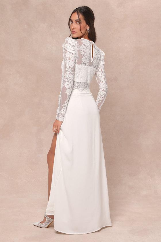 Vow yourself to a life of love and happiness in a stunning look like the Lulus Heavenly Promise White Sheer Lace Two-Piece Maxi Dress! This two-piece dress offers a modern touch with its sheer floral lace top that boasts a crew neckline and a cropped bodice with a sweetheart, bandeau-style knit liner and a scalloped, eyelash lace hem. Long sleeves with puff shoulders framed the high, banded waist of the matching skirt with a sleek woven fabrication that shapes an A-line silhouette and a sweeping maxi hem with a thigh-high side slit. Loop-button closure at back of top secures atop a keyhole cutout and has a hidden side zipper. Skirt features a hidden side zipper/clasp.