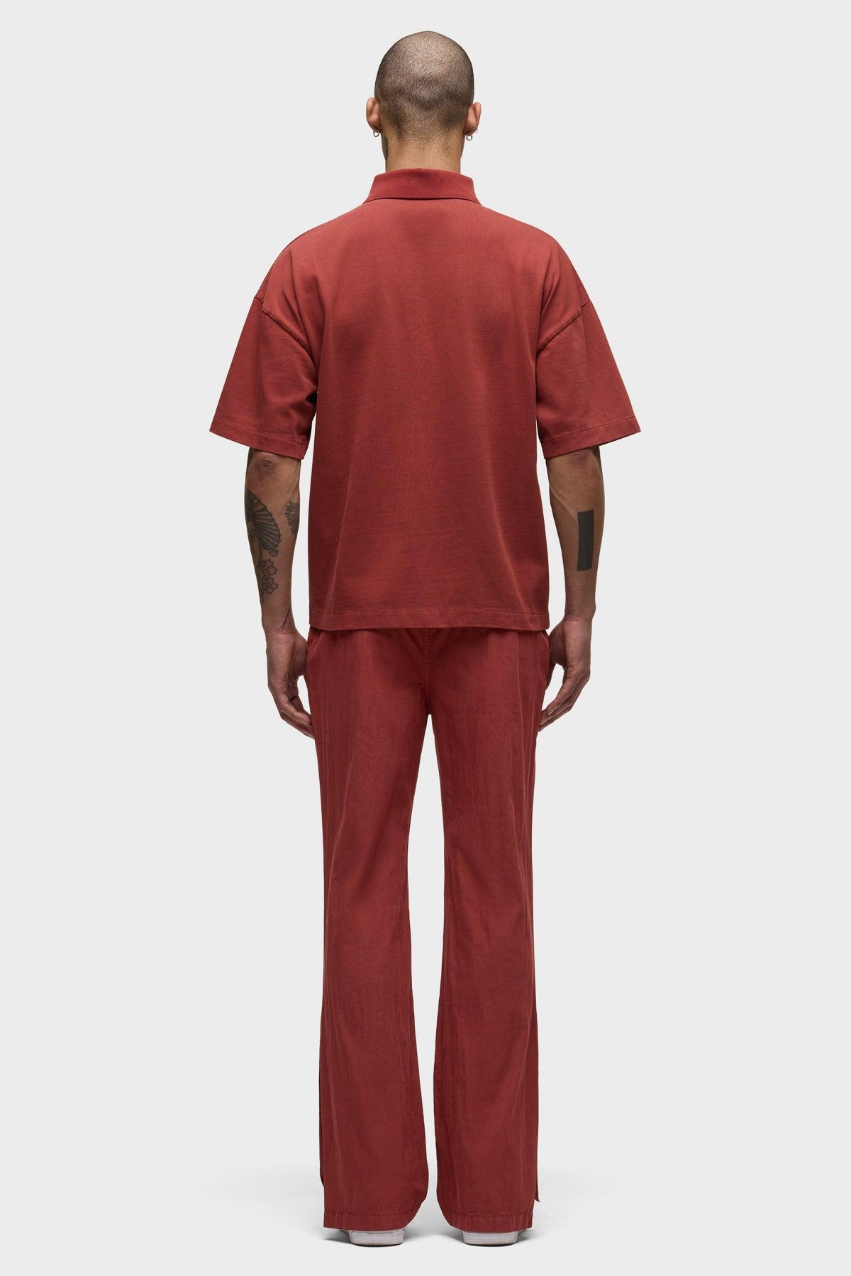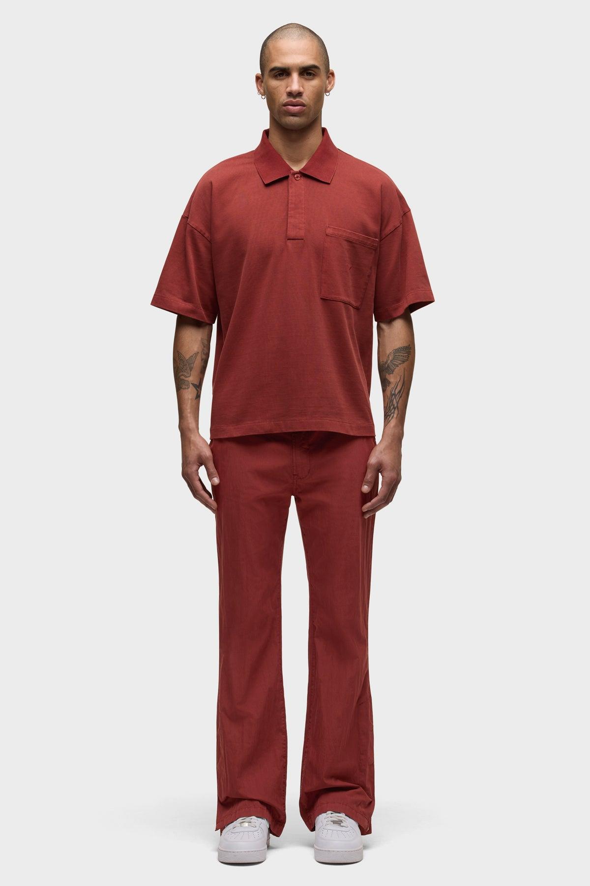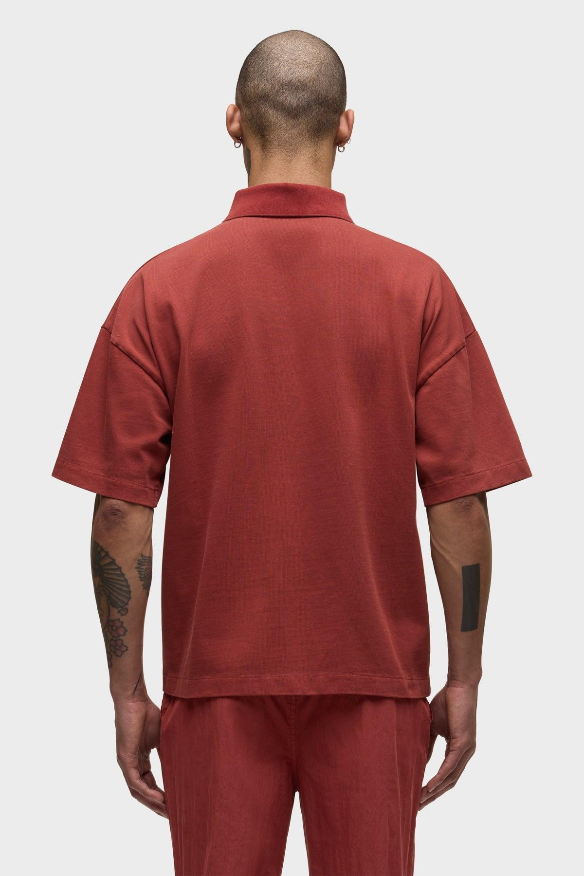 Description Our Heavyweight Polo is crafted from 100% cotton in a reactive overdyed red stone wash, Sunset. Featuring a slightly cropped, boxy fit, this style is designed with an oversized front pocket and a standout peak collar for a modern, stylish edge. Product DetailsBody Length: 27.5", Chest: 47.5", Sleeve Length: 9"Model Height 6’1"Model wearing size M/32Measurements based on size M/32 Fabric & CareContent: 100% CottonMachine wash cold gentle cycle inside out wash with like colorsDo not bleachTumble dry lowMedium iron inside out if needed
