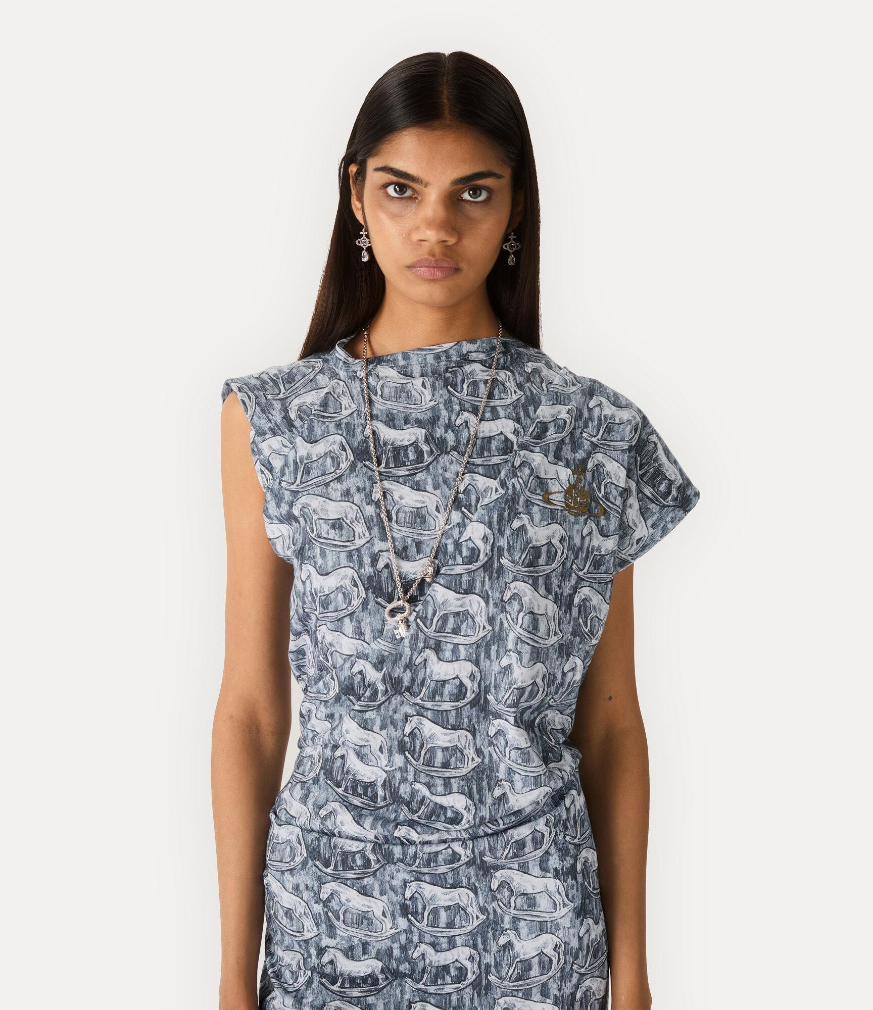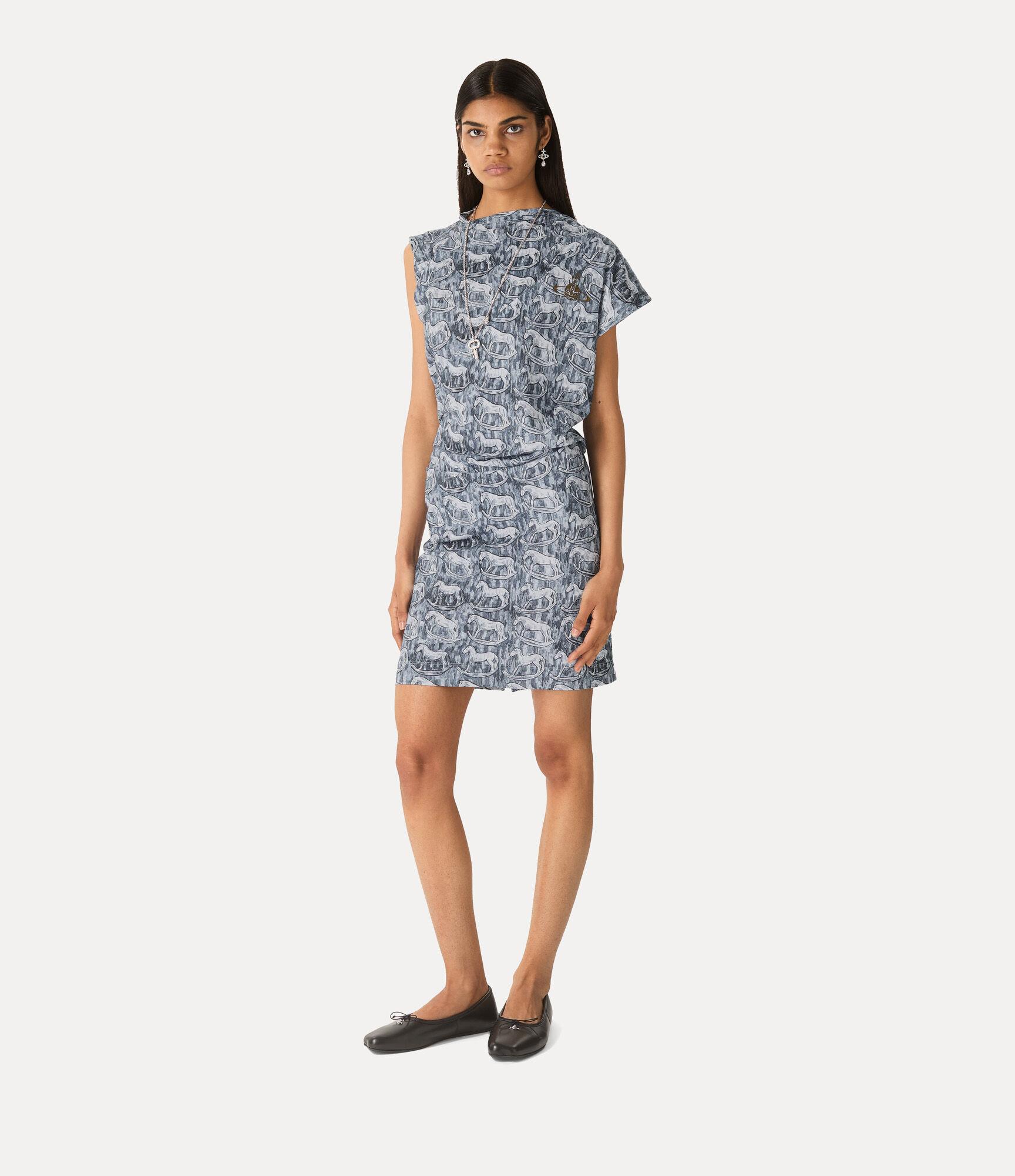 Our Hebo dress is decorated with the archival 'Rocking horse' motif, a nod to the Year of the Horse. Designed with an asymmetric neckline and subtle drape detailing, the piece features short, angled cap sleeves and falls into a straight, knee-length hemline.