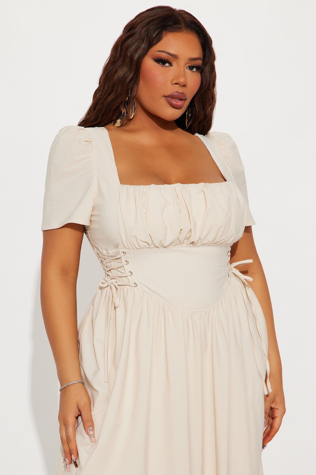Available In Cream And Sage. Maxi Dress Square Neckline Long Sleeve Corset Waist Lace Up Side Details Tie Back Hidden Back Zipper Lined Stretch Shell: 85% Nylon 15% Spandex Lining: 100% Polyester Imported