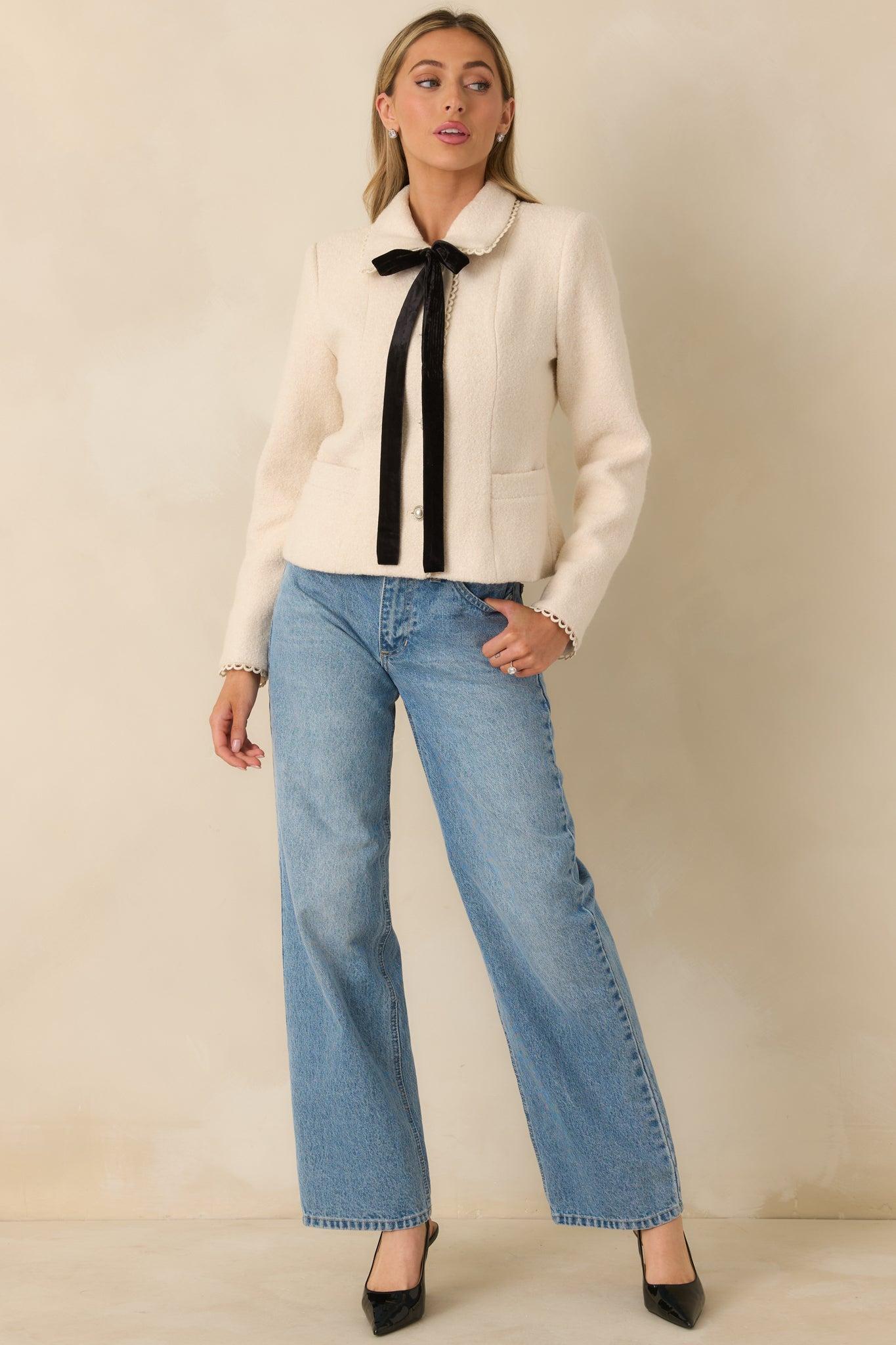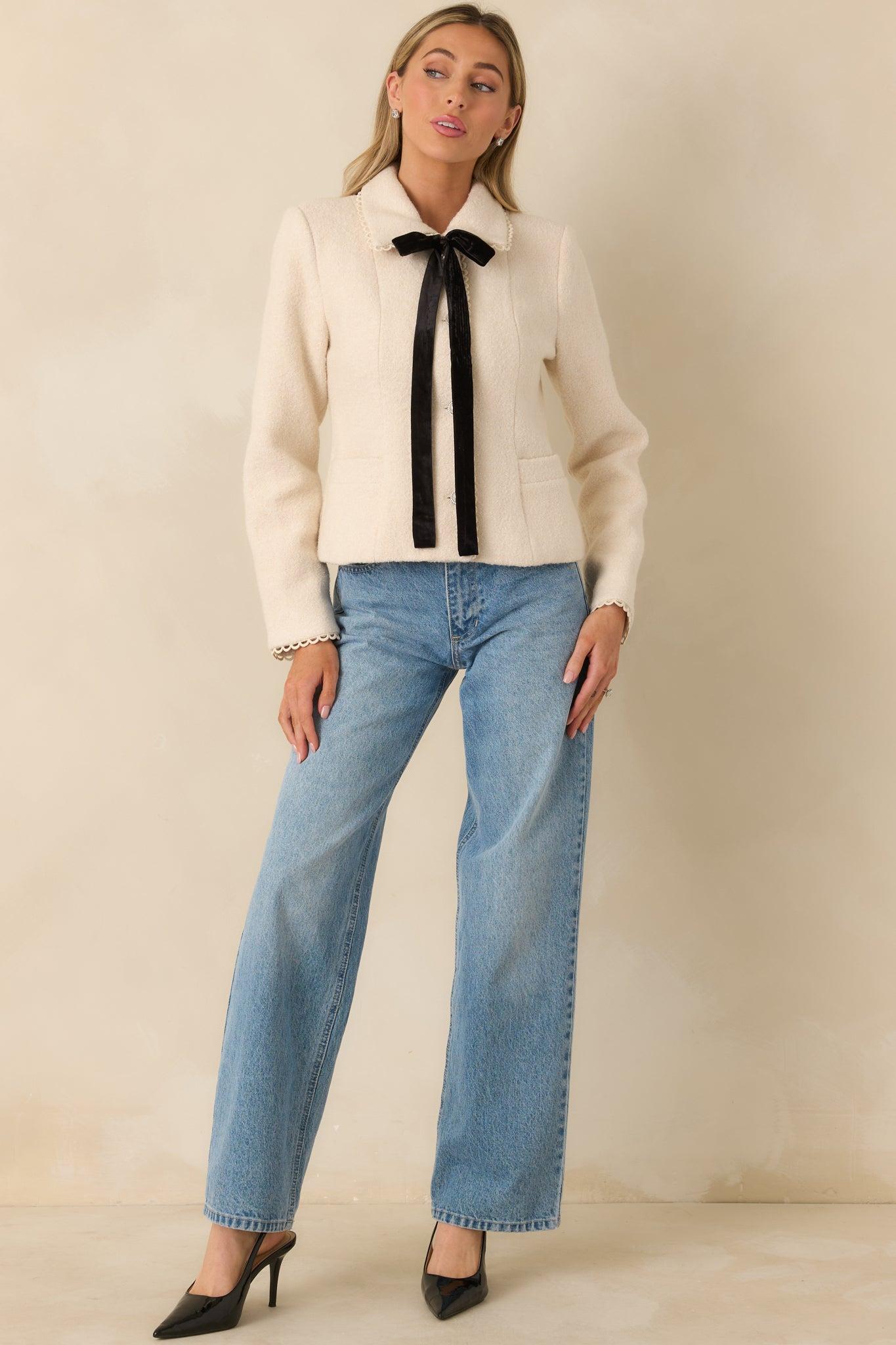 The Held Together Natural Wool Blend Pearl Button & Velvet Tie Jacket brings a timeless, feminine feel to cooler days. From the soft wool blend texture to the delicate pearl buttons and velvet tie detail, it’s the kind of piece that instantly elevates your look without feeling overdone. Structured yet charming, it’s perfect for when you want to feel put-together with just a touch of romance. This natural-colored jacket is made from a soft wool blend and features a tailored, lightly structured fit. Design details include a rounded collar with scalloped trim, pearl button front closures, a velvet ribbon tie at the neckline, long sleeves, and front patch pockets. Fully lined for a polished and comfortable finish.