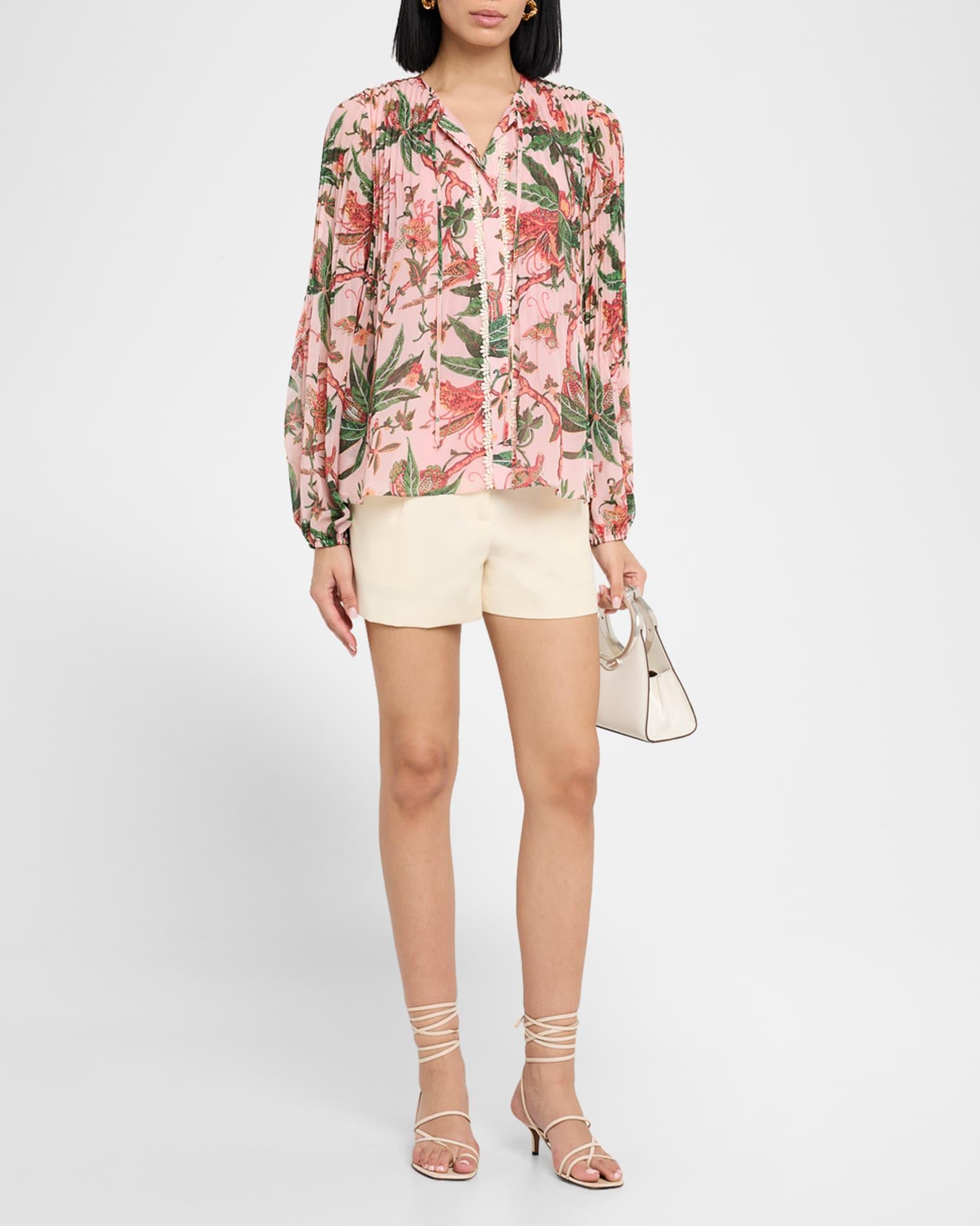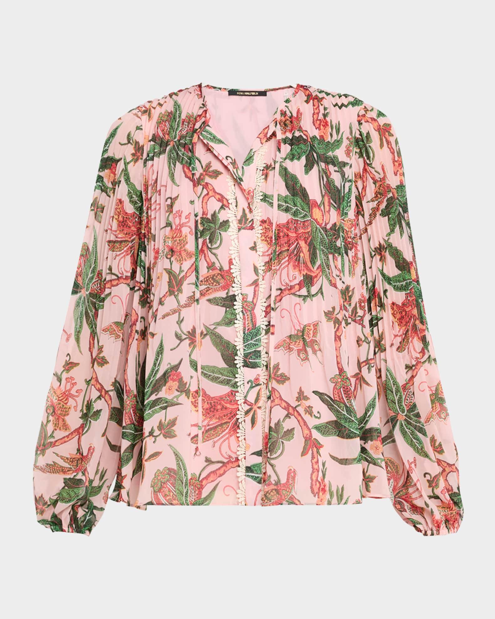 Kobi Halperin "Helen" pleated blouse in a floral print features delicate scalloped lace trim Approx. 26"L from shoulders to hem Crew neckline; front self-tie Concealed button front Long blouson sleeves Elasticized cuffs Relaxed fit Polyester Lining: Polyester Dry clean Imported Shipping Direct from Vendor, usually ships within 7 business days.