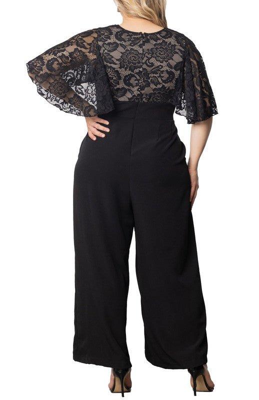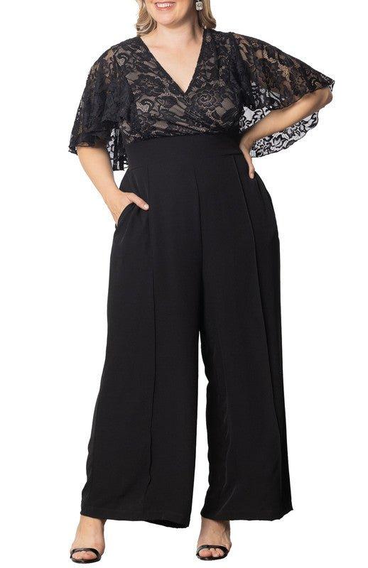 Elevate your wardrobe with the Plus Size Helena Lace Jumpsuit by Kiyonna. This sophisticated special occasion pantsuit features a lace surplice bodice, pockets, back zipper, flutter sleeves and a flattering pintuck along the flowy wide pant legs. An ideal option for the glam wedding guest or elegant mother of the bride or groom. Made exclusively in women's plus sizes 0X-5X (10-32).