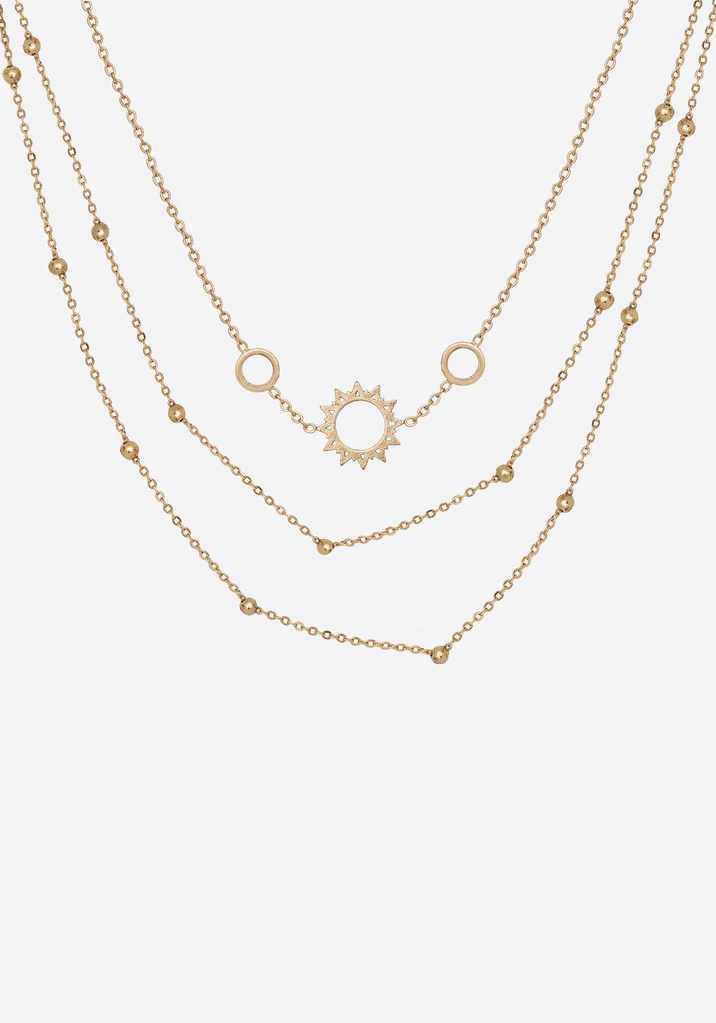 The golden sun opens the mind and lights the way forward - Triple-layer gold choker with sun charm- Adjust the chain with two small rings and lobster clasp- Top chain connects to two symmetrical rings and heart charm centre- Middle and bottom chain punctuated with golden balls- Delicate but strong, like all your favourite goddesses