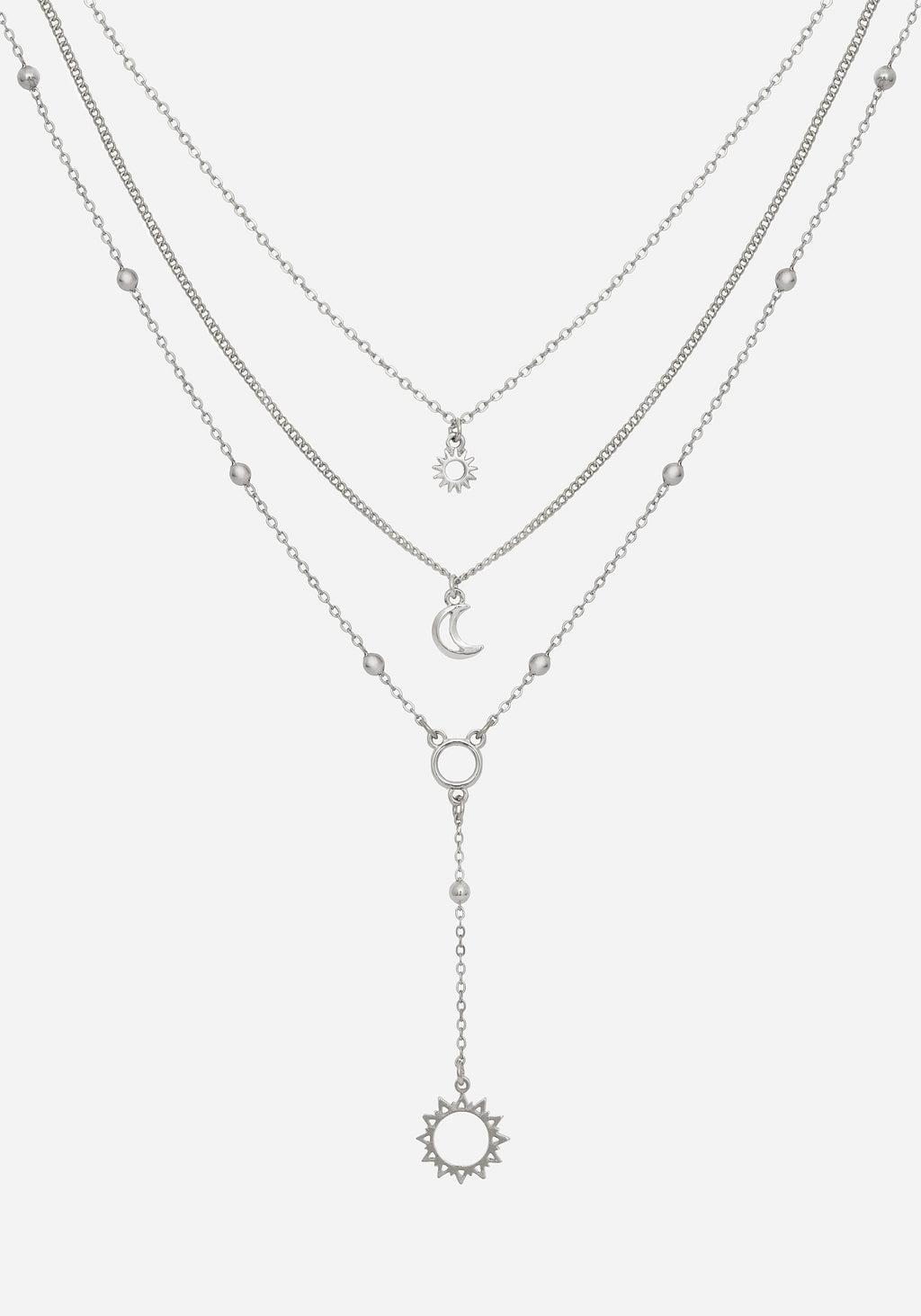 The silver sun opens the mind and lights the way forward . Our bestselling Helios choker gets an upgrade into an equally beautiful, layered necklace. Two delicate chains suspend moon & sun charms. The bottom chain is punctuated with tiny silver balls and a drop pendant which harks back to the original choker. Delicate but strong, like all your favourite goddesses. - COLOUR: Silver - COMPOSITION: Metal alloy - CHAIN LENGTH: 35cm, 40cm, 45cm, + 8cm extension - PENDANT: 6cm
