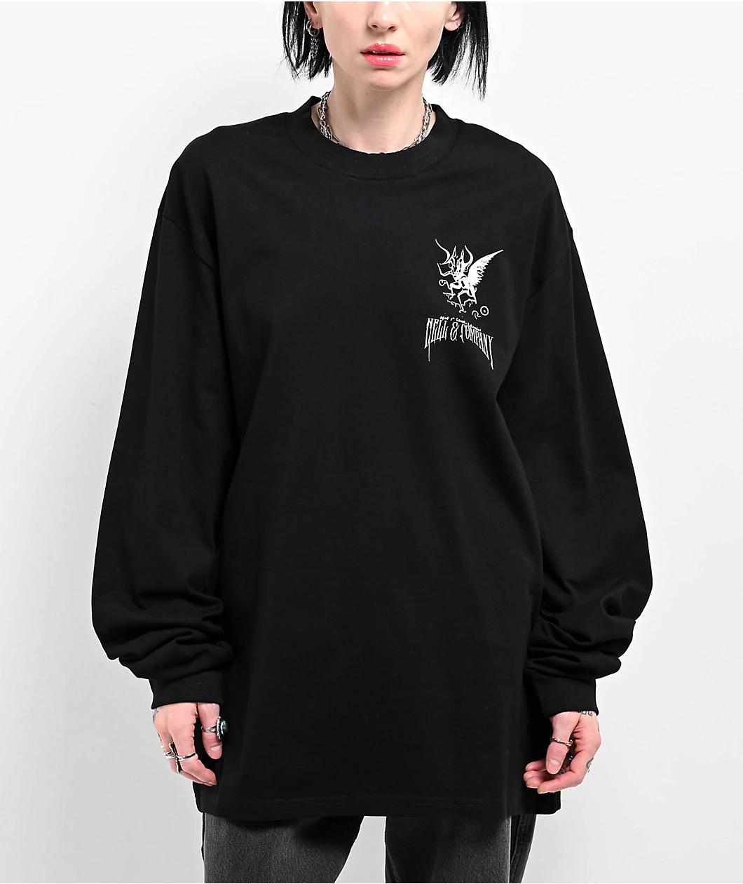 Arriving in a black long sleeve silhouette, the Call Me t-shirt from Hell & Company features a 100% cotton build and creepy screen-printed graphics on the left chest and back for a macabre vibe.