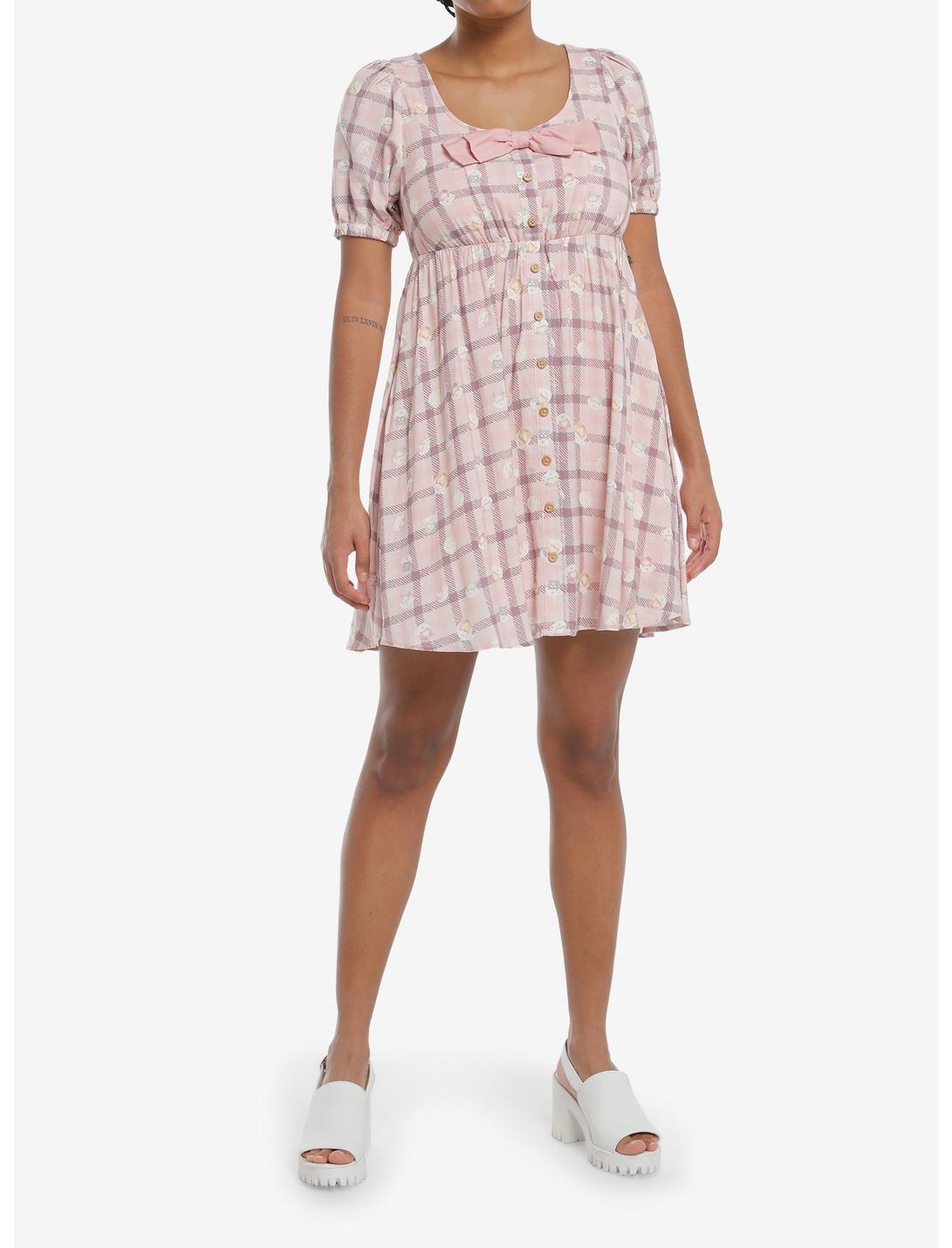 Look the bear-y cutest with this darling babydoll dress! It features a muted plaid pattern with your Sanrio faves dressed as bears throughout. Comes with buttons down the center, an empire waist and a bow at the neckline, plus puffed sleeves and pockets.100% cotton linenWash cold; dry lowImportedListed in junior sizesModel is 5'9"Model wears size Small