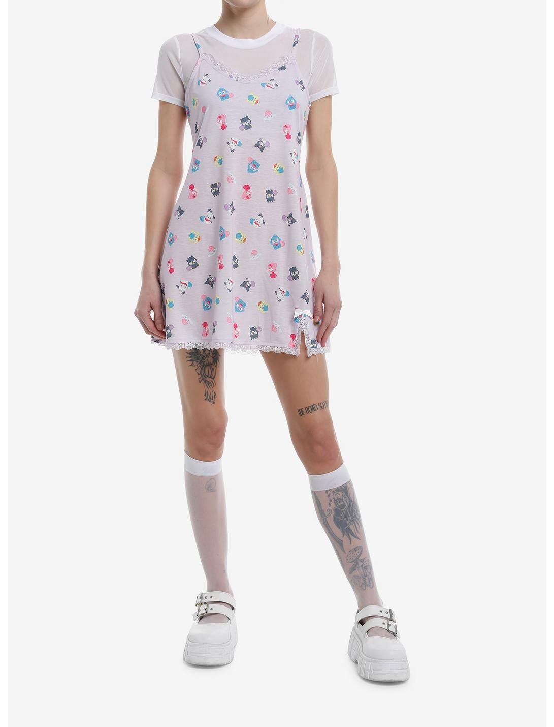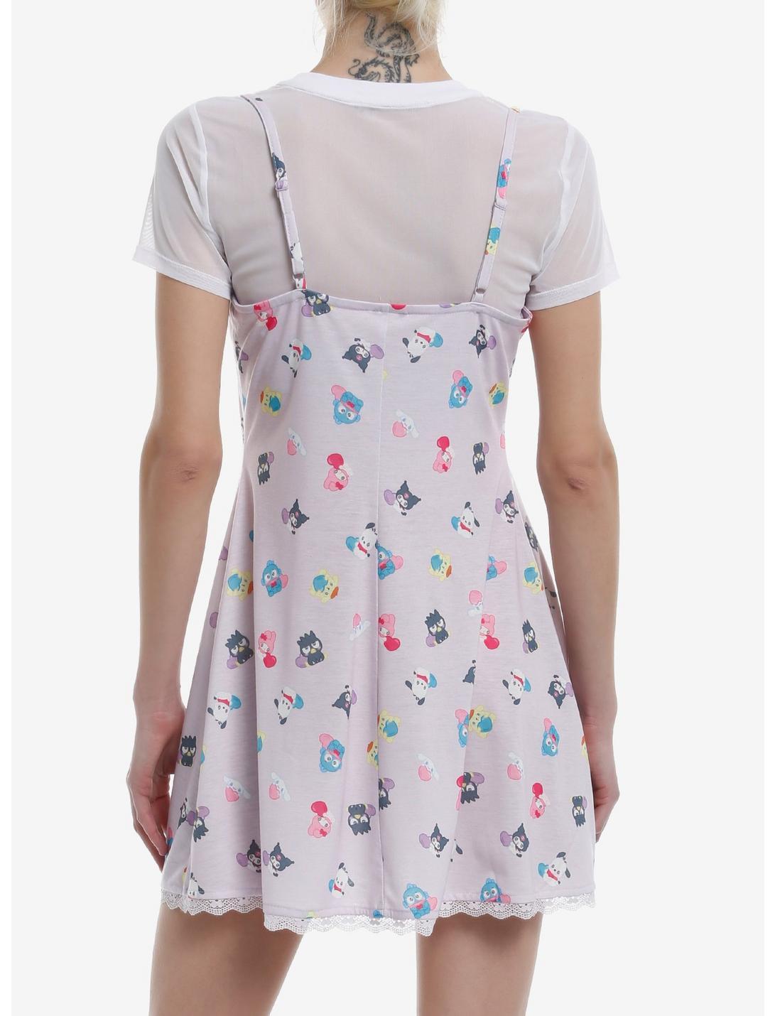 This dress is about to make your spring a whole lot cuter. It's a twofer style with a lavender slip dress showing an allover print of Hello Kitty and her Sanrio besties with kawaii eyes and holding hearts. The dress has adjustable straps and white lace trim at the neckline and bottom hem. The tee underneath is a semi-sheer fine white mesh.Dress: 90% nylon; 10% spandex; tee: 100% polyesterWash cold; dry lowLength: 33"ImportedModel is 5'10"Model wears size Small