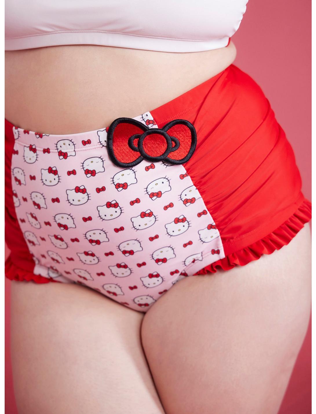 Have some fun in the sun with Hello Kitty! These high-waisted swim bottoms feature an allover print of Hello Kitty's face and bows, plus red panels on the sides with ruching. Comes with appliqué detailing of her signature bow at the hip and ruffle trim. Pair them with the matching top for the ultimate beach day vibe!Top not included.Swimwear can only be returned unworn with original tags intact and sanitary panel in place.82% nylon; 18% spandexHand wash cold; dry flatImportedModel wears size 1