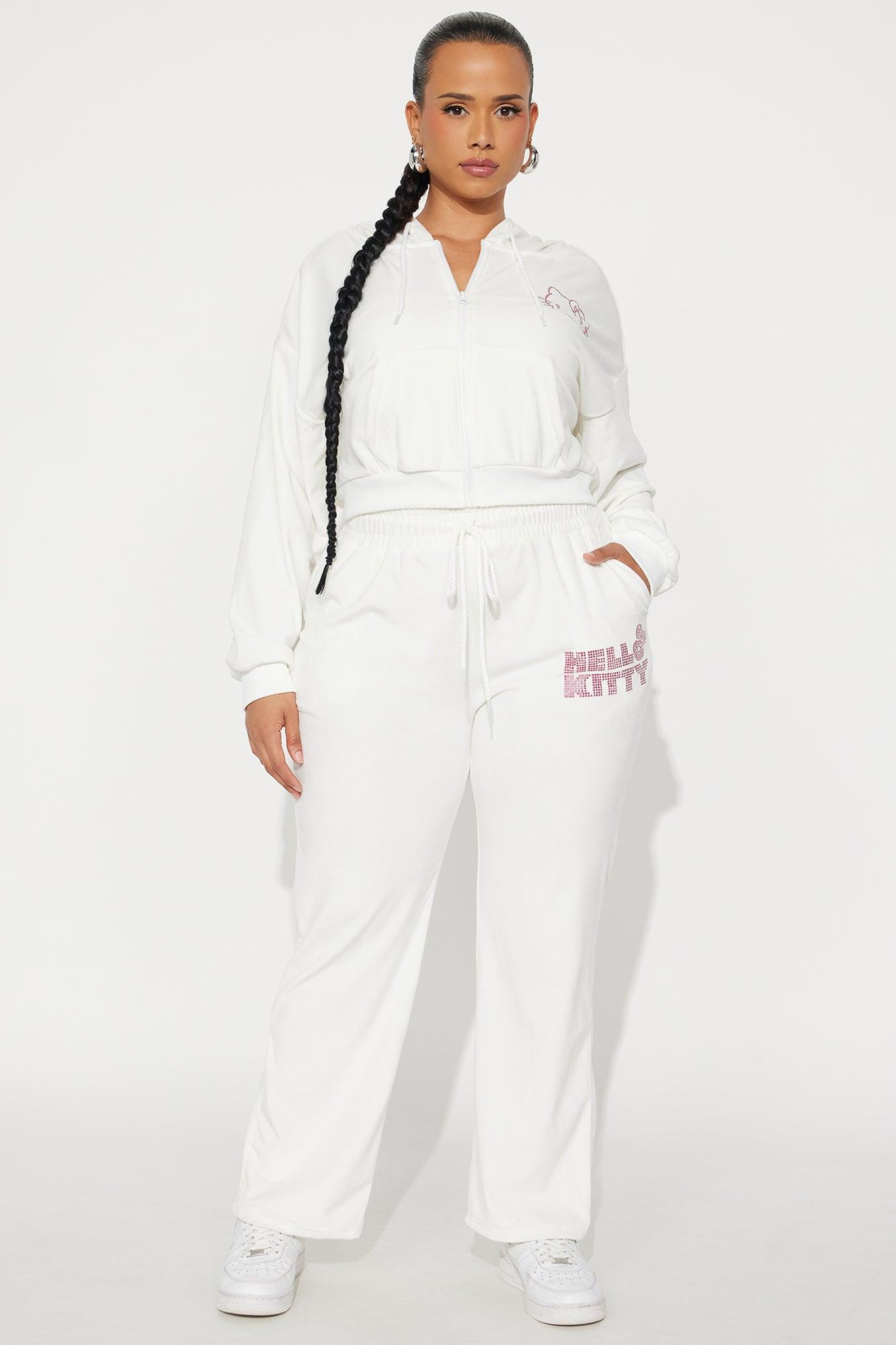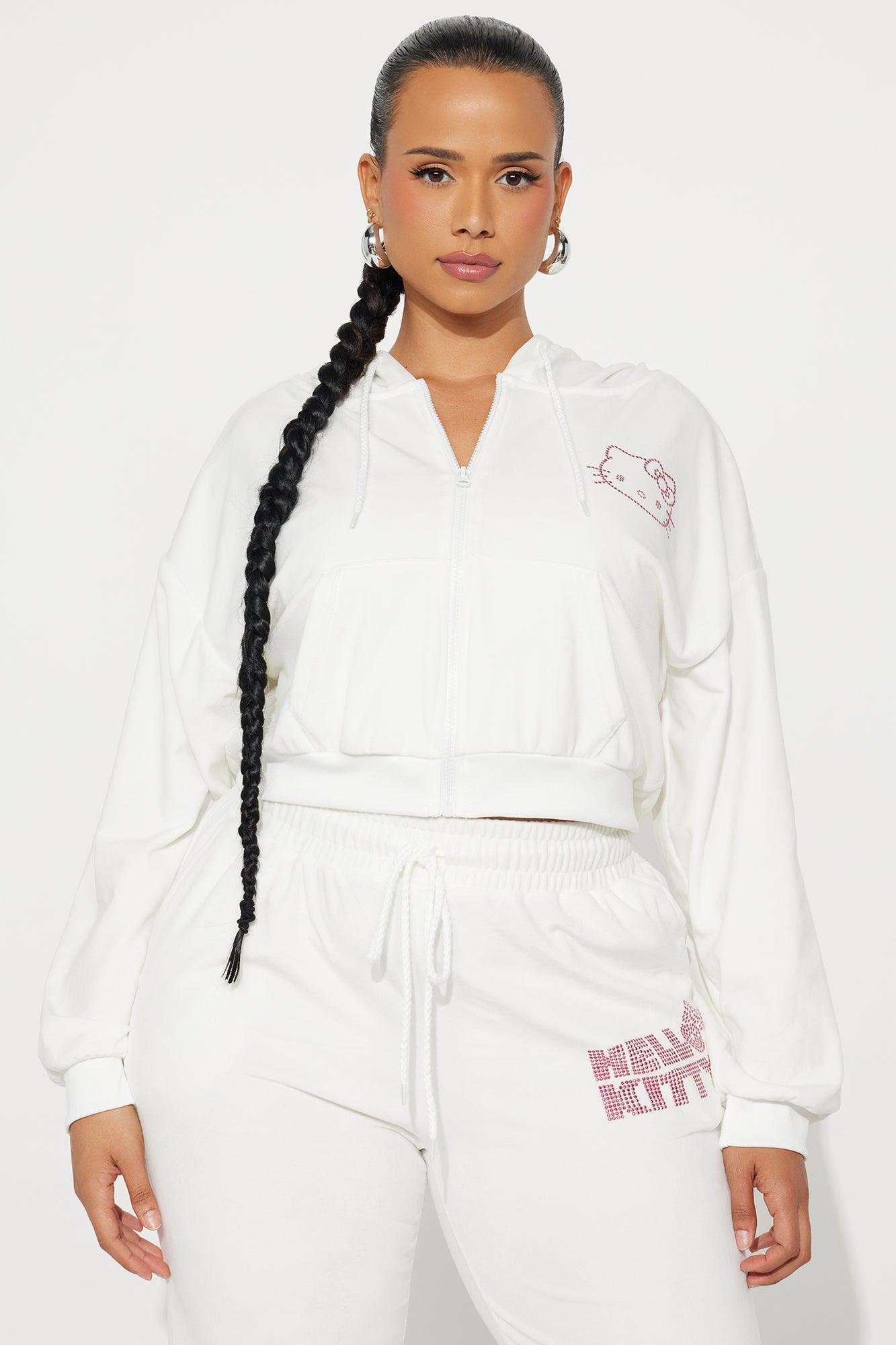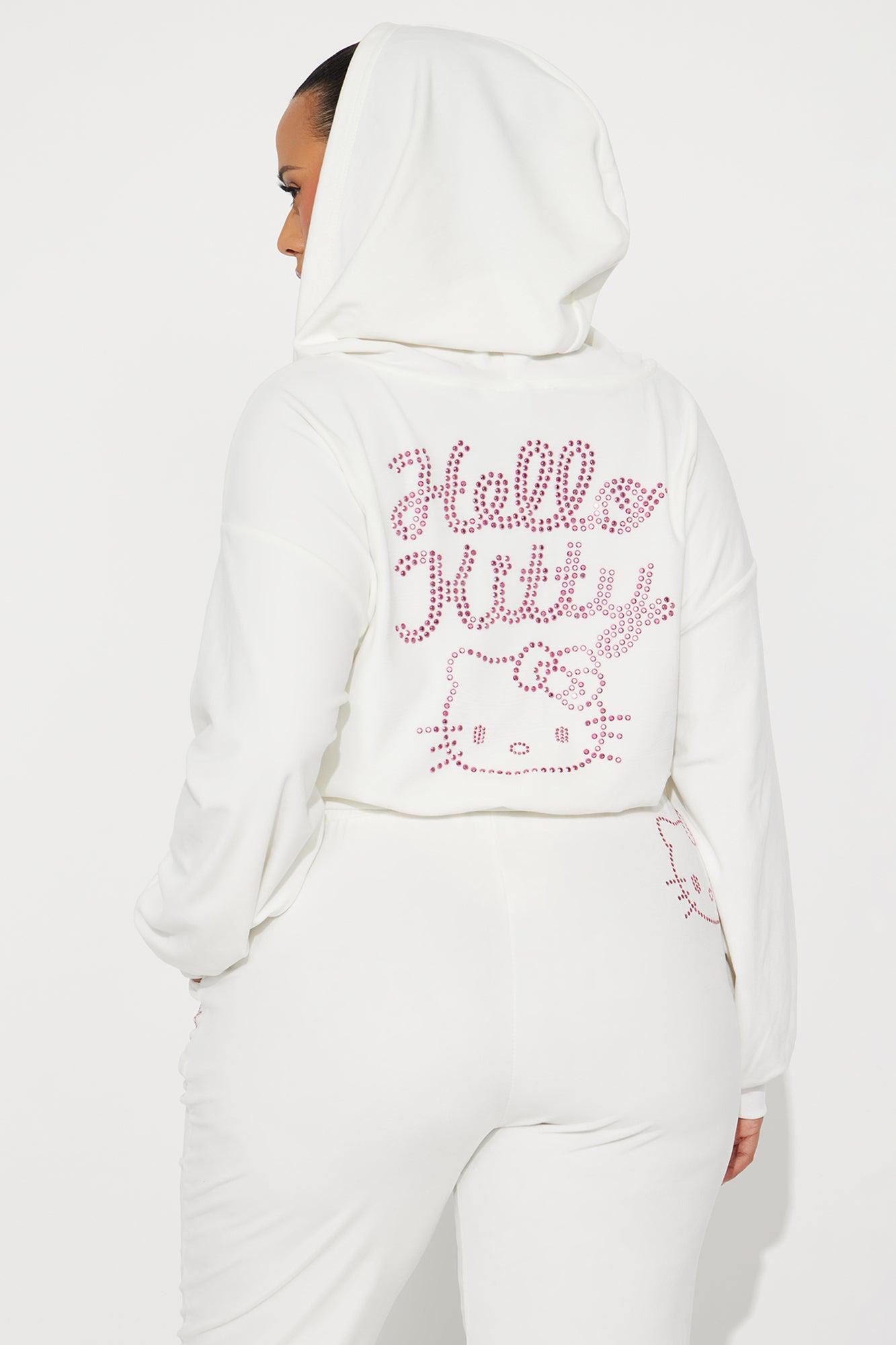 Available In White. Hoodie Front Zip Front And Back Screen Rhinestone Detail Hello Kitty Graphic Stretch Pair To "Hello Kitty Rhinestone Velour Pant" 94% Polyester 6% Spandex Imported