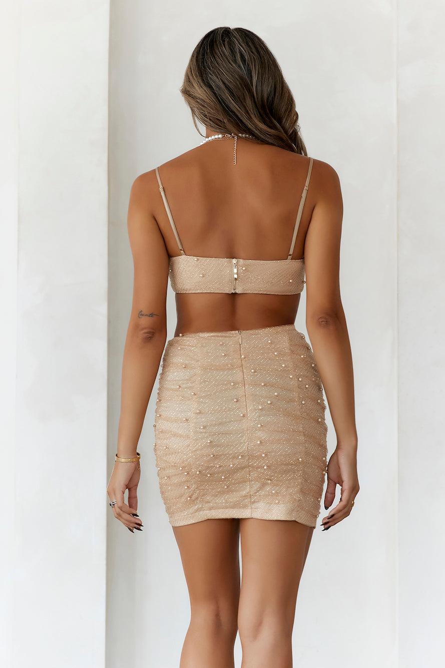 Length from top of bust to hem of size S: 12cm. Crop top. Lined. Model is a standard XS and is wearing XS. True to size. Non-stretch fabric. Underwire. Glitter. Mesh. Pearls, removable chain. Zipper. Cold hand wash only. Polyester/Spandex. Please note: This style is exclusive to HELLO MOLLY Glitter, girl! The HELLO MOLLY Charming Crop Top features a glitter and mesh design with pearls including a pearl chain that can be removed. Style with the matching skirt and heels for all the attention.