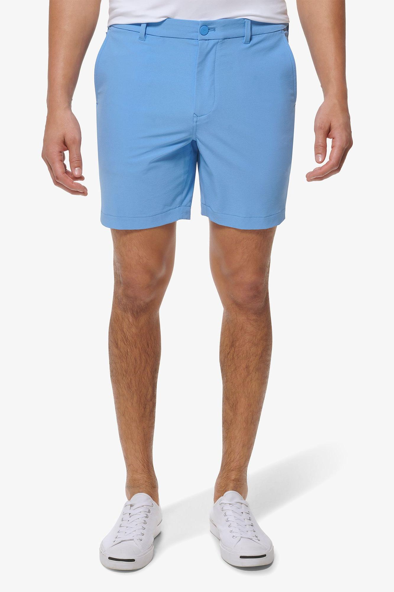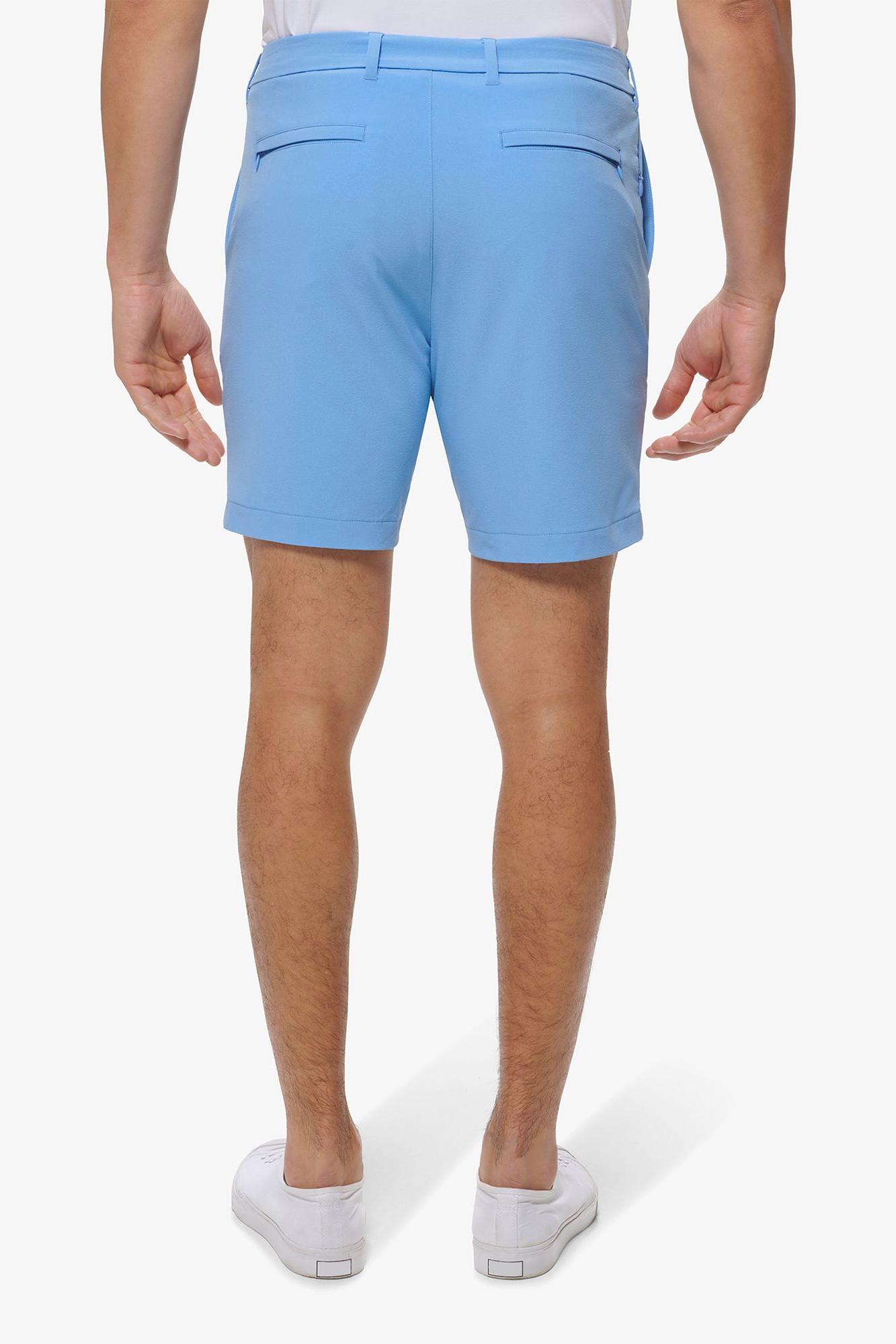 4-way stretch Moisture-wicking Wrinkle-resistant Mesh pocketing Back pocket zip closure Stretch waistband 8" inseam Fabric Contents: Polyester 88%, Spandex 12% Care Machine wash cold Low heat tumble dry