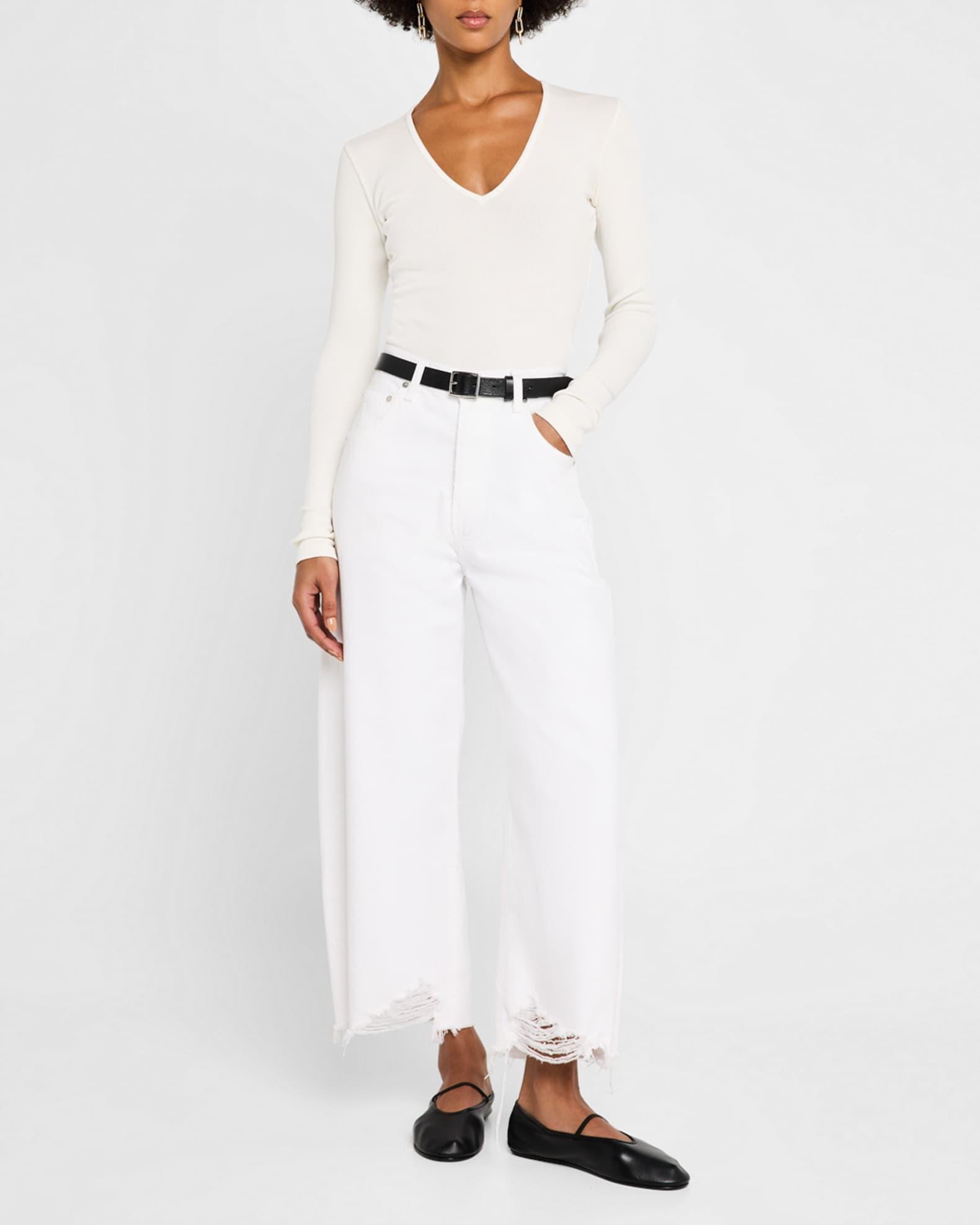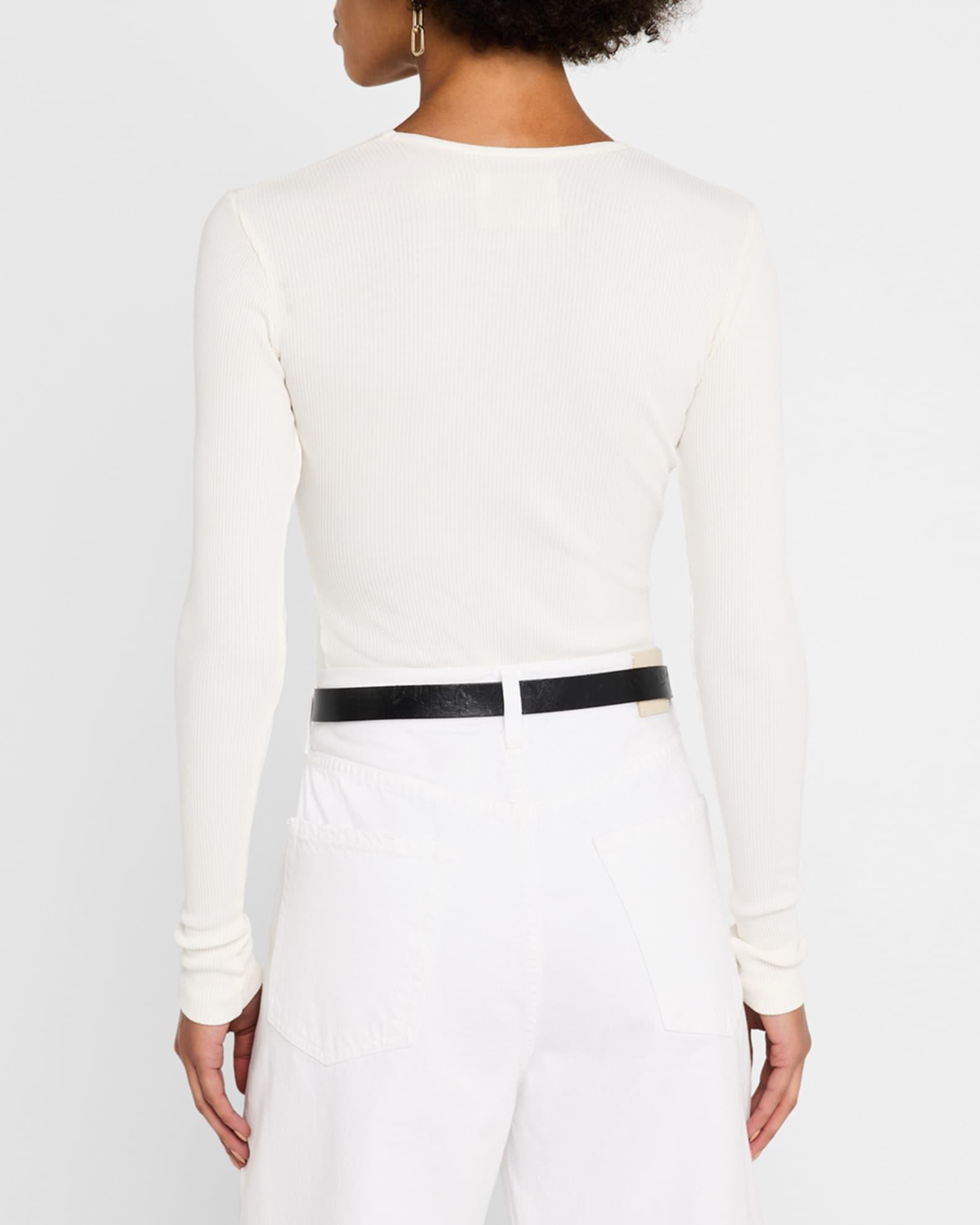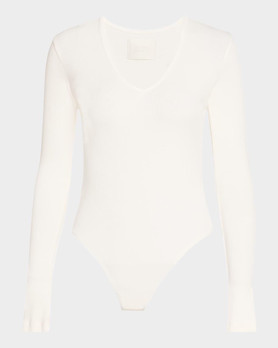Citizens of Humanity "Helsa" ribbed knit bodysuit Deep V neckline Long sleeves Fitted Snap-gusset closure Cotton/Tencel® lyocell/spandex Made in USA