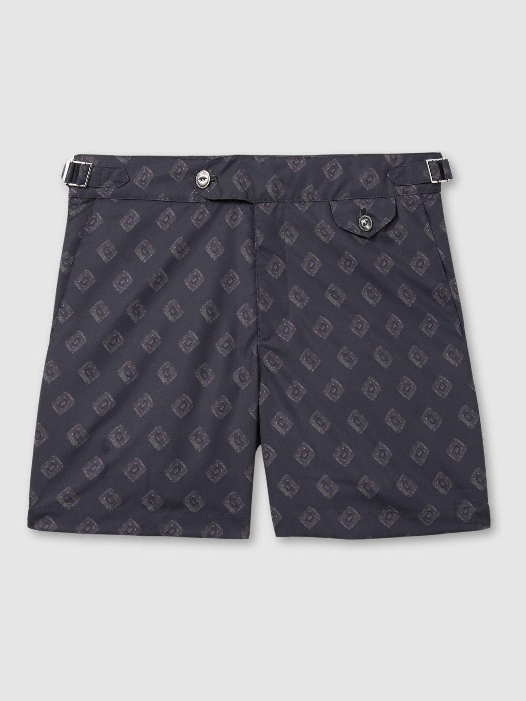 The Clipper swim shorts are hemmed just above the knee, making them a flattering poolside choice. Printed with mosaic-inspired diamonds, they re finished with buckled waist adjusters, slip pockets and a comfortable mesh-brief lining. Buckled side adjusters. Slip pockets. Hanging loop. Mesh-brief lining. Concealed front zip. Hemingsworth, curated by Reiss, is an English-made swimwear range, tailored for the modern globetrotter.