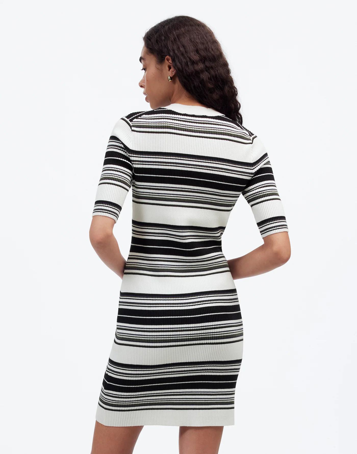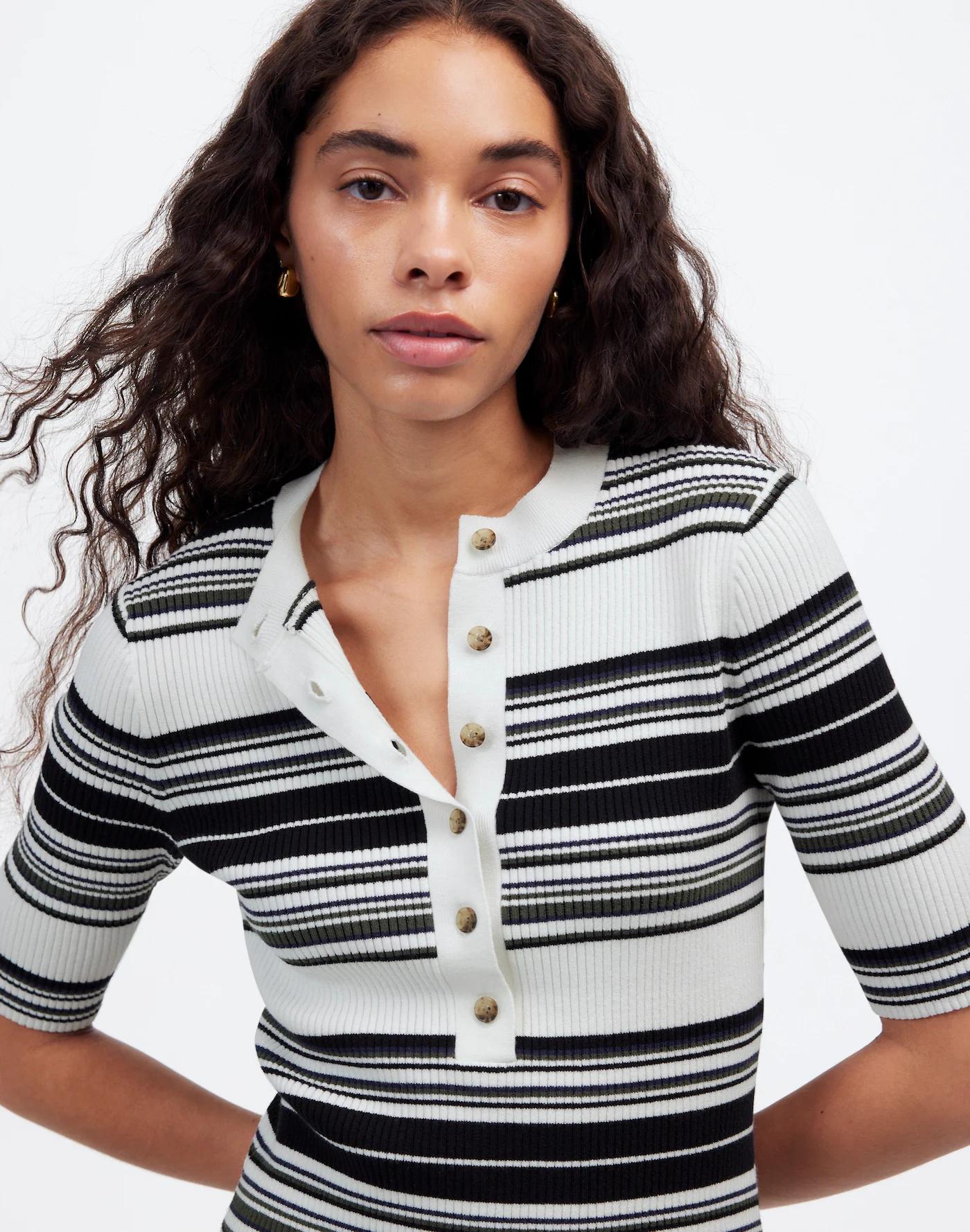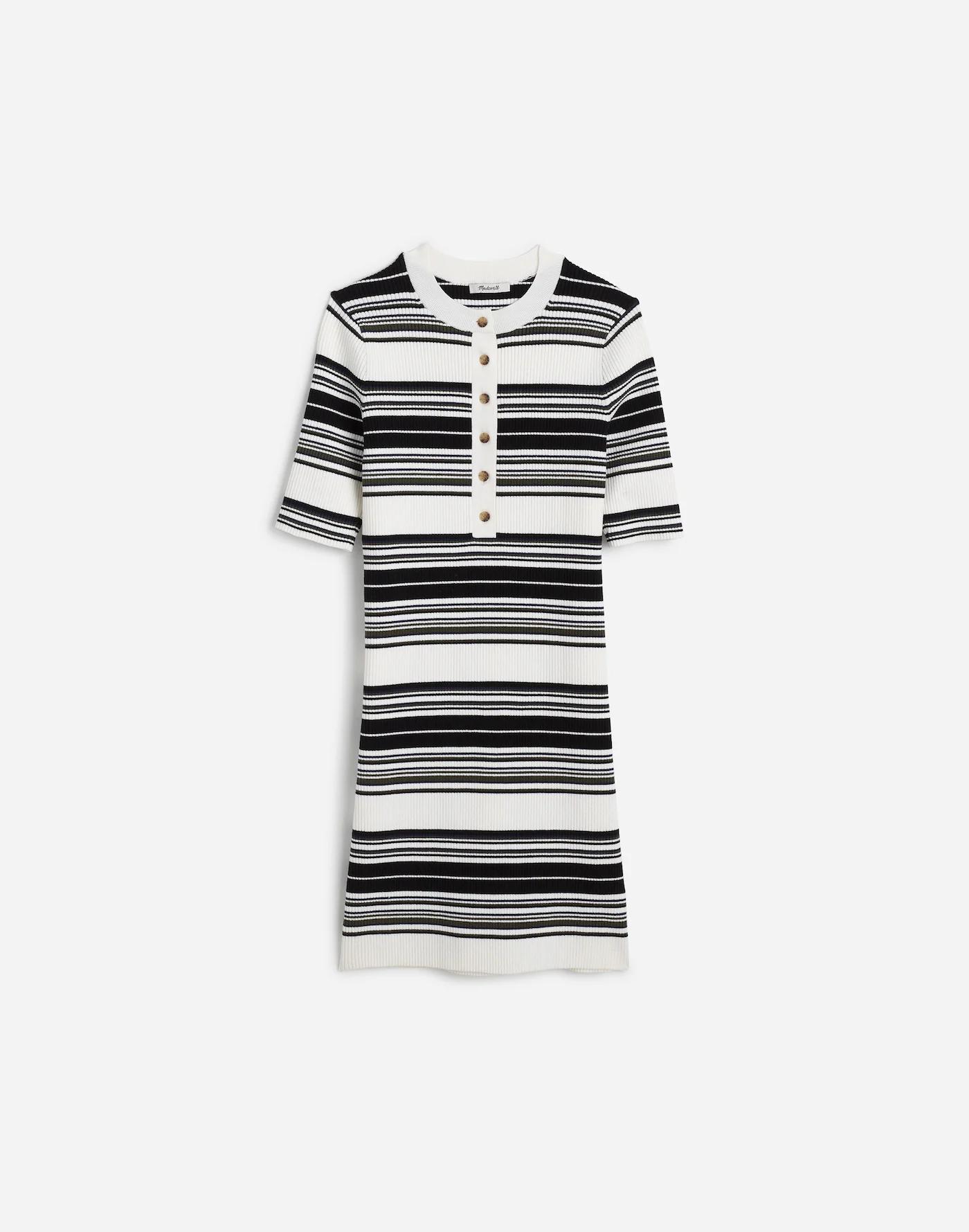 Crafted from soft 100 percent cotton, this striped sweater dress features a classic henley collar and short sleeves. Whether paired with flats for a polished office look or boots for casual outings, it's an effortless choice for any occasion.