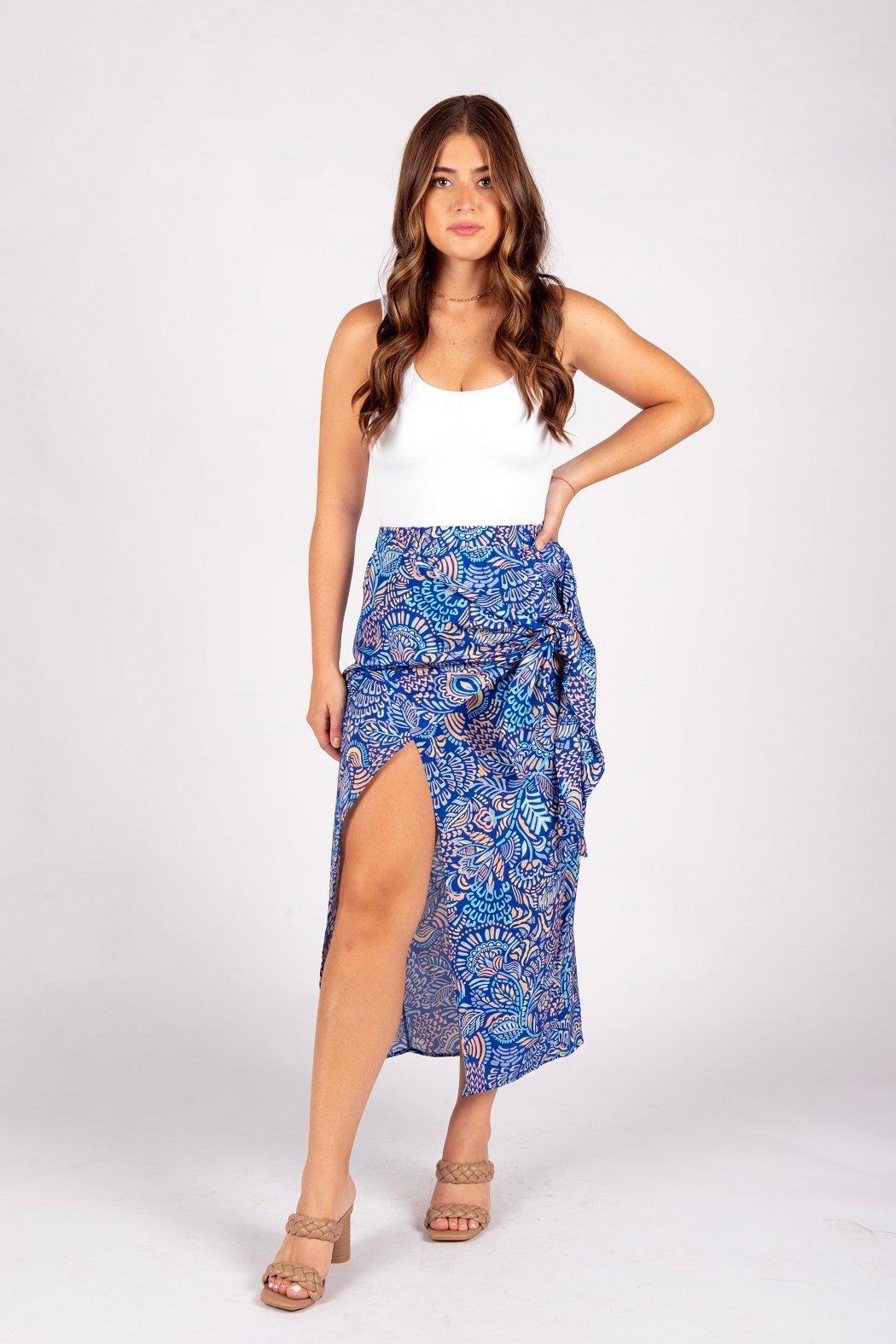 Elevate your summer wardrobe with this striking blue wrap skirt, featuring a vibrant floral-inspired print in shades of blue, peach, and cream. Designed with a flattering high slit, this skirt offers both a breezy, feminine style and a touch of sophistication. The self-tie waist detail enhances the figure while ensuring a comfortable, adjustable fit. Perfect for beach days, casual outings, or tropical vacations, this lightweight skirt pairs effortlessly with a simple tank or blouse for a chic look.
