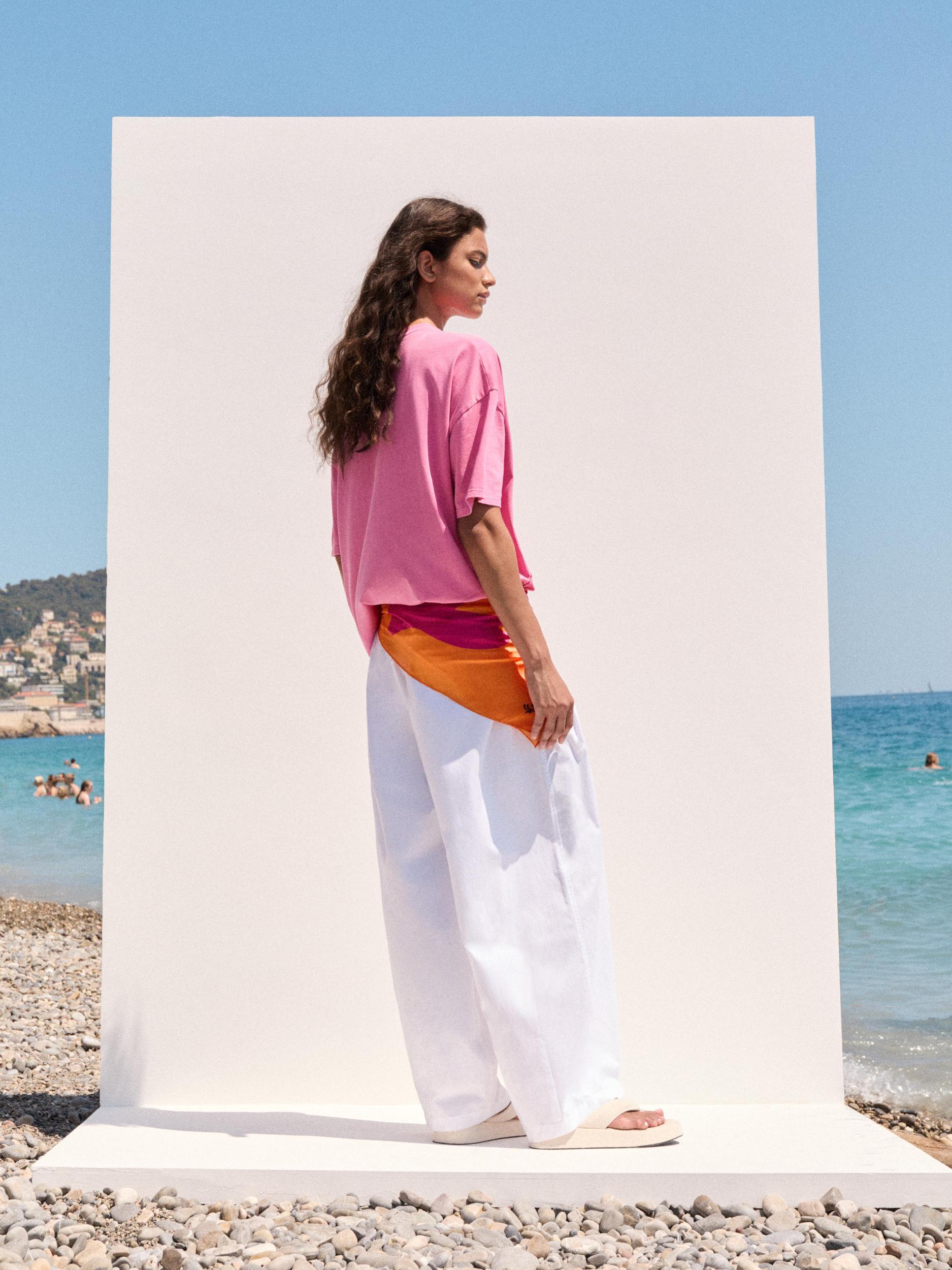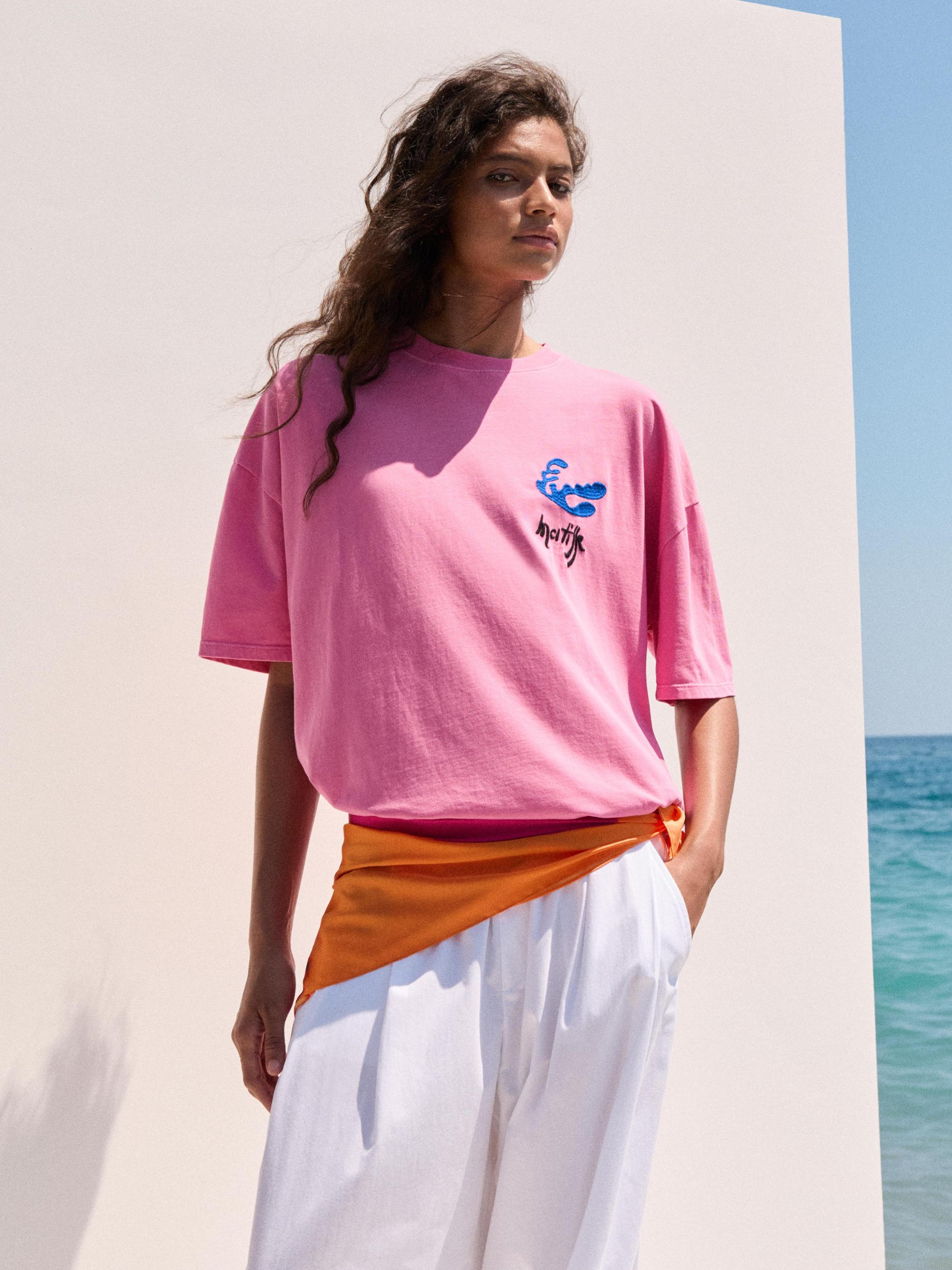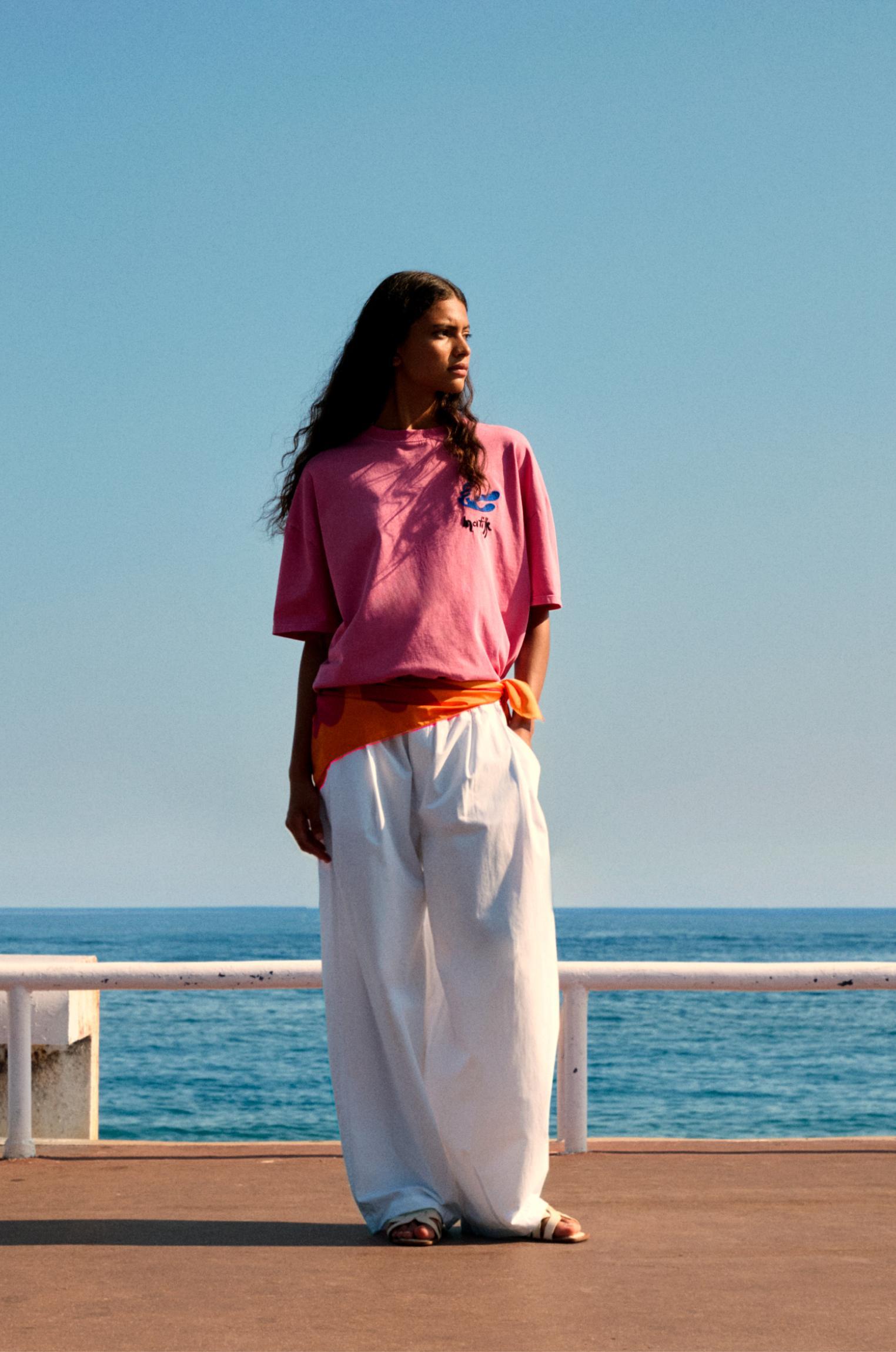 Henri Matisse license pink T-shirt with contrast embroidery on the front inspired by the painting “Le Lagon, from Jazz, plate XIX, 1947”, short sleeves, a crew neck, an oversize silhouette and made of cotton. Pull&Bear Collection Shapes of Summer inspired by Henri Matisse.