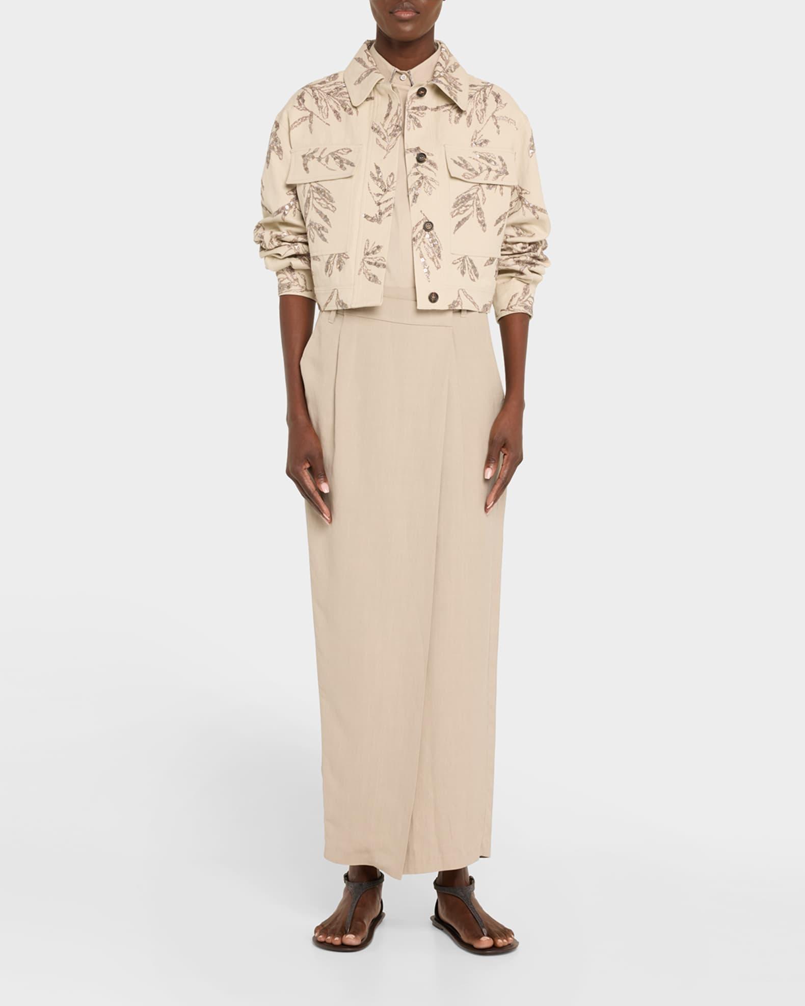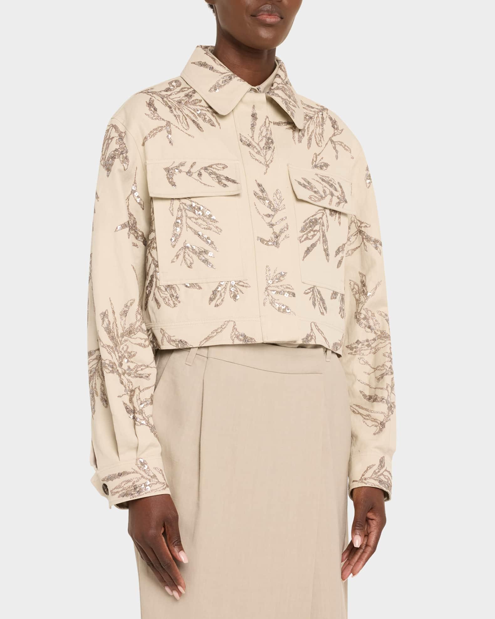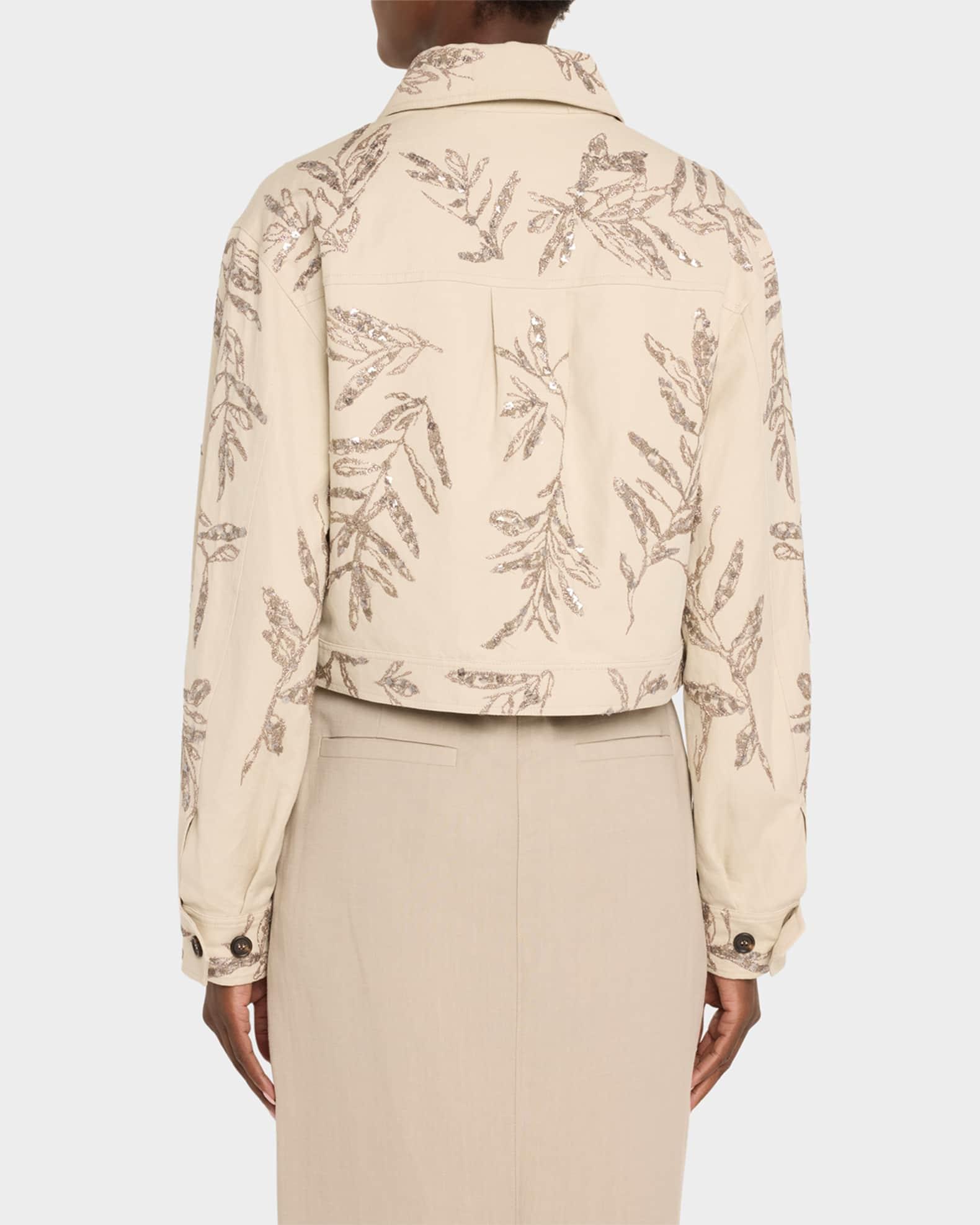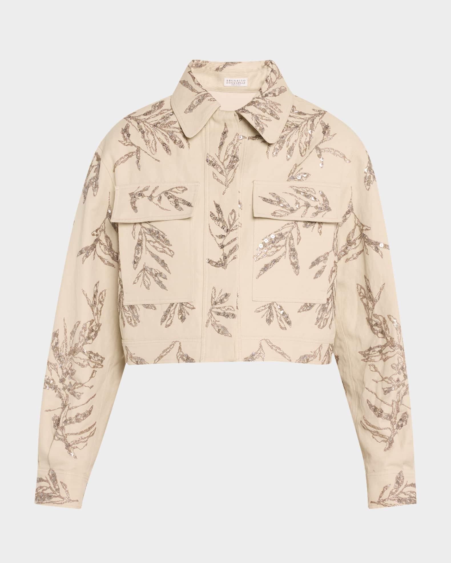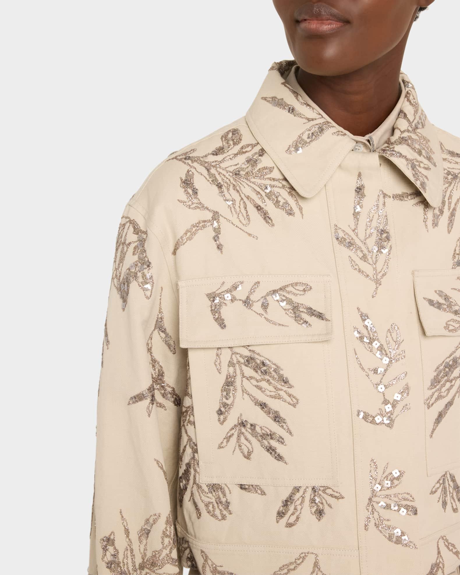 Brunello Cucinelli structured canvas shirt jacket featuring herbarium paillette embroidery Spread collar; concealed button front Long sleeves; button cuffs Yoked back; box pleat Chest flap pockets Boxy fit Cropped length Cotton/linen Lining: Acetate/silk Made in Italy