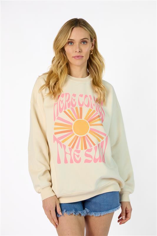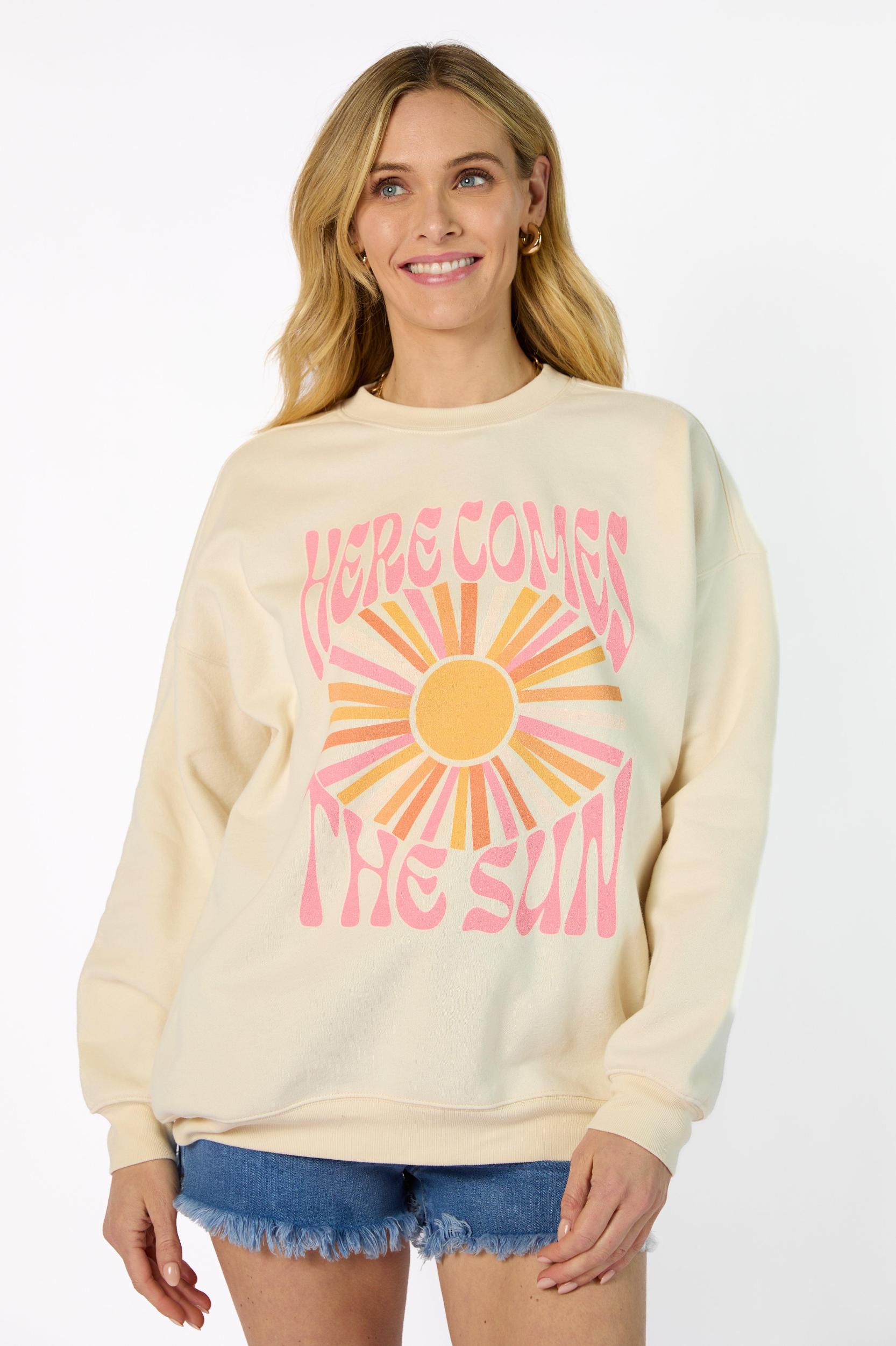 Details Cream crewneck with sun burst design Relaxed fit, runs slightly oversized Crew neckline, long sleeves Size small from shoulder to hem: 26" Material and Care Pink Lily Exclusive Sweatshirt 57% Cotton/43% Polyester Hand wash cold, no drum drying Patterns may vary Materials may have natural variations Colors may vary from different viewing device PLEASE NOTE: You may notice some off-white residue or slight discoloration when you first receive your shirt. Please do not worry! This comes from the special solution we use for printing the design on your shirt. It can sometimes leave marks during the drying process. These are not stains and will wash off after the first wash cycle. To keep your shirt's design as beautiful as possible, we do recommend washing this garment inside out on the gentle cycle with cold or lukewarm water. You can either tumble dry low or line dry.
