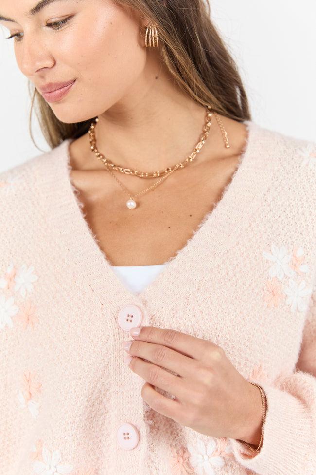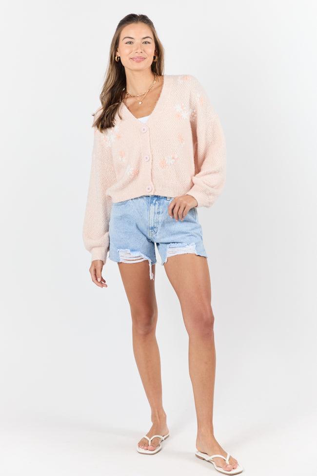 Details Floral Cardigan Pink Fabric is very stretch V-neckline, ribbed hem, embroidered flowers, functional button up closure Unlined Size small from shoulder to hem: 18.5" Material and Care 75% polyester 25% nylon Hand wash cold, line dry Patterns may vary Materials may have natural variations Colors may vary from different viewing devices.