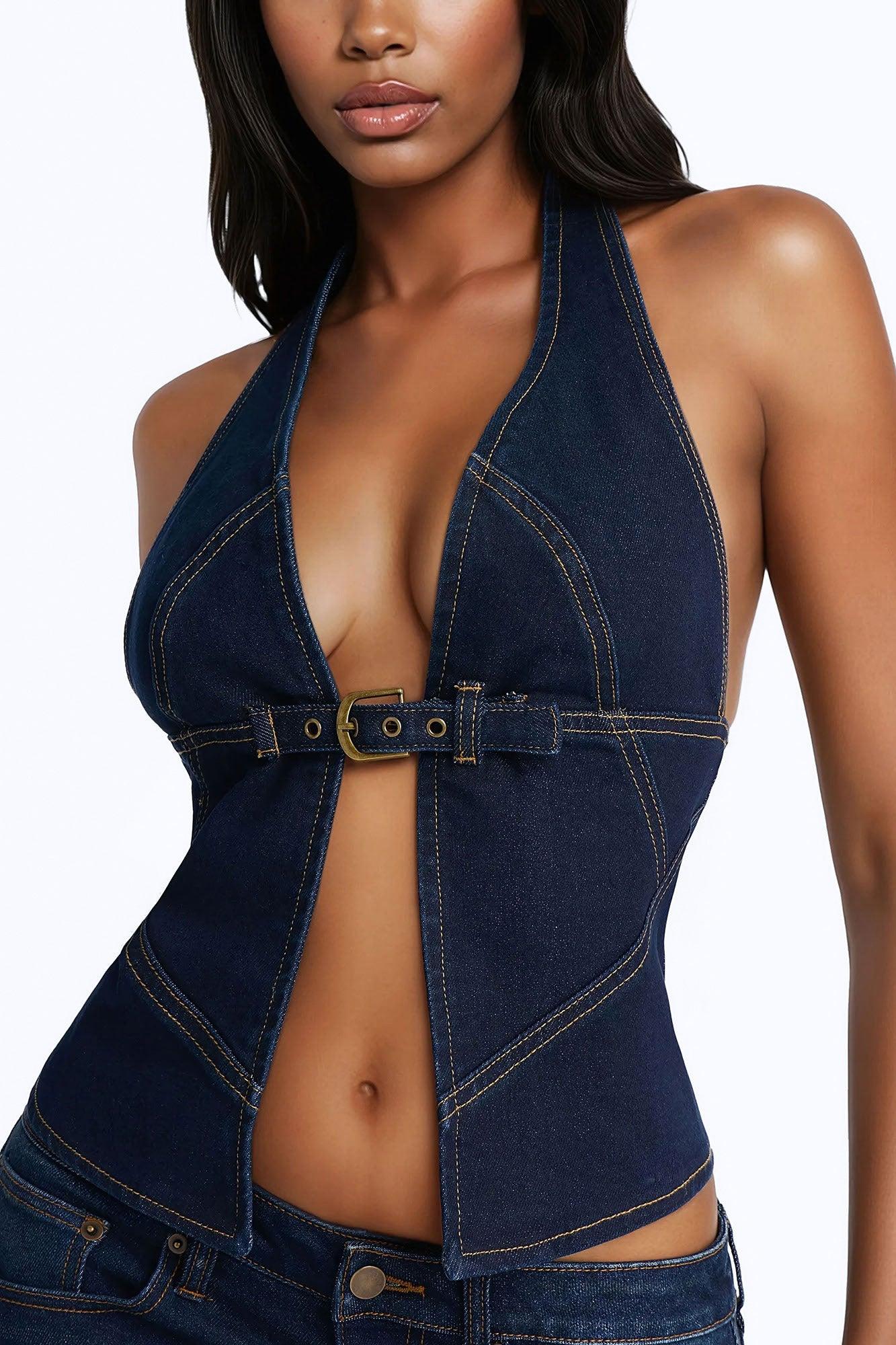 Available In Dark Wash. Halter Top Denim Dark Wash Front Buckle Detail Non Stretch 72% Cotton 27% Polyester 1% Spandex Disclaimer: Due To The Specialized Wash Process, Each Garment Is Unique. Imported California Proposition 65WARNING: Cancer and Reproductive Harm - www.P65Warnings.ca.gov.