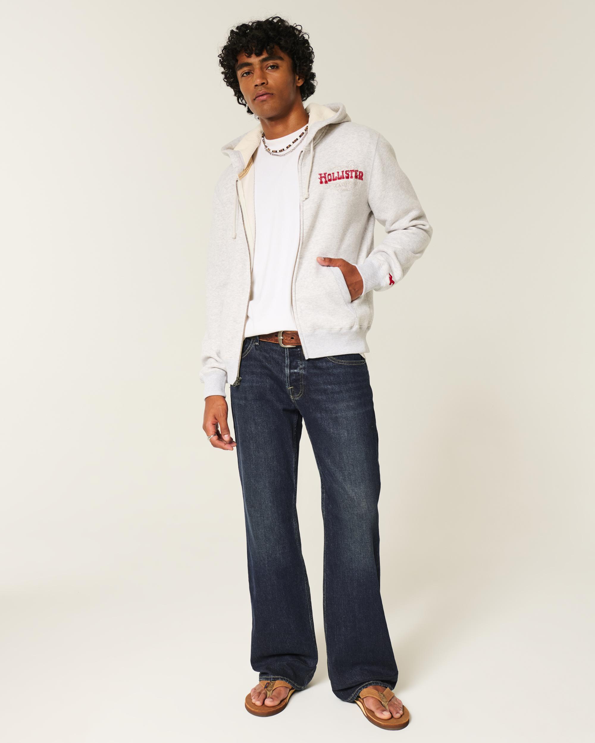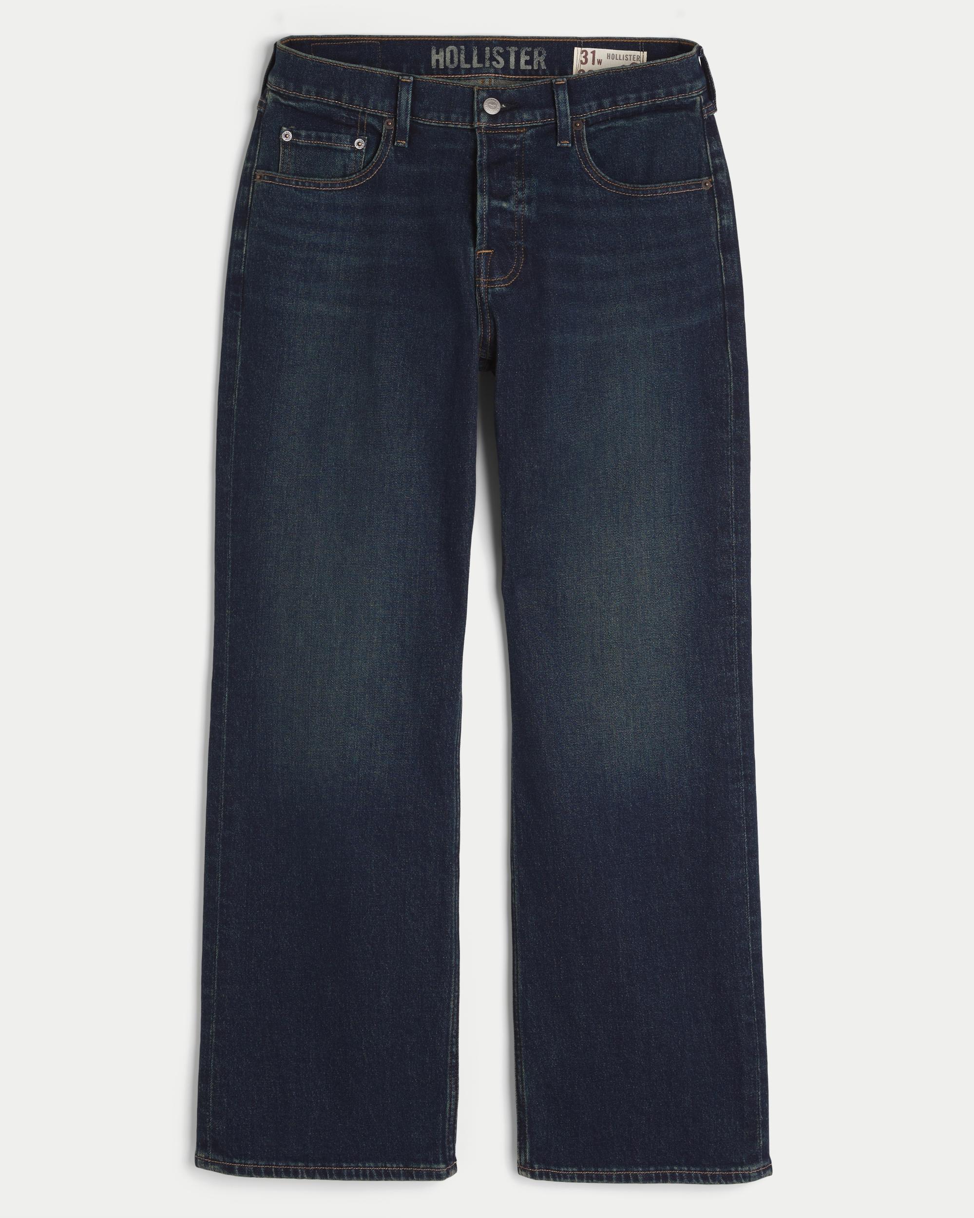 Comfortable denim jeans designed with a relaxed leg and boot opening. Dark wash with fading and whiskering. Button fly. Trend drop.