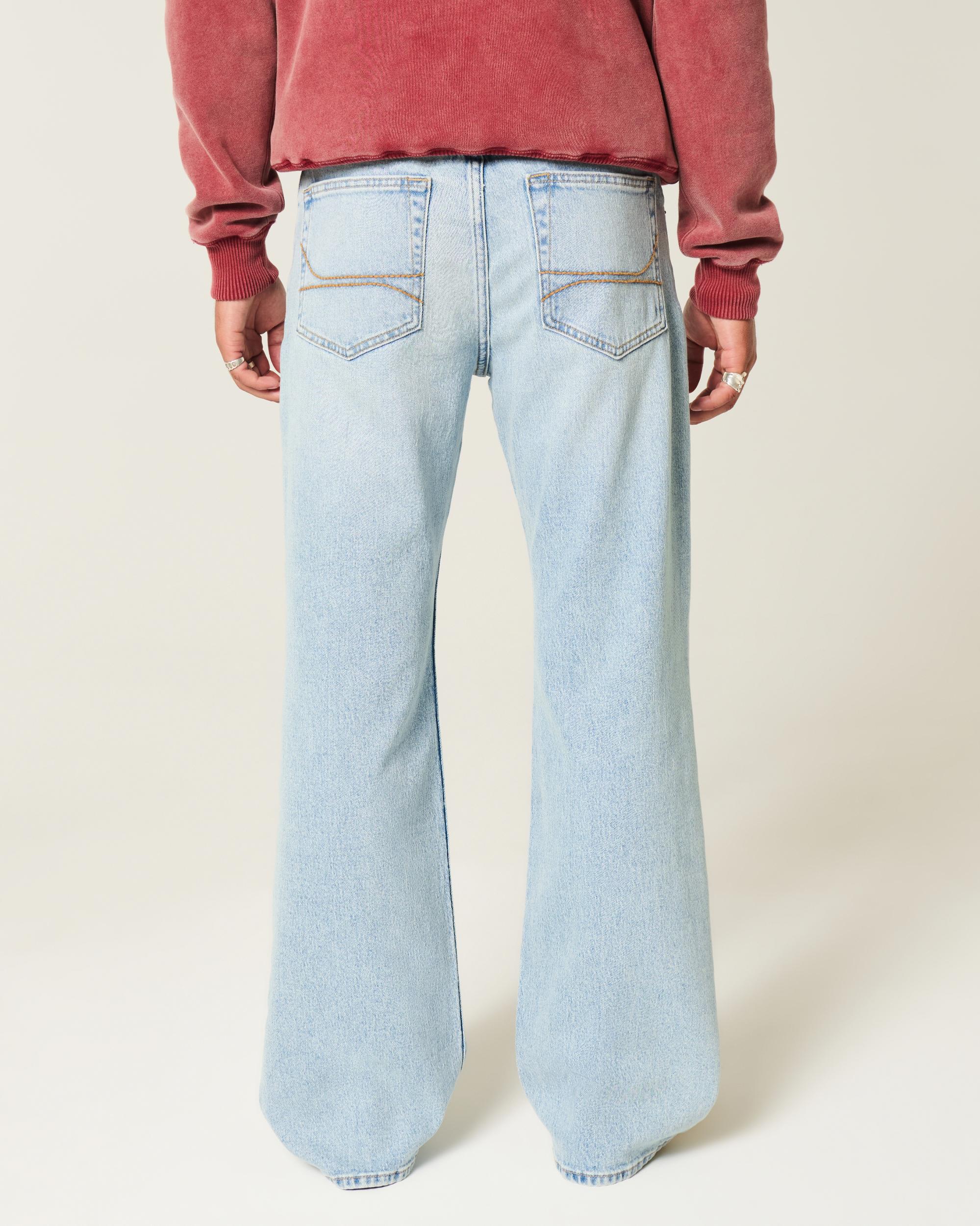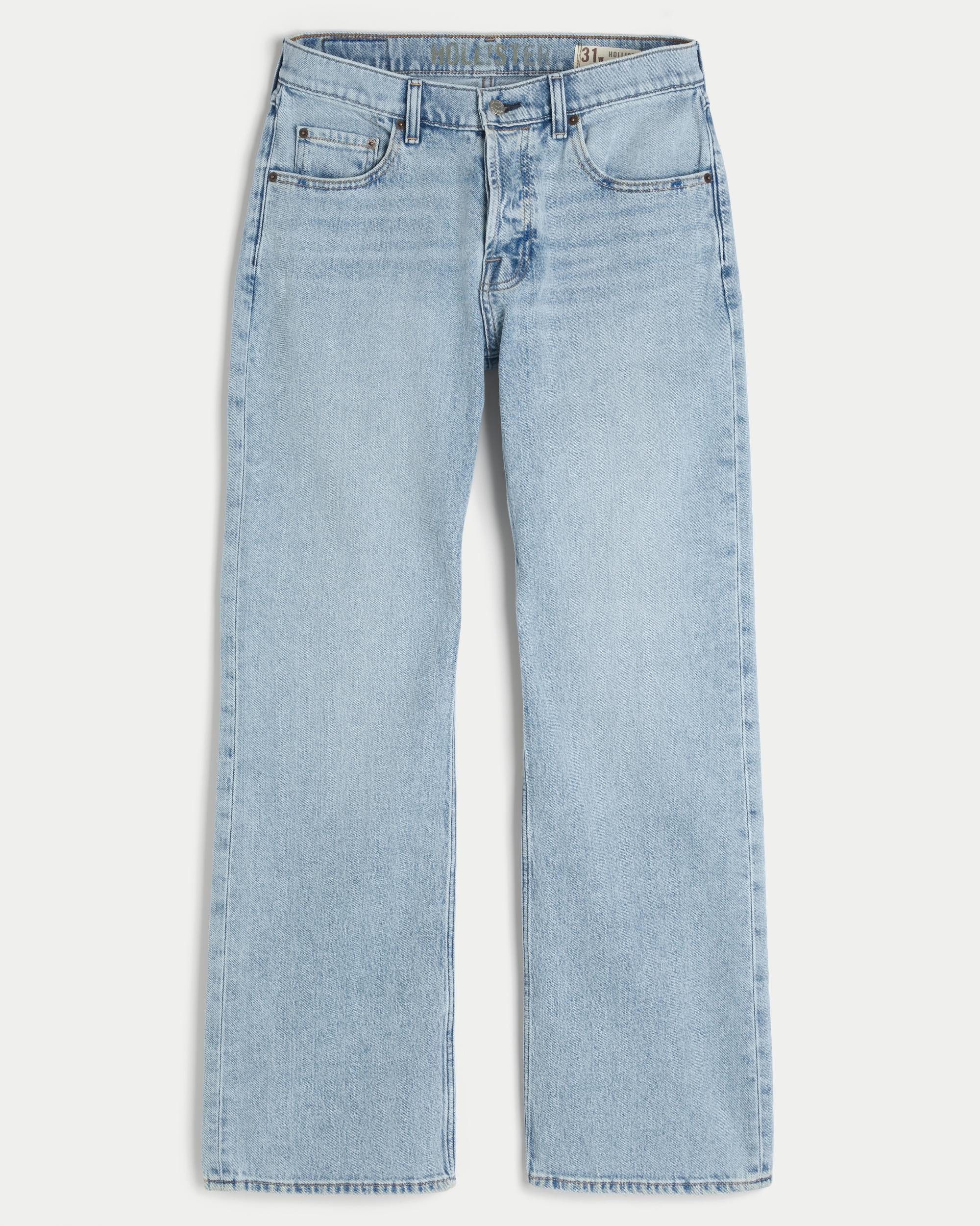 Comfortable denim jeans designed with a relaxed leg and boot opening. Fading and whiskering. Button fly. Trend drop.