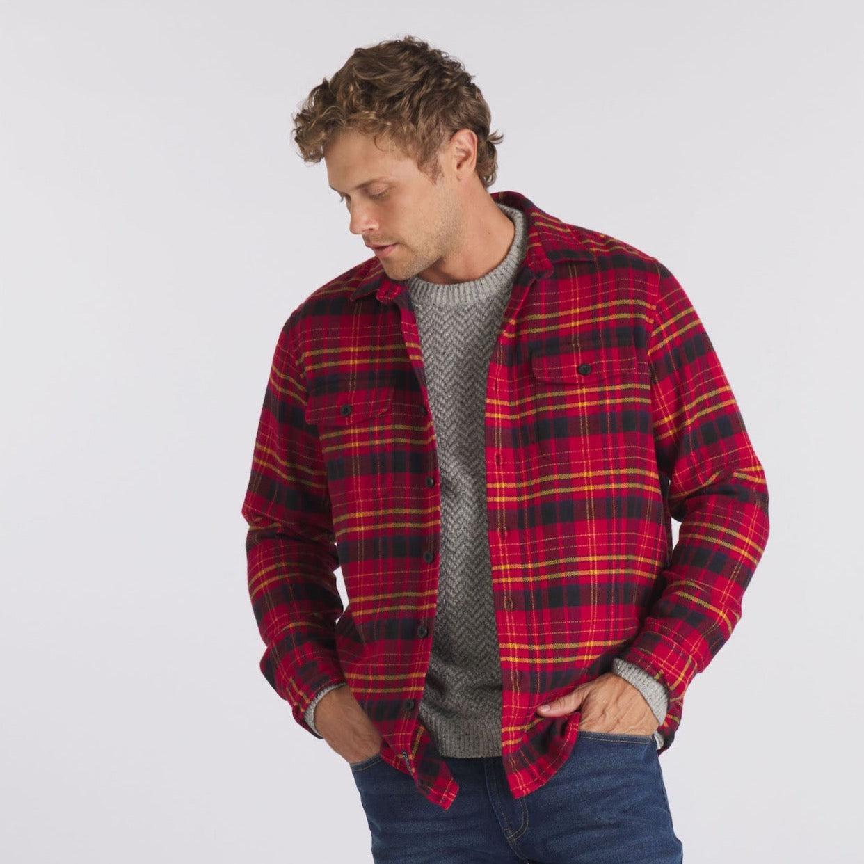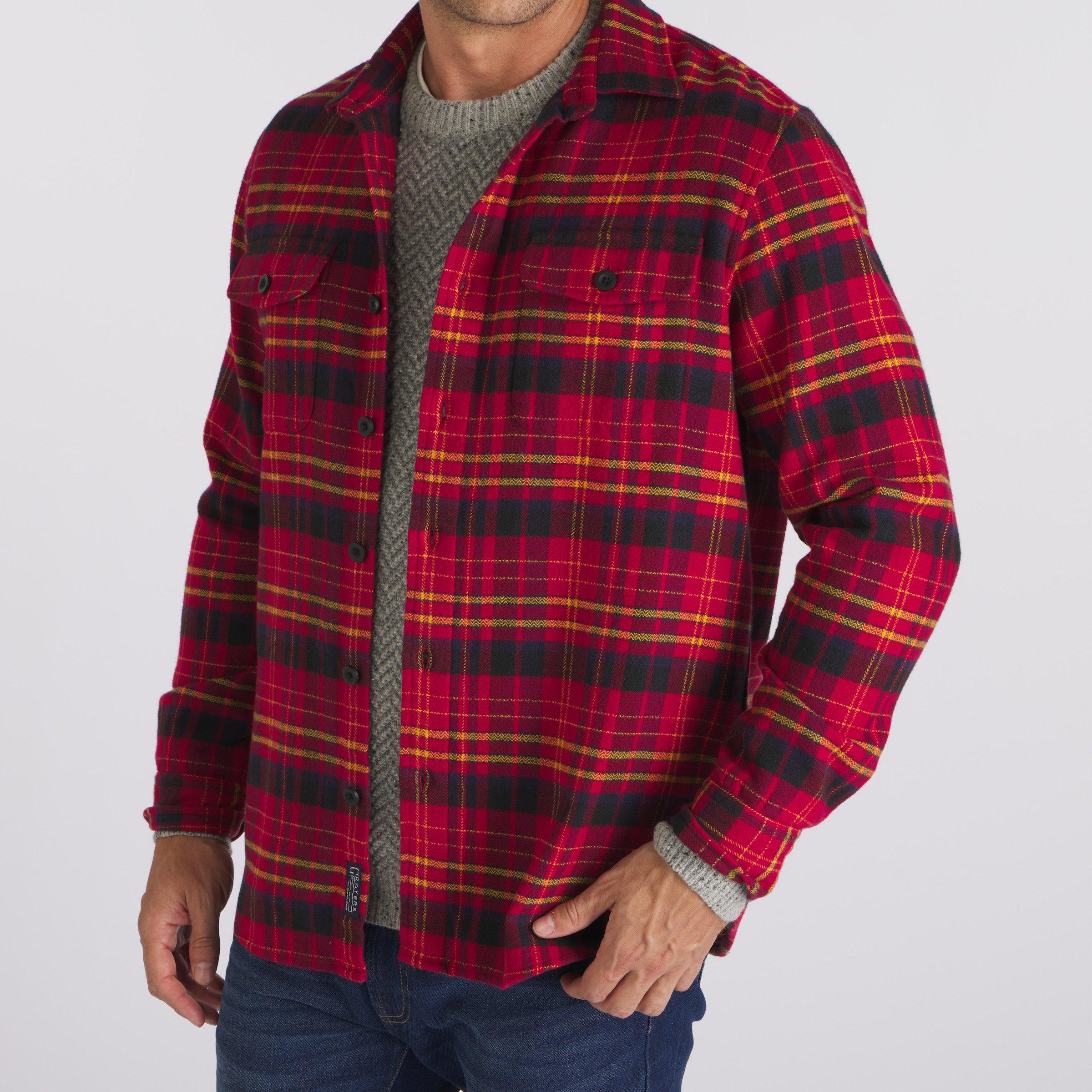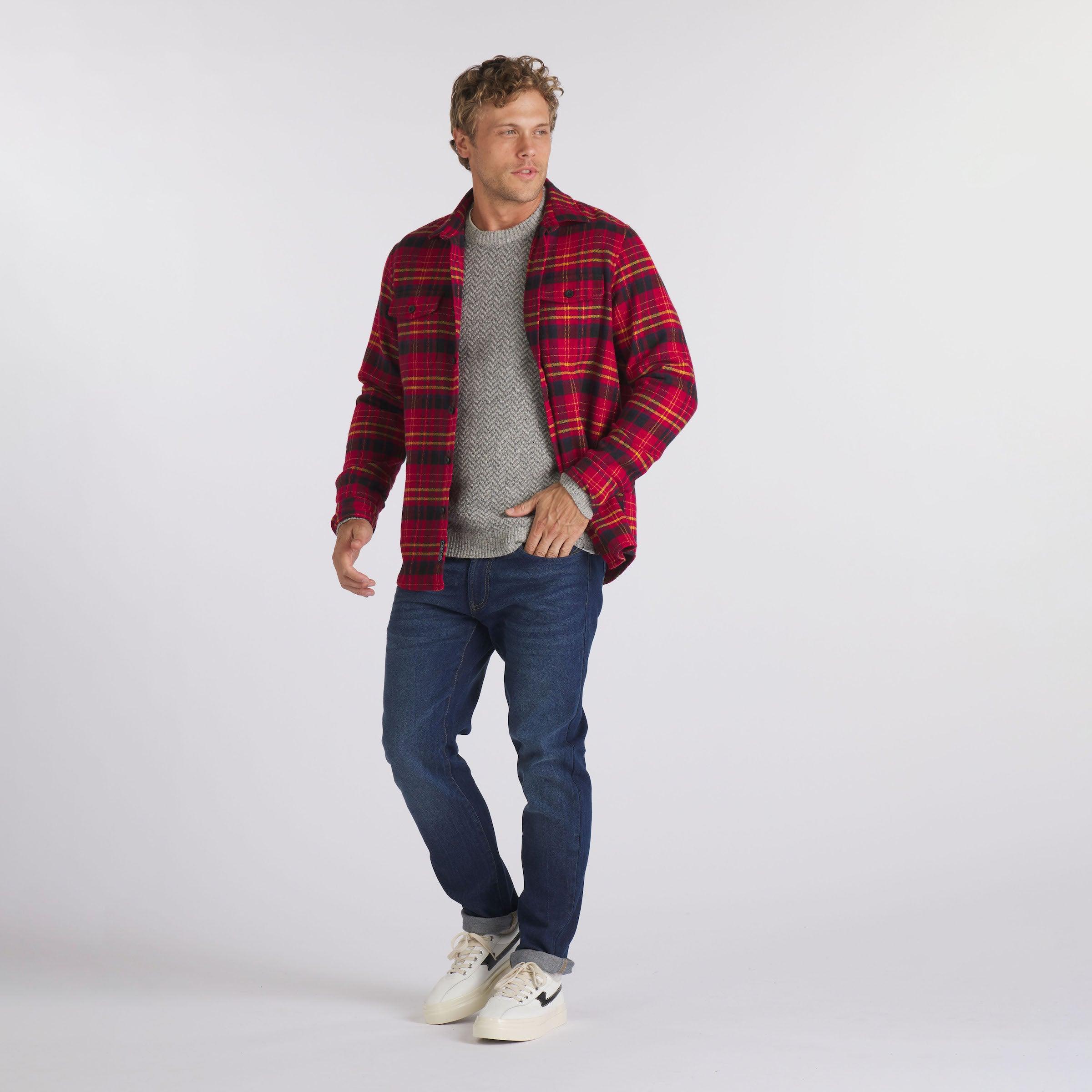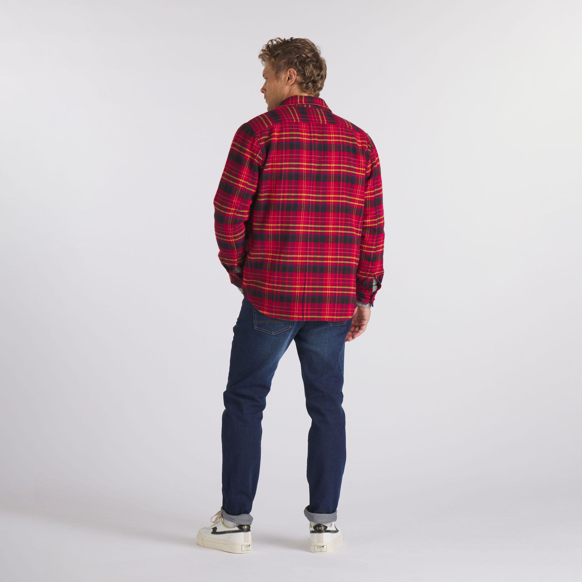 We came across this retro textured fabric on a visit to one of our favorite purveyors of all things vintage. We won't give away the source but lets just say its a gem of a place in the Pacific Northwest. We took a cross-weave inspiration, wove it into our herringbone pattern and pitched it with an array of retro primary colors- think 1960's Technicolor. Great with denim and chinos. The Model is also wearing: Zermatt Herringbone Crew - Gray Herringbone and Edward Stretch Straight Fit Denim - Blue Wash. Model: Chris is wearing size medium and is 6'. ----Details---- Workshirt body with two patch button through flap pockets Spread collar Military style flat buttons Imported ----Materials---- 100% Cotton ----Size & Fit---- Measuring Method: All measurements are in inches and based on a flat garment, as shown below. For comparison with one of your existing garments, please lay garment on a flat surface and follow the key measurement points. For chest and neck, if you double the flat measurement, you will get close to the full body measurement. ----Care---- Machine Wash Warm With Like Colors Do Not Bleach Tumble Dry Low Use Cool Iron If Necessary
