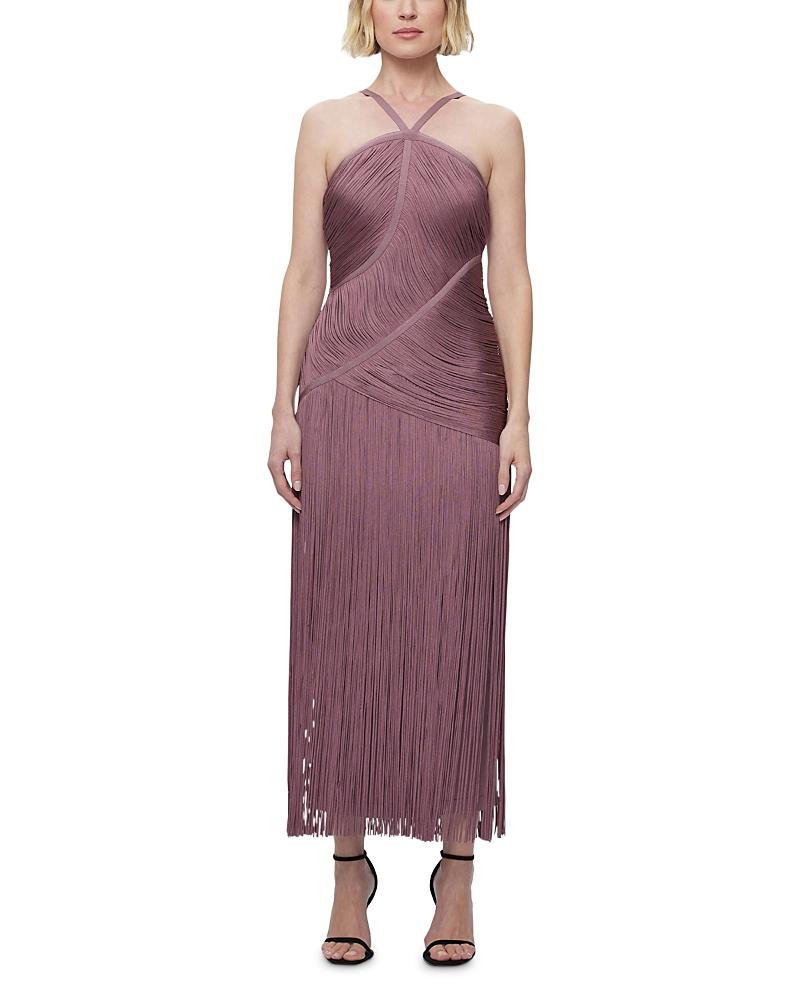 This HERVE LEGER gown is a stunning floor-length creation crafted of the brands iconic bandage fabric, known for its body-shaping properties. The gown features a gracefully curved neckline and is adorned with signature fringe, draped on the bodice and cascading over the gown-length lining. Halterneck Sleeveless Back zip closure 90% rayon/9% nylon/1% spandex Combo: 100% polyester Dry clean Imported SIZE & FIT About 56 from shoulder to hem Model measurements: 510 tall Model is wearing a US size Small. Designer Evening - Herve Leger > Herve Leger > Saks Fifth Avenue > Barneys. HERVE LEGER. Color: Mauve. Size: XL.