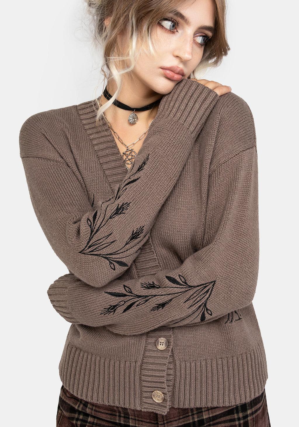 Nothing lasts forever - Grey floral rabbit skeleton embroidered knit cardigan - Relaxed fit in a regular length - V-neckline & comfy long sleeves - Buttoned front features mock horn buttons - Warm grey-beige cotton & wool blend knit fabrication - Black flora, moon & skeletal rabbit embroidery on front & sleeves - A little morbid, a little cute (just how we like it) 60% cotton, 30% nylon, 10% wool Tanya is 5'5" and wearing a size S
