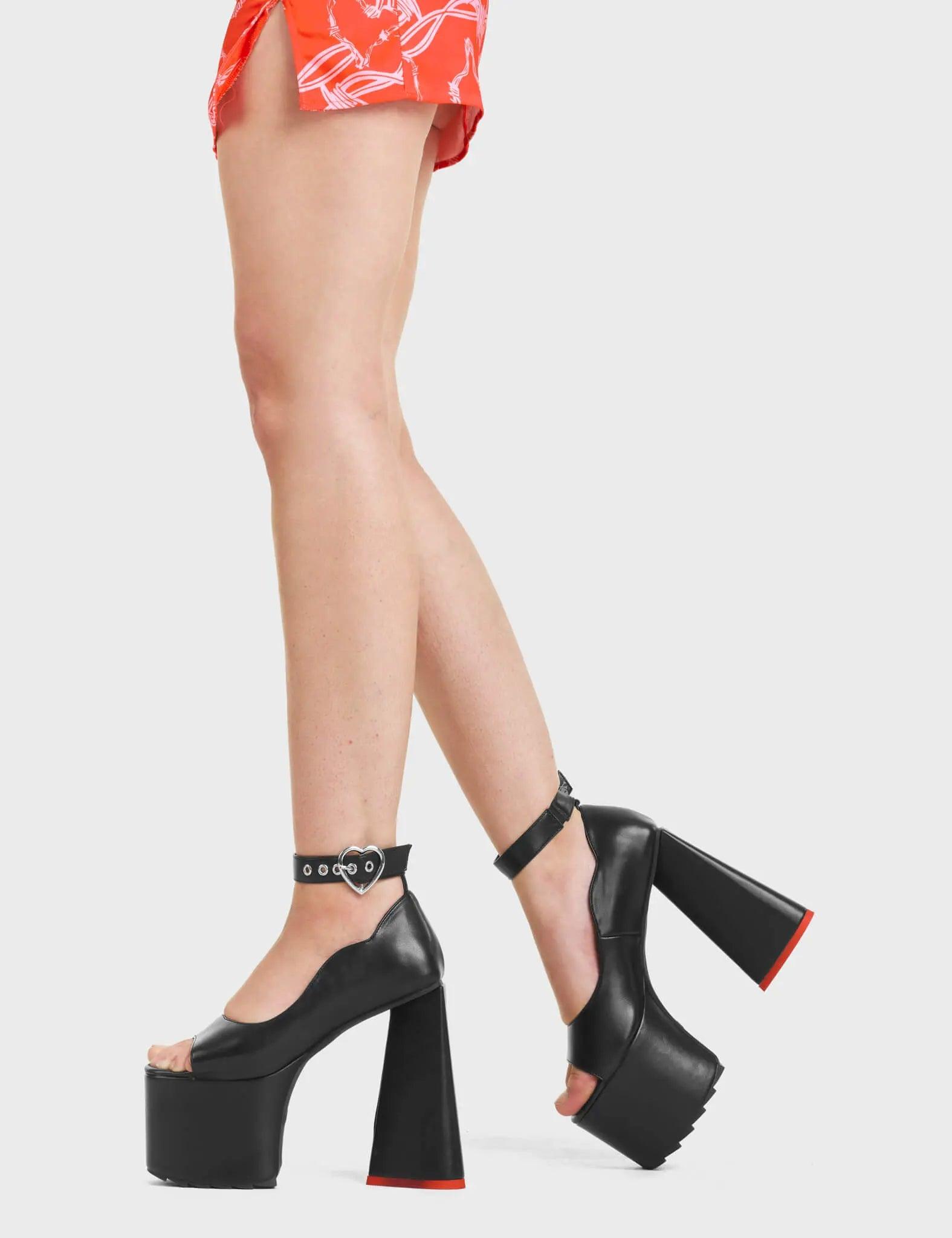 COMFY AND CUTEHey Lover Platform Sandals in Black. These Chunky Sandals feature a round toe and and an adjustable heart shaped ankle strap, also features a red heart shaped heel. Made with eco-friendly materials and 100% cruelty-free.- Platform Height- Chunky platform- Open Rounded Toe- Adjustable heart shaped ankle strap- Heart shaped heel- 100% veganSKU: LMF 4588 - BlackPU