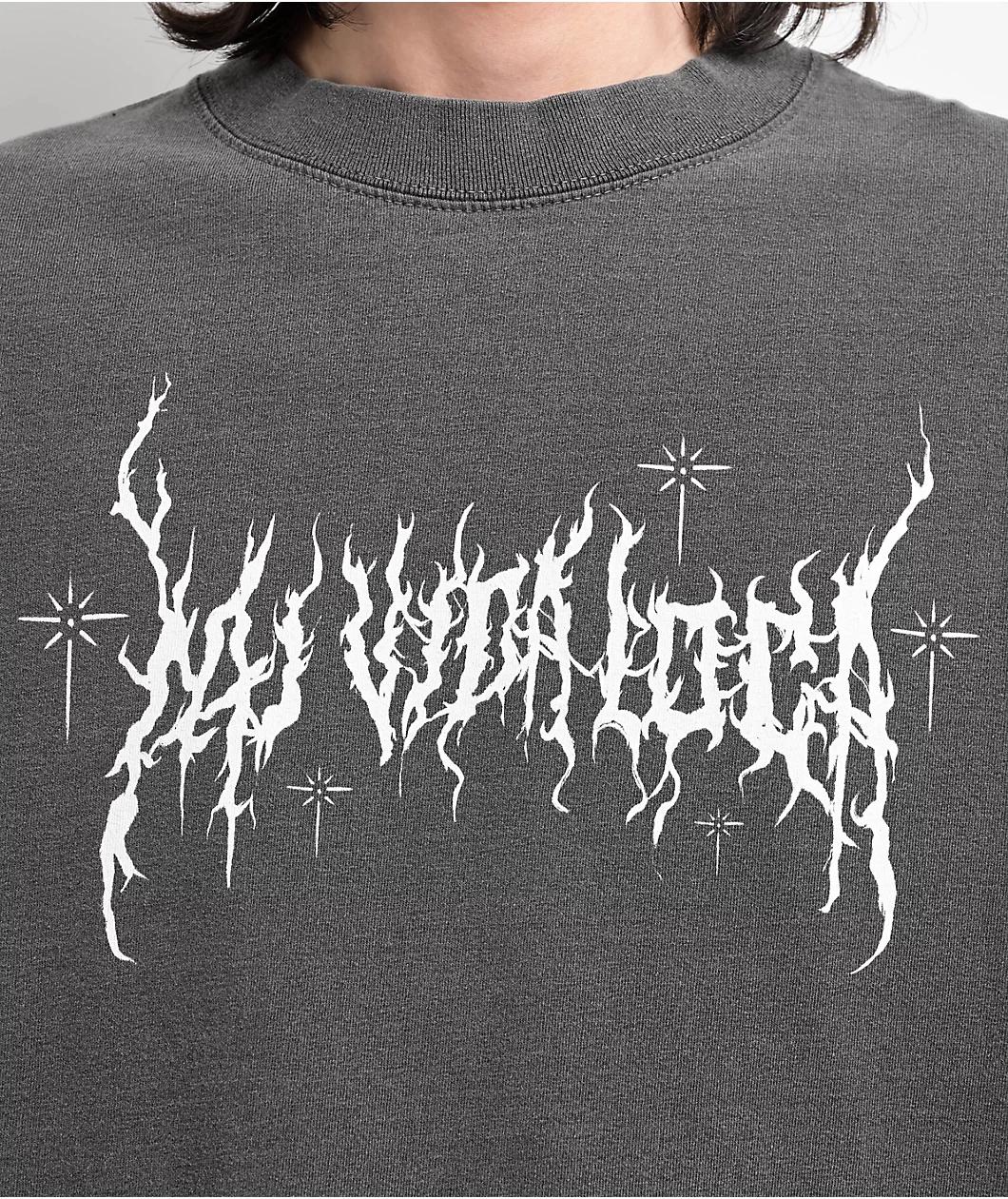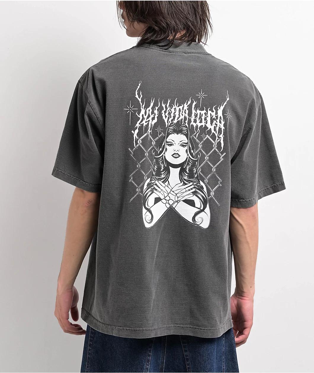 Latinx brand Hey Ruca presents the Mi Vida Loca t-shirt in a charcoal color with edgy counterculture cyber sigilism designs printed on the chest and back. With the shirt's title printed on the front translating to "My crazy life" in English, the back