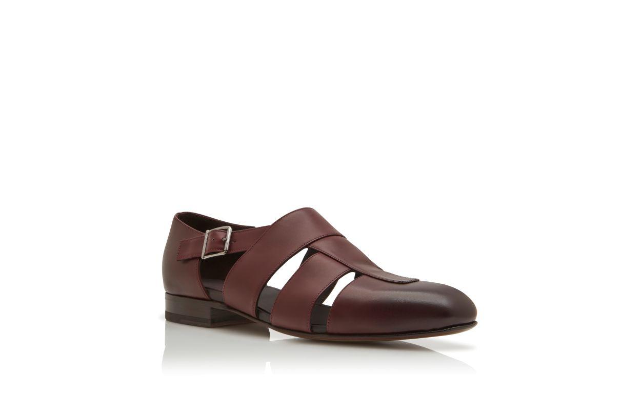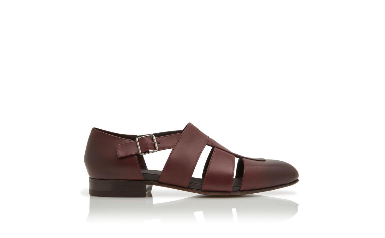 Red calf leather sandals featuring cut-out details and side buckle closure.