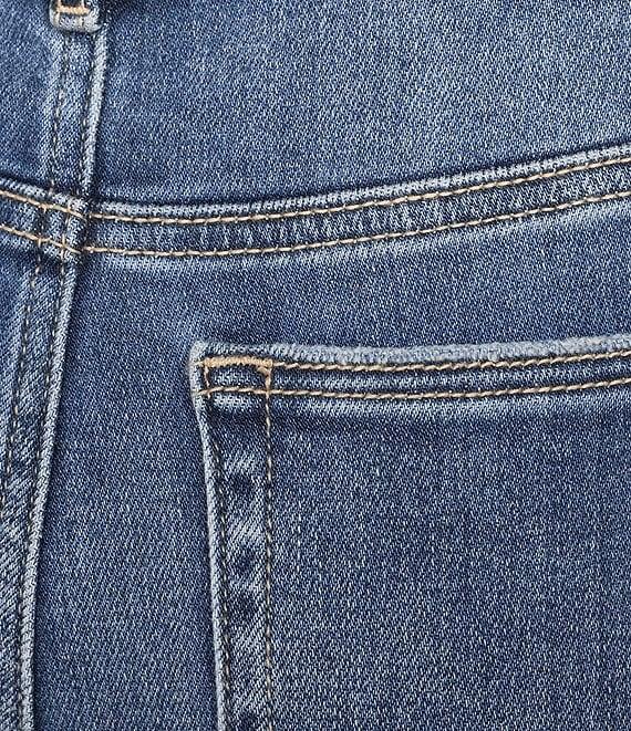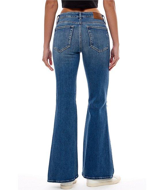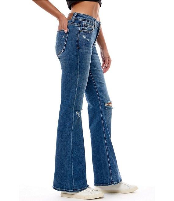 From Hidden, these jeans feature: Mid rise Flared legs Two front pockets (one with coin pocket) Two back pockets Distressed detailing Zip/button-front closure Belt loops Cotton/polyester/spandex stretch denim Machine wash/tumble dry Imported.