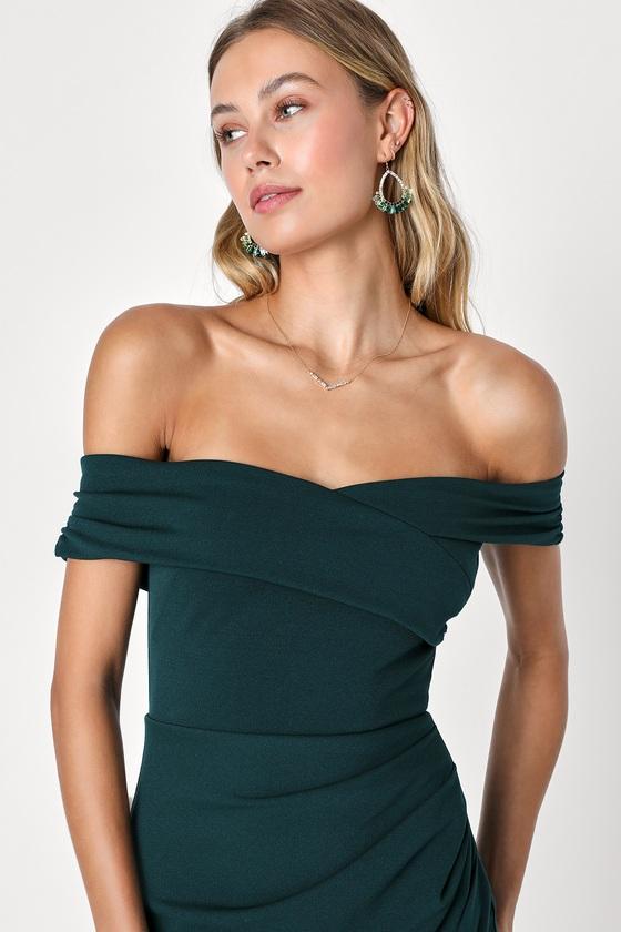 Everyone will swoon when they see you stride through the room in the Lulus High-Class Presence Emerald Green Off-the-Shoulder Maxi Dress! This incredibly elegant dress has a stretchy crepe composition that shapes an overlapping, sweetheart neckline (with hidden no-slip strips) atop an off-the-shoulder bodice framed by short, ruched sleeves. High, fitted waist boasts pleated accents before falling to an overlapping, mermaid maxi skirt with an alluring front slit. Hidden back zipper/clasp.
