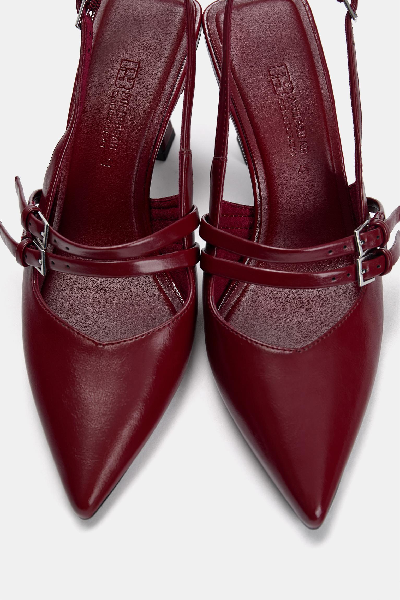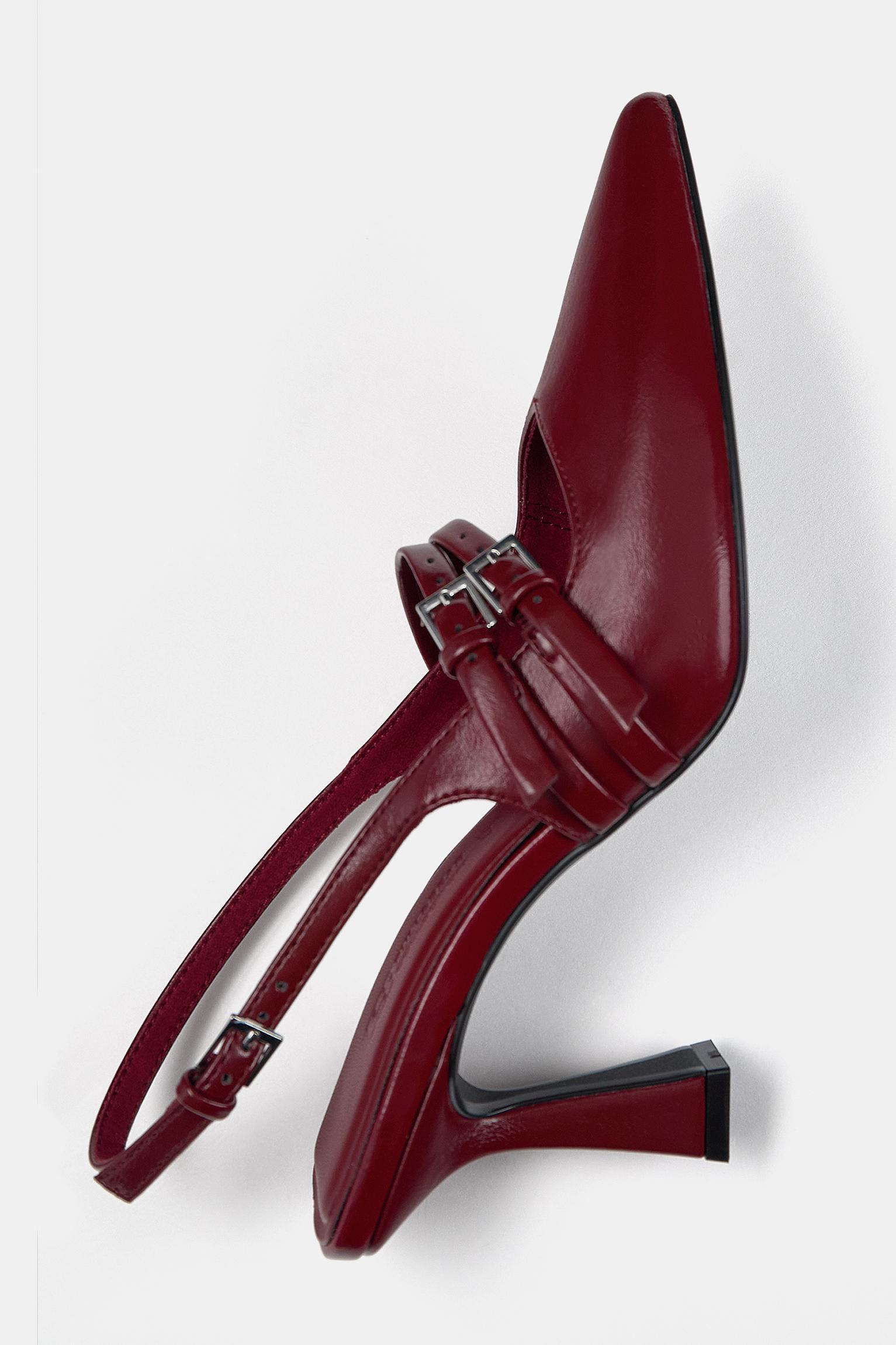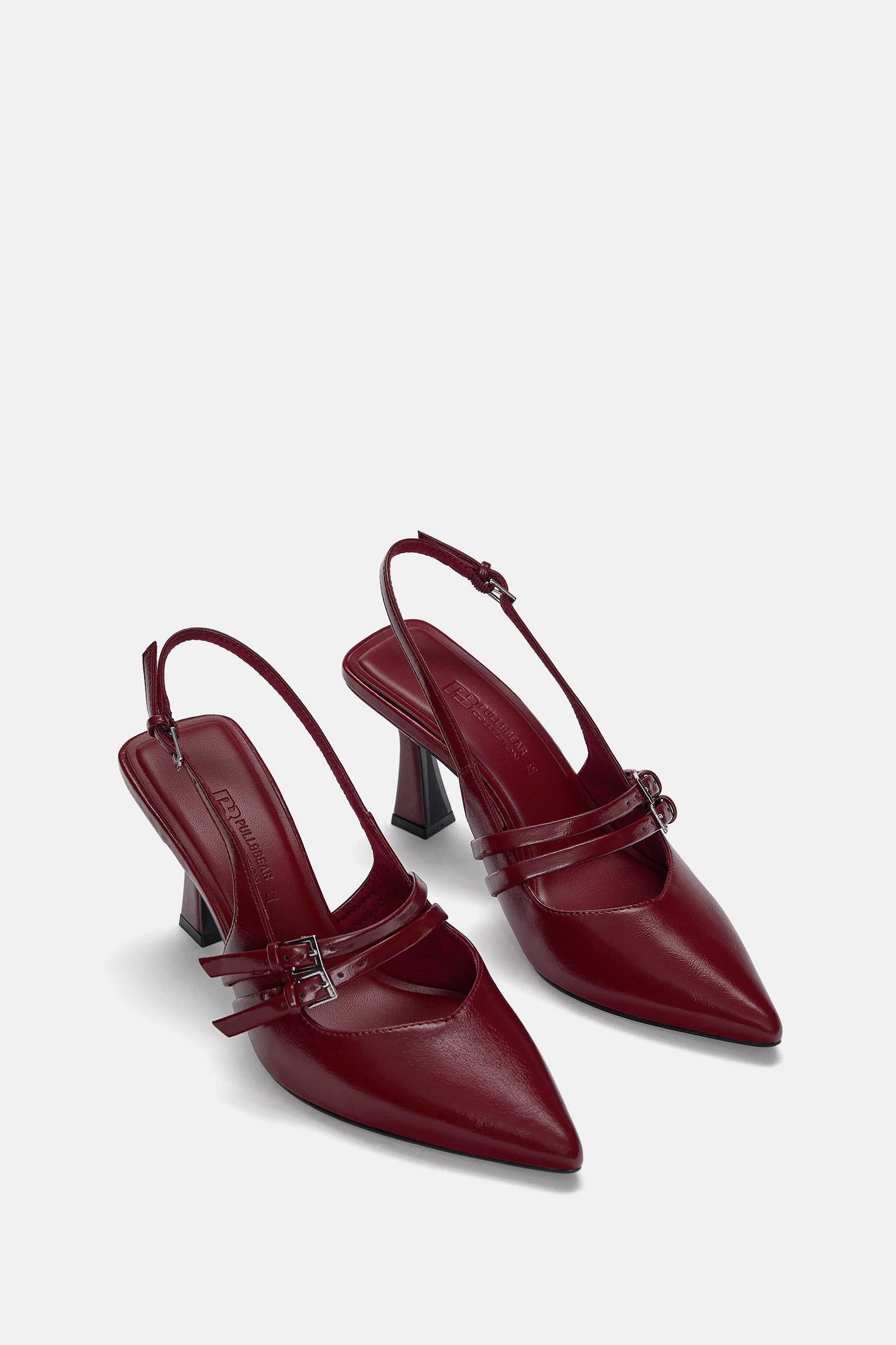 Heeled shoes available in maroon. Buckled straps on the front. Pointed toe. Heel height: 8 cm.